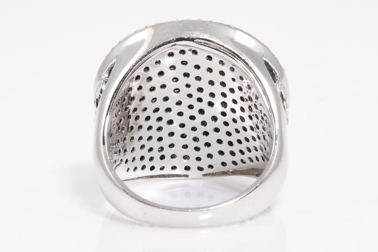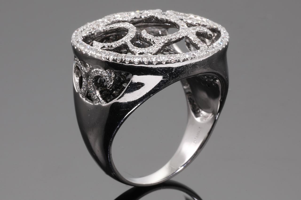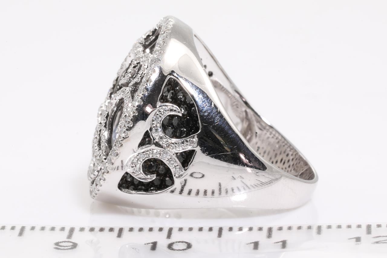 Diamond ring with round black and white Diamonds totalling 2.05cts (Estimated grading for white Diamonds: H-I SI) - Black Diamonds may be treated. 18ct white gold with black rhodiun plated. Ring size: N - ring resizing is not recommended. Weight: 11.9g. (Pre-owned)