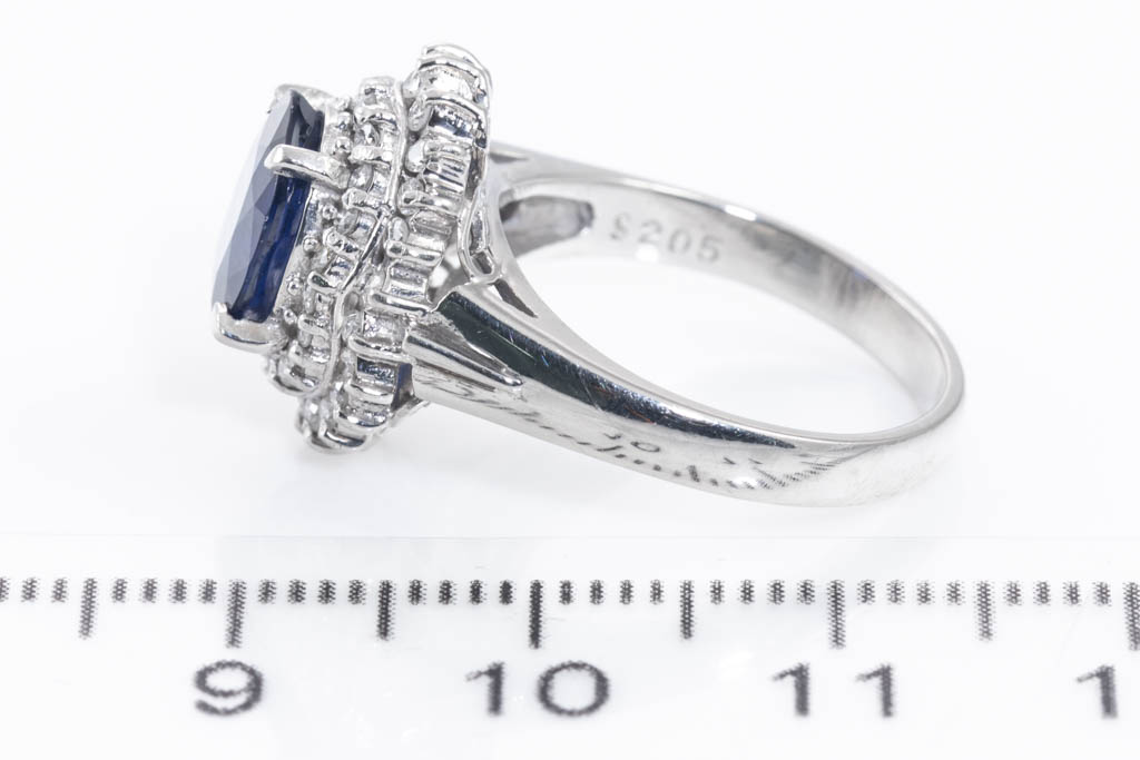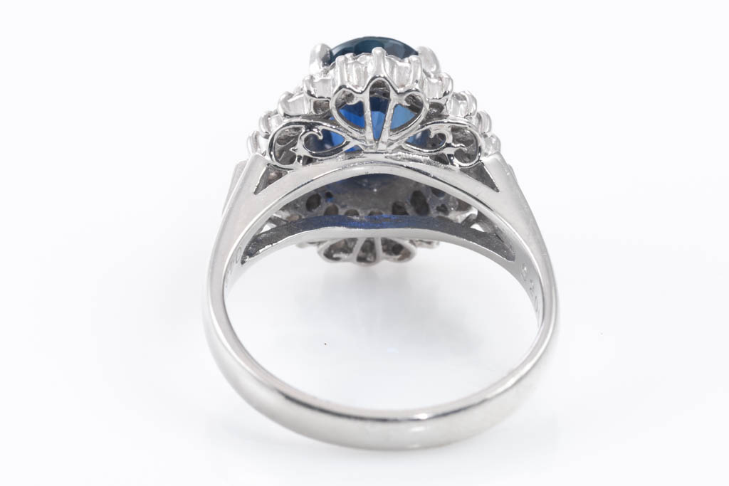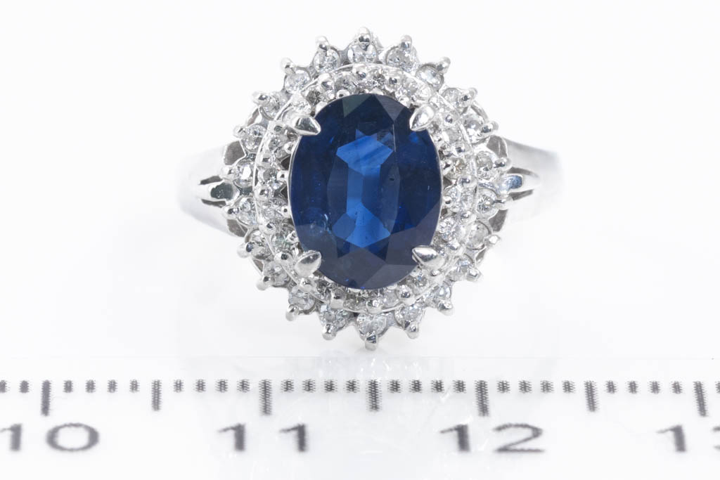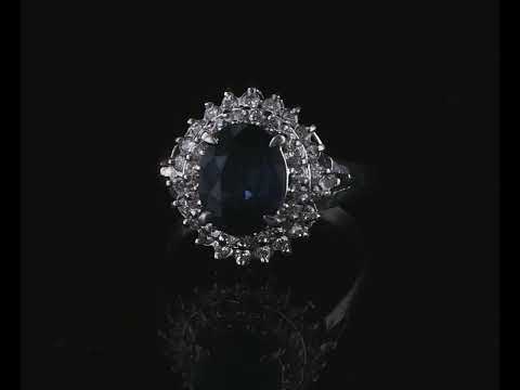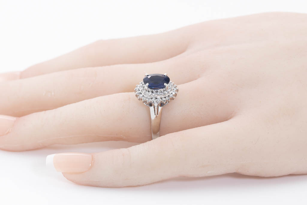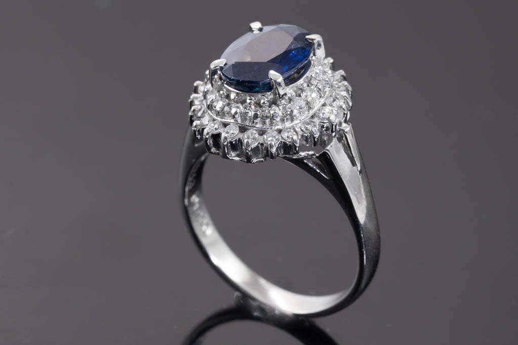 Sapphire and Diamond ring with an oval shape Blue Sapphire of 2.05ct and Diamonds totalling 0.43cts (Estimated grading: G-H SI-P1). Platinum. Ring size K. Weight: 8.0g. (Pre-owned)