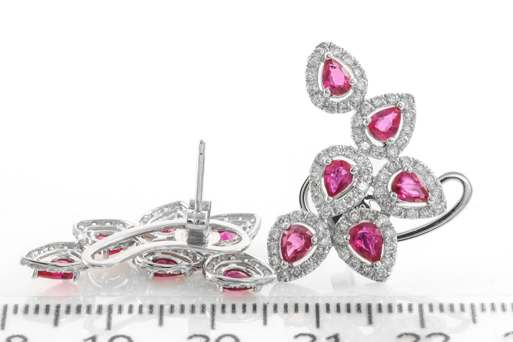 Ruby and Diamond earrings with 12 pear shape Rubies totalling approximately 2.05cts and round Diamonds totaling approximately 0.60cts (K-L P1). 18ct white gold with 18ct white gold backs. Weight: 4.3g. (Pre-owned)