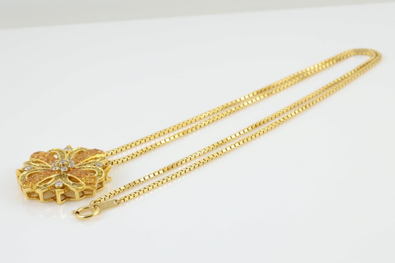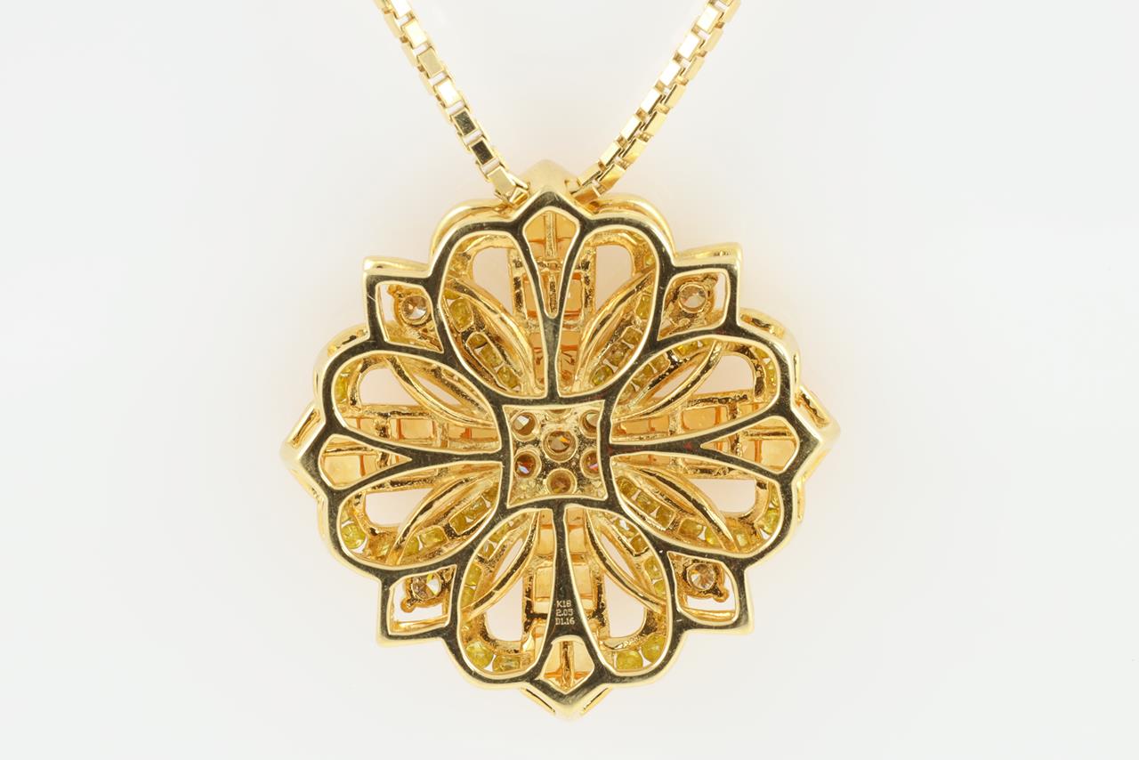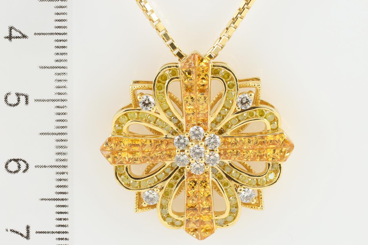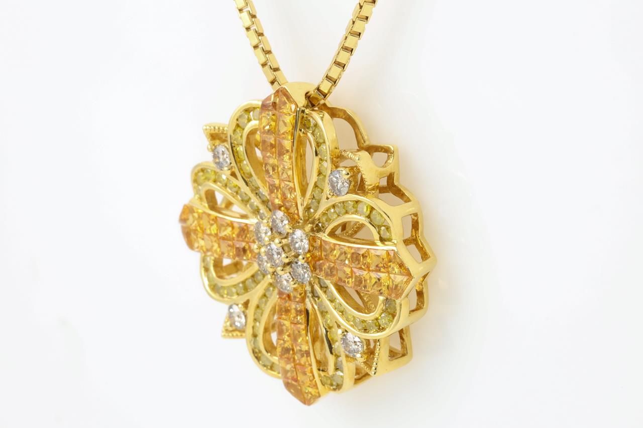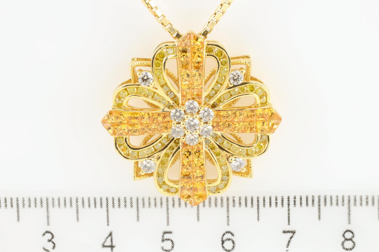 Sapphire and Diamond pendant with princess cut golden Sapphires totalling 2.05cts and round Diamonds totalling 1.16cts (Estimated grading: J-K SI, Yellow P1). 18ct yellow gold with 18ct gold gold 50cm chain. Weight: 17.9g (Pre-owned)