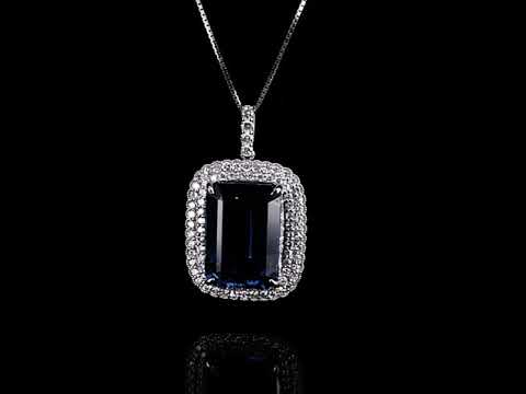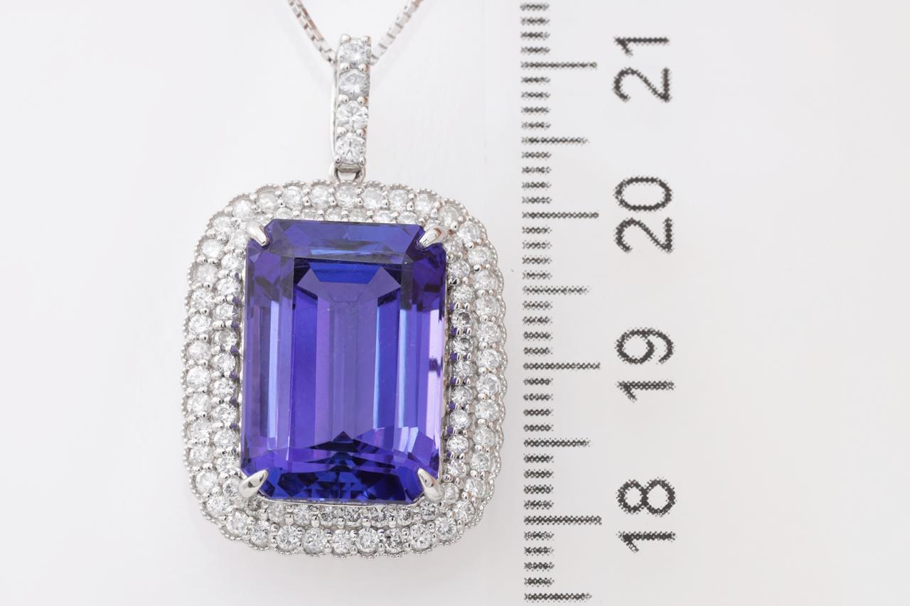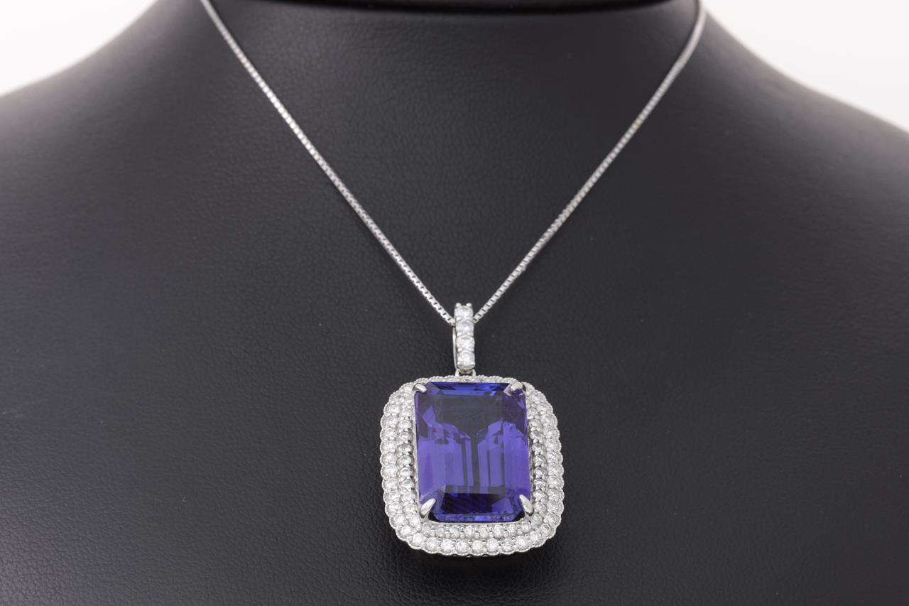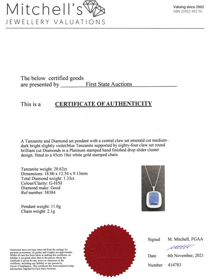 Tanzanite and Diamond pendant with an emerald cut Tanzanite of 20.62ct and Diamonds totalling 1.33cts (Estimated grading: G-H SI). Platinum with 18ct white gold 45cm adjustable chain. Weight: 13.1g. With certificate #414783. (Pre-owned)
