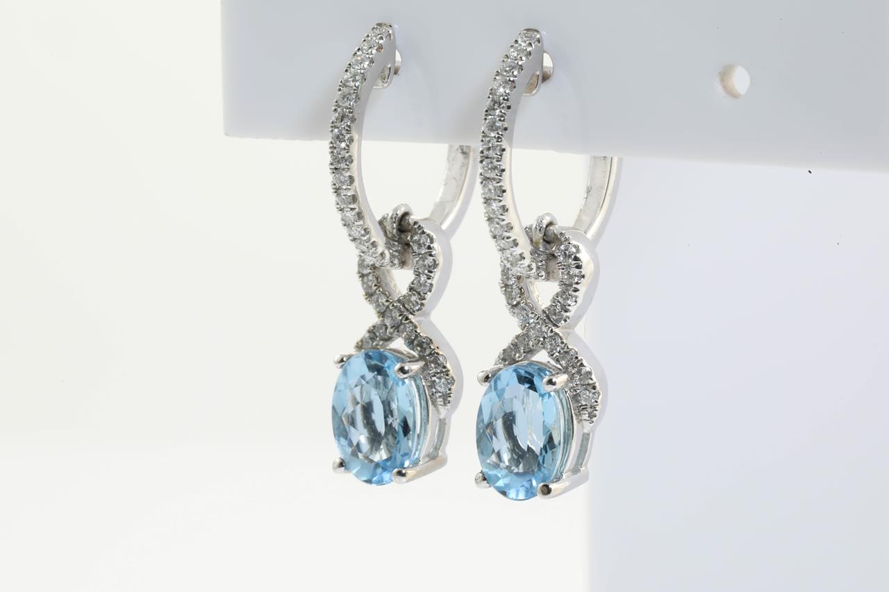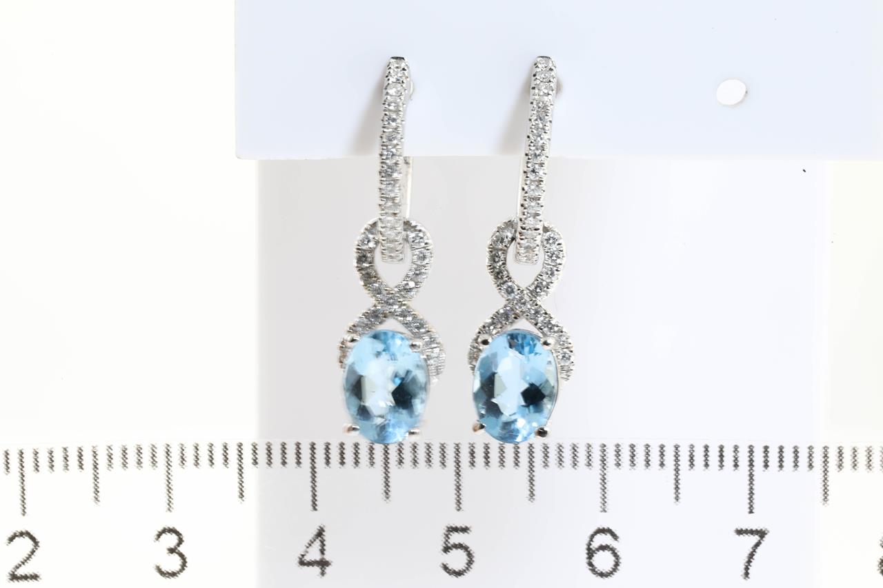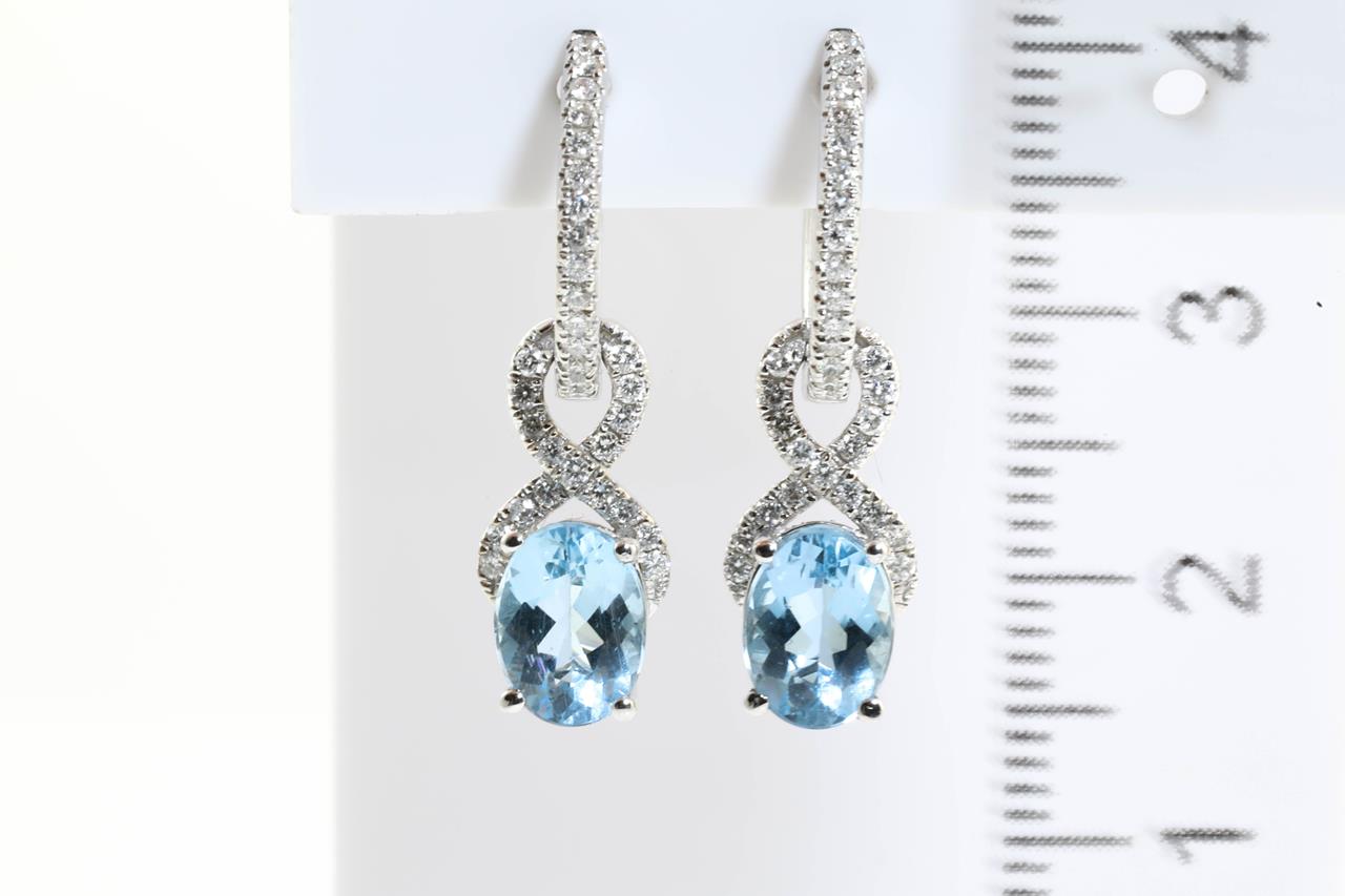 Aquamarine and Diamond earrings with oval Aquamarine totalling 2.06cts and Diamonds totalling 0.40cts (Estimated grading: G-H SI). 14ct white gold. Weight: 5.1g. (As new)