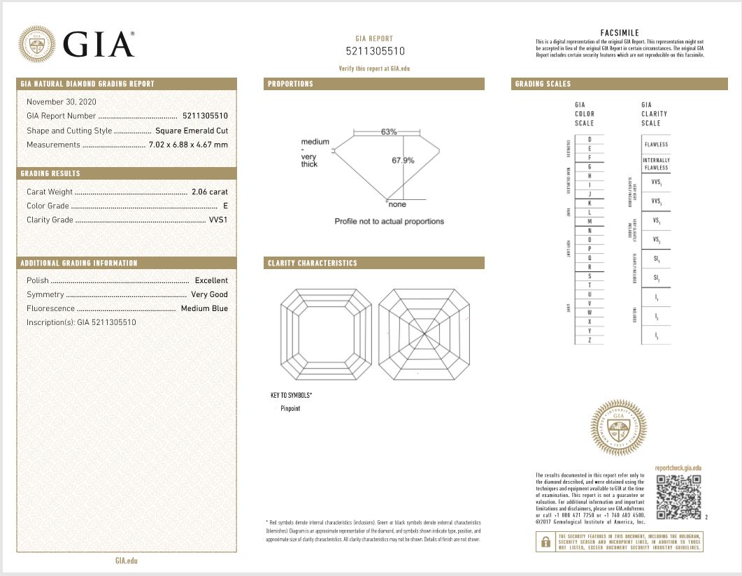 A loose Square Emerald Cut Diamond of 2.06ct (with GIA report graded as E VVS1 #5211305510). (New)