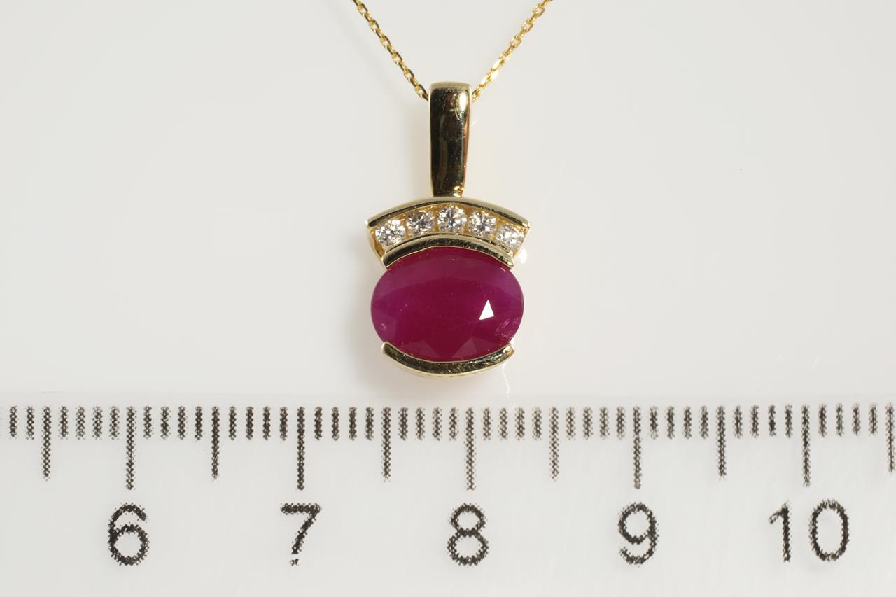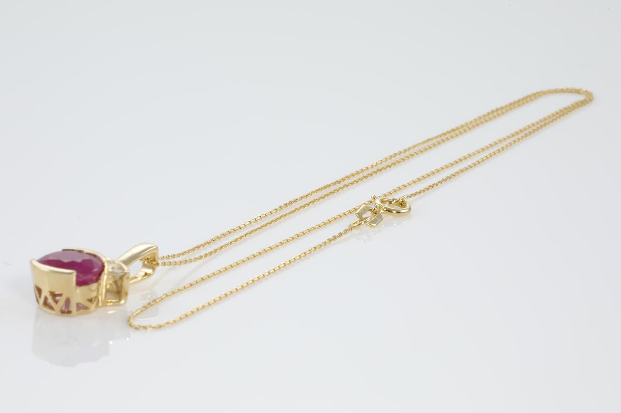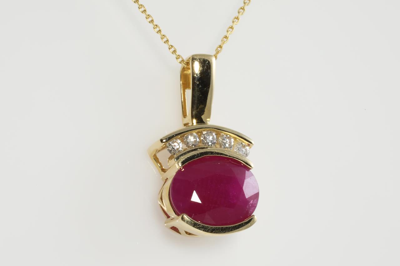 Ruby and Diamond pendant with oval shape Ruby of 2.06ct and Diamonds totalling 0.10cts. 14ct yellow gold with 14ct gold 45cm chain. Weight: 3.2g (As New)