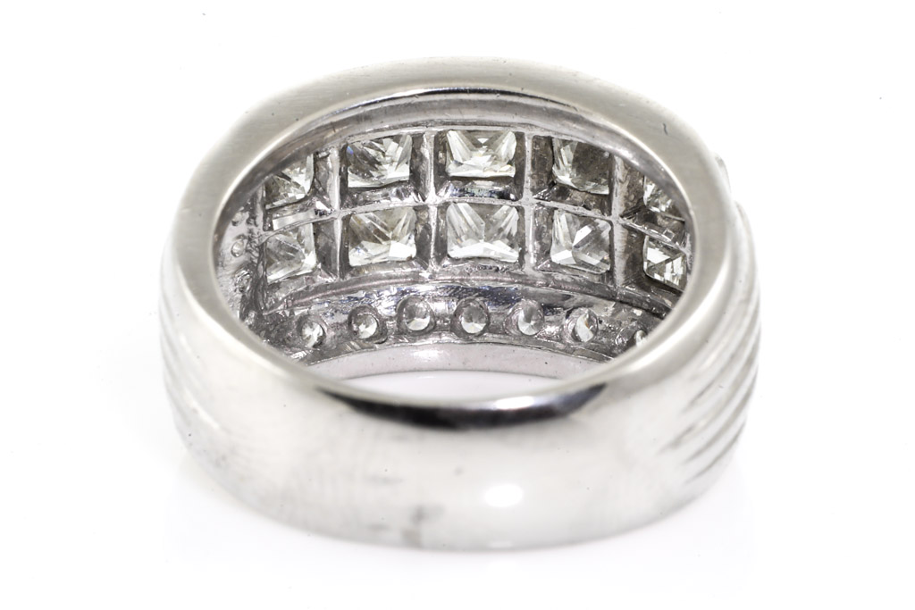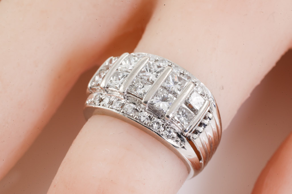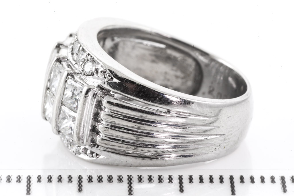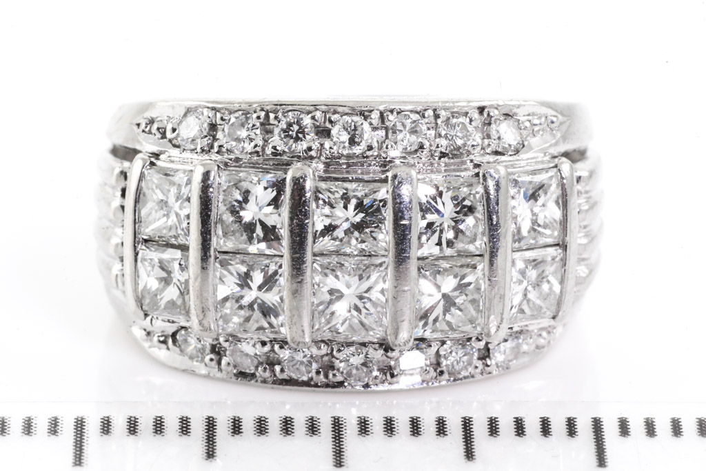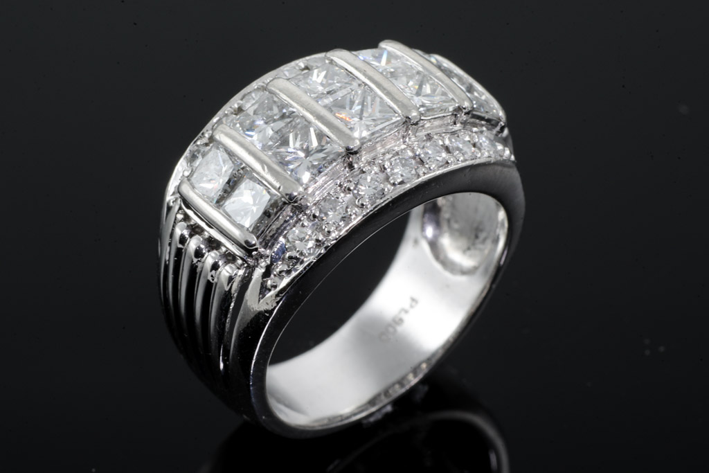Diamond dress ring with princess cut and round Diamonds totalling 2.06cts (Estimated grading: H SI). Platinum - 900. Ring size I1/2. Weight: 11.3g. (Pre-owned)