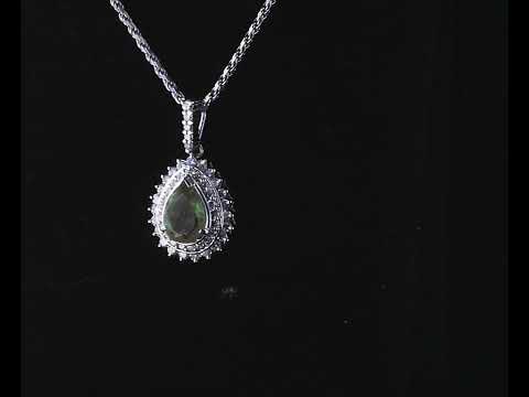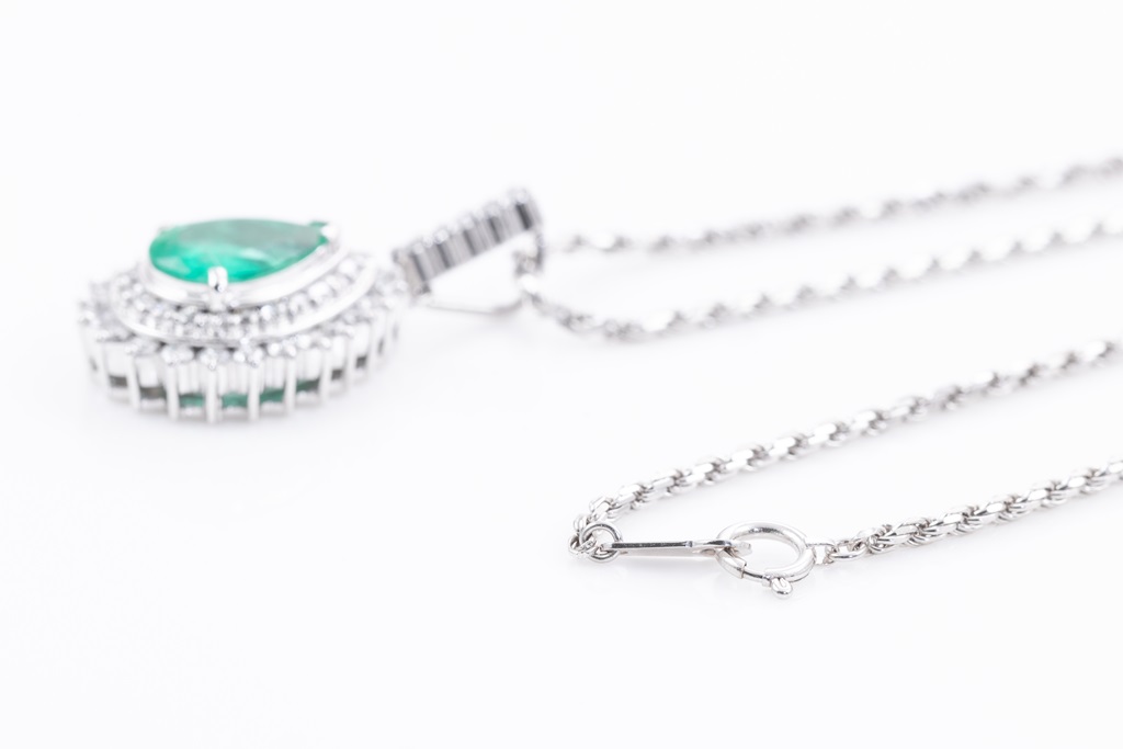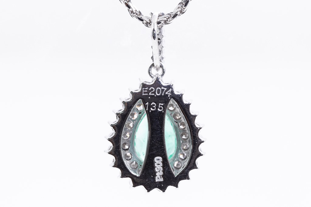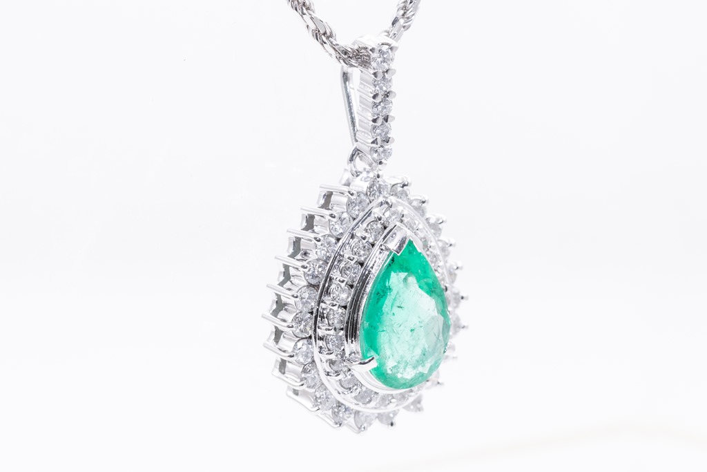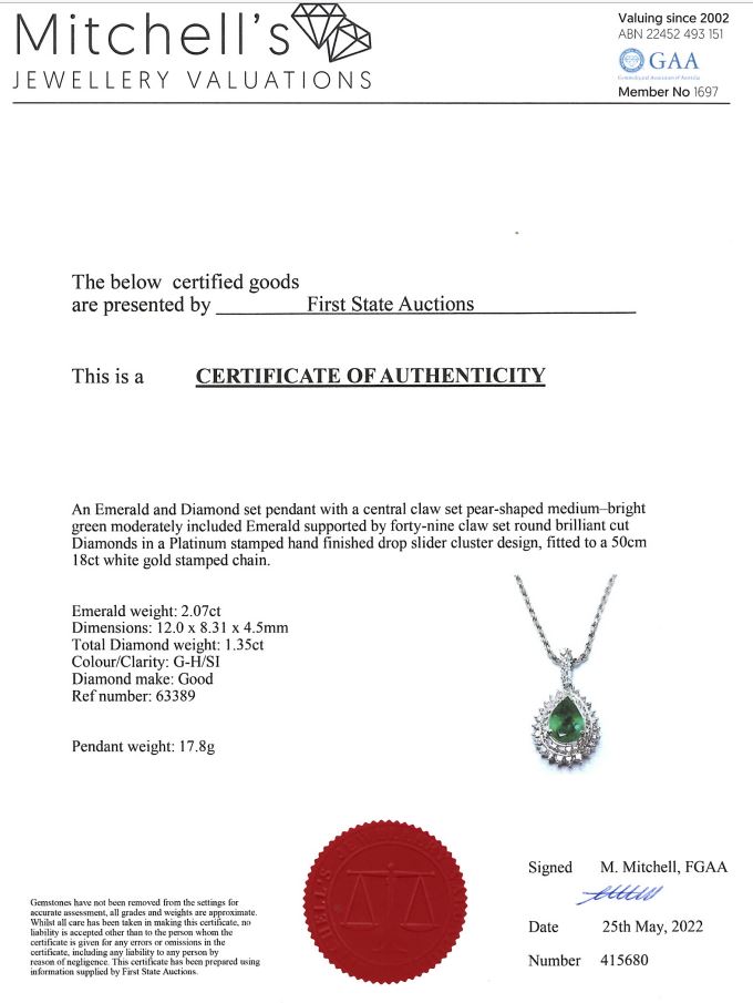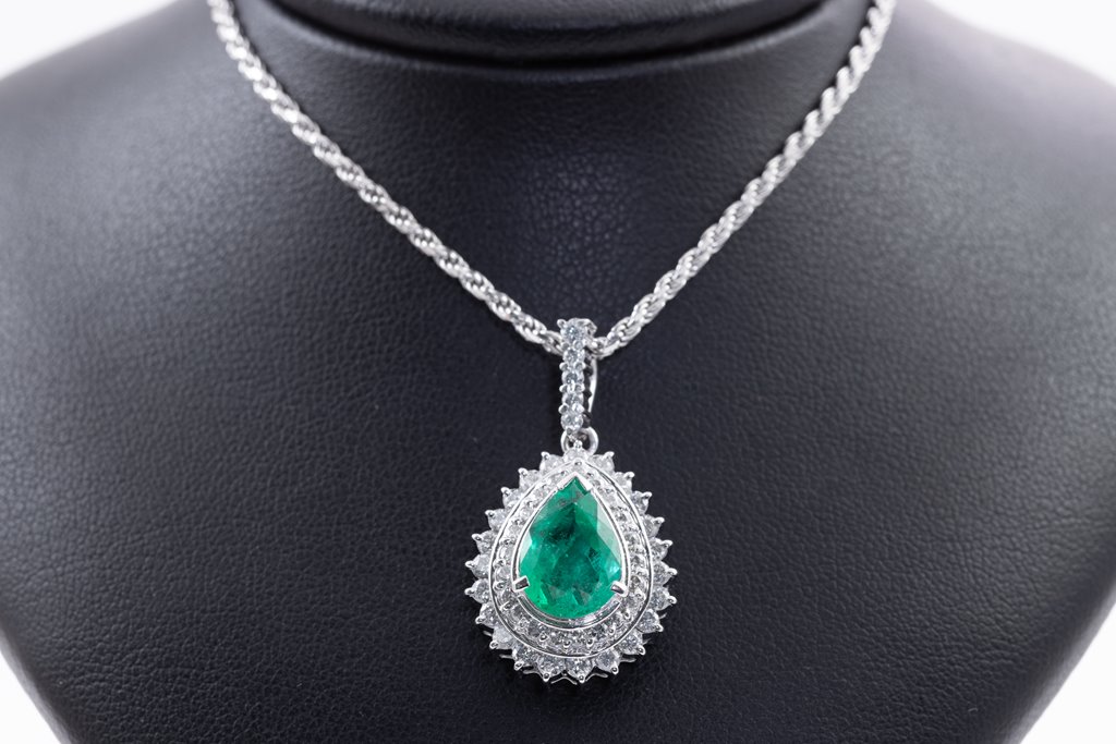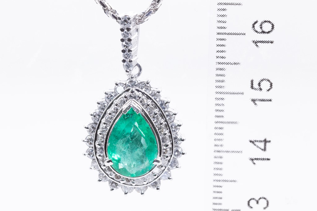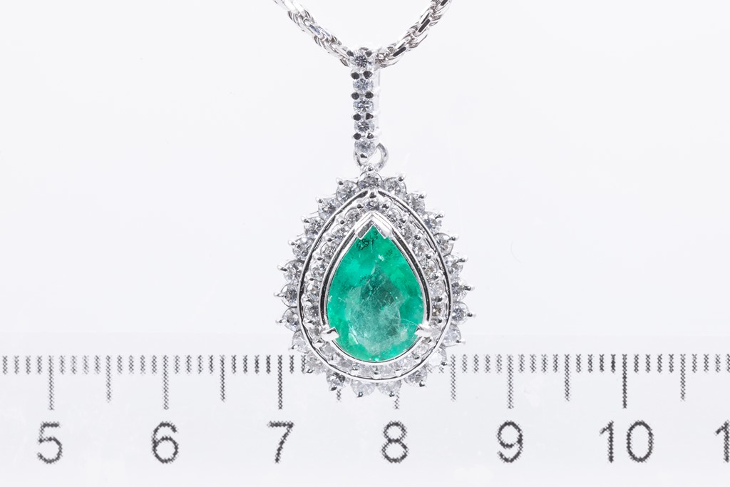 Emerald and Diamond Pendant with a pear shape Emerald of 2.07ct and round Diamond totalling 1.35cts (Estimated grading: G-H SI). Platinum with 18ct white gold 50cm chain. Weight: 17.8g. With certificate #415680. (Pre-owned)