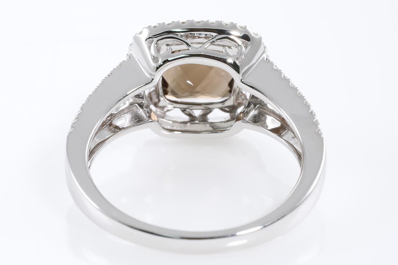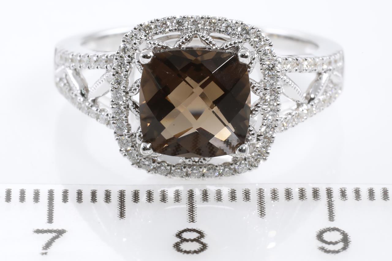 Quartz and Diamond ring with a cushion checkerboard cut Smokey Quartz of 2.07ct and Diamonds totalling 0.33cts (Estimated grading: H SI). 14ct white gold. Ring size N1/2. Weight: 4.6g (New)