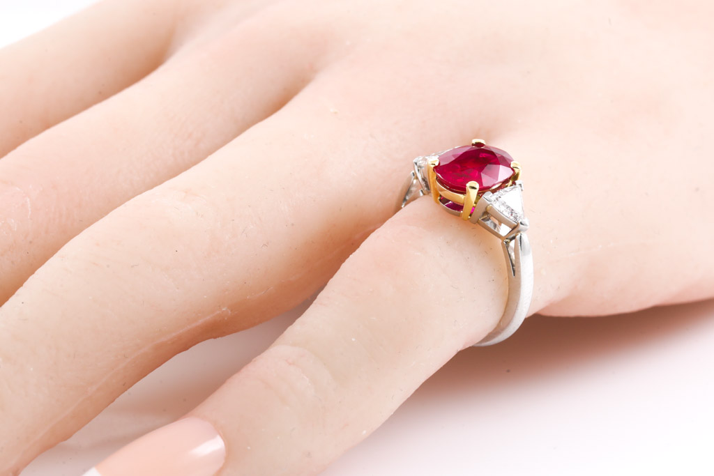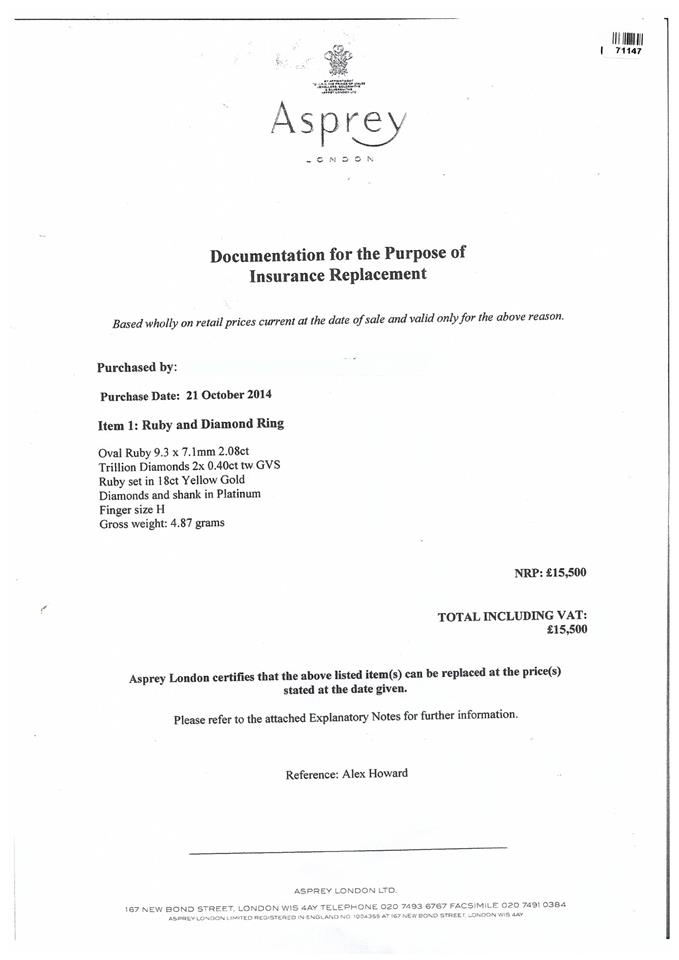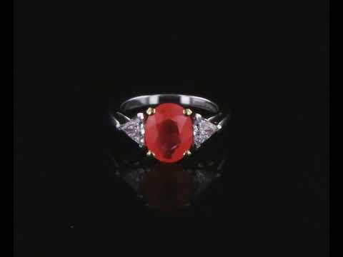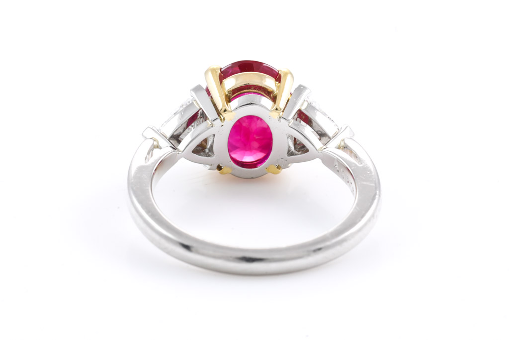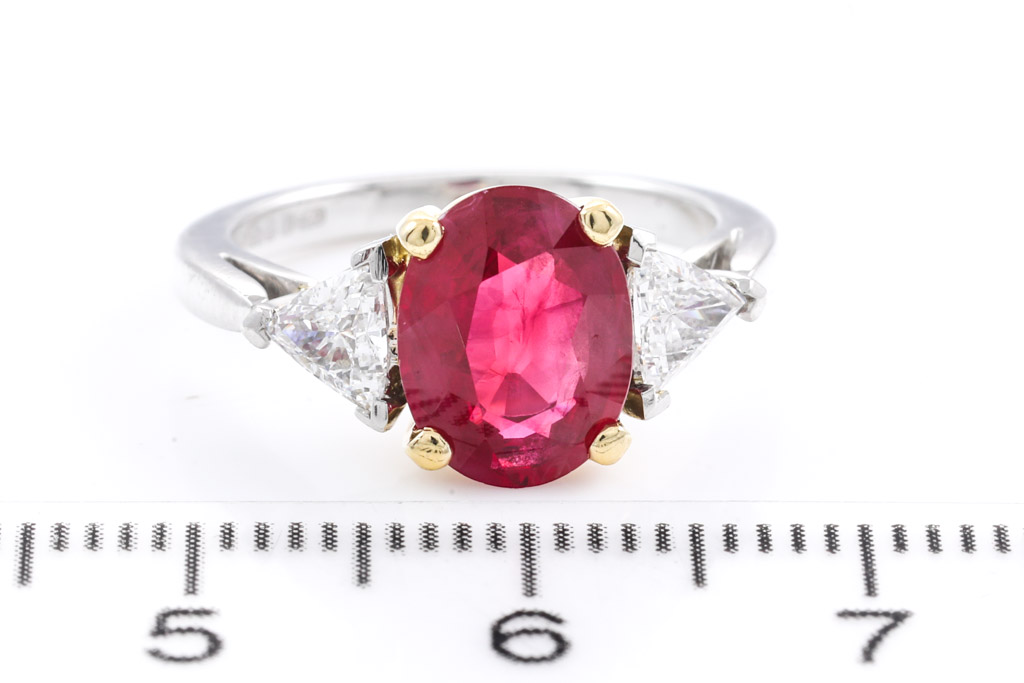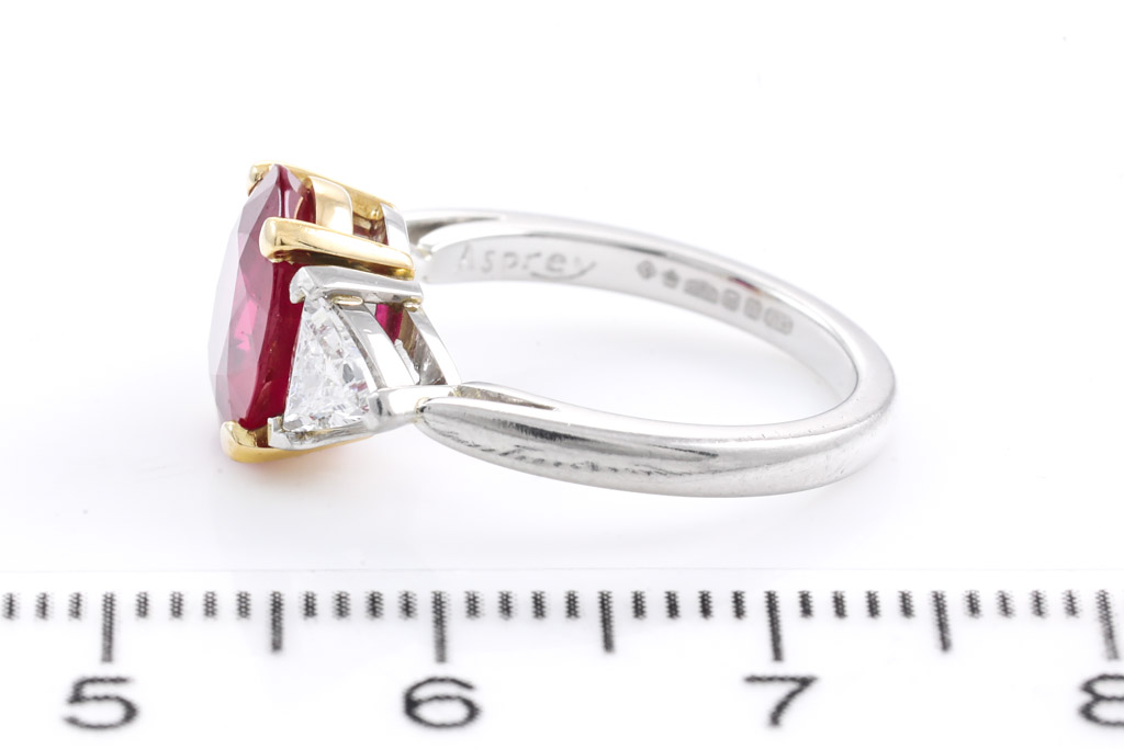 Asprey Ruby and Diamond ring with oval Ruby of 2.08ct and trillion Diamonds totalling 0.80cts (Estimated grading: G VS). 18ct yellow gold and platinum. Ring size: H. Weight: 4.8g. With copy of Asprey Valuation Certificate. With Asprey Box. (Pre-owned)