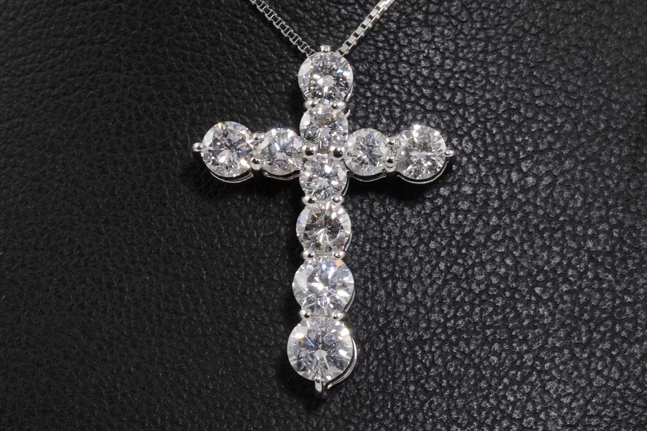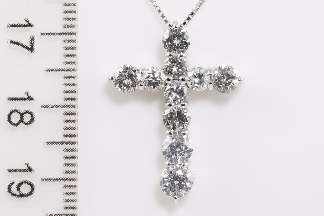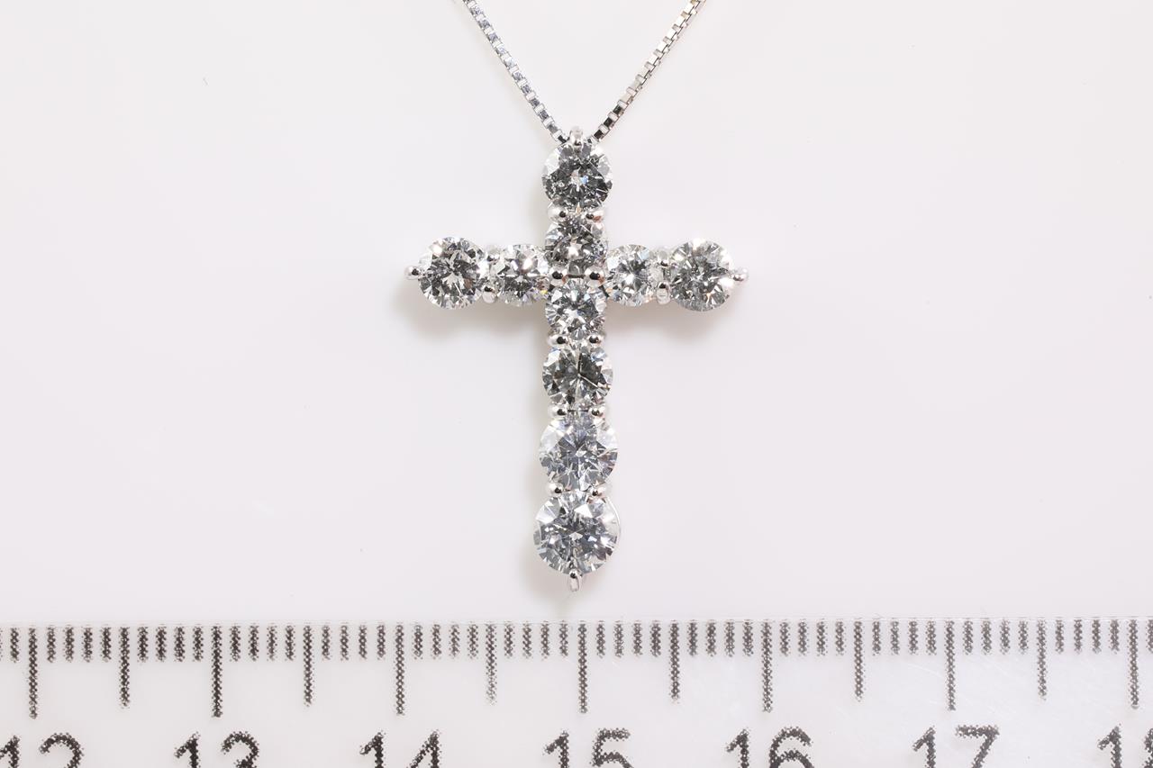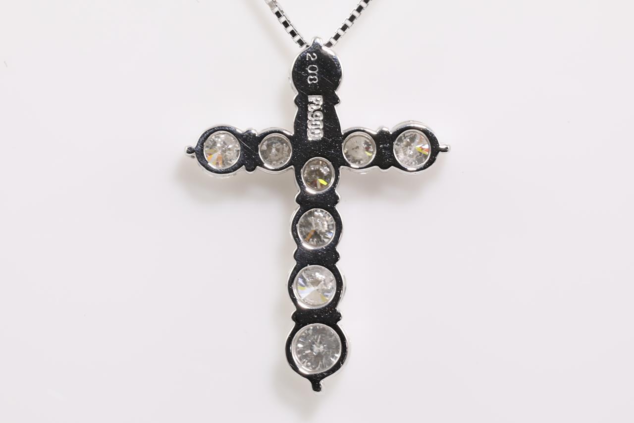Diamond cross pendant with round Diamonds totalling 2.08cts (Estimated grading: G-H P1). Platinum with 18ct white gold adjustable 44cm chain. Weight: 5.6g g. (Pre-owned)