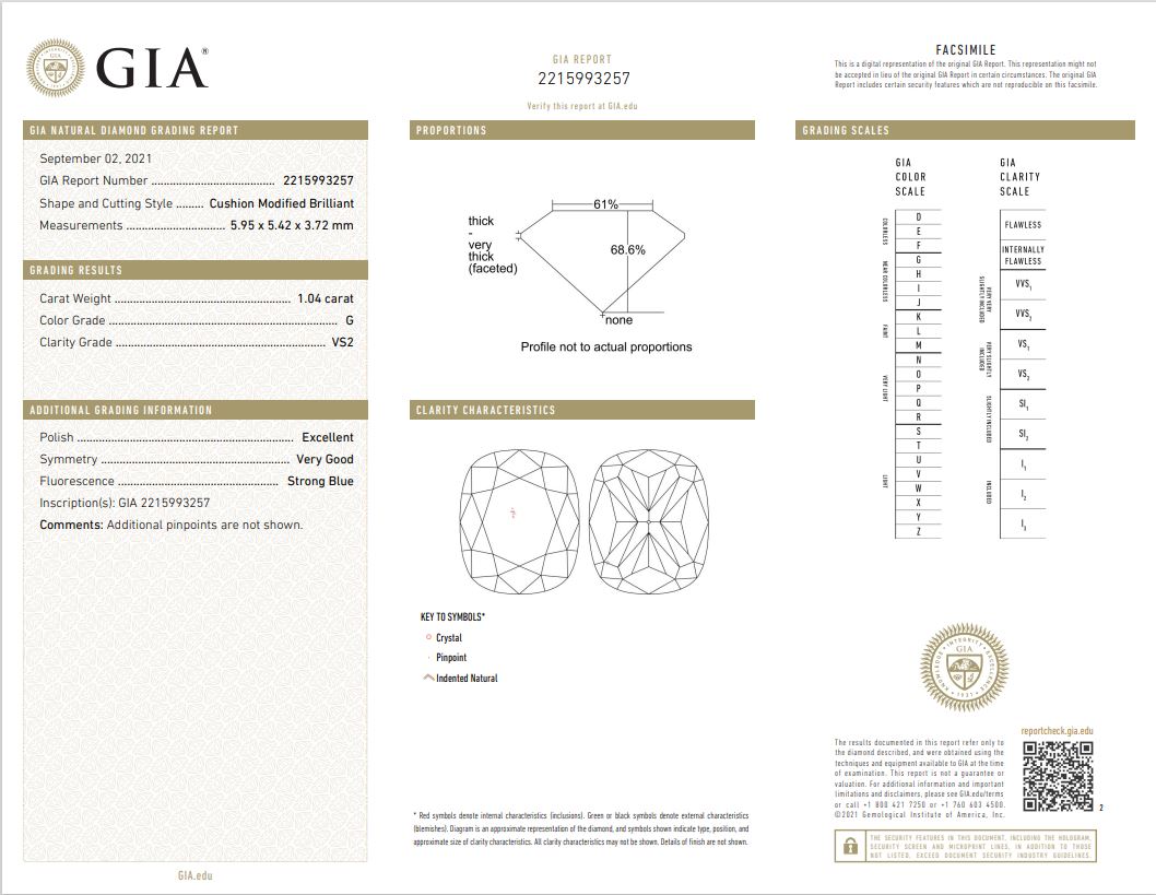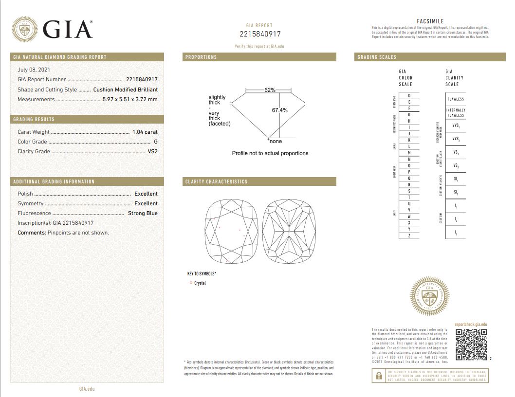 A loose pair of cushion cut Diamonds totalling 2.08cts (Both with GIA reports graded as G VS2 #2215993257, 2215840917). (New)