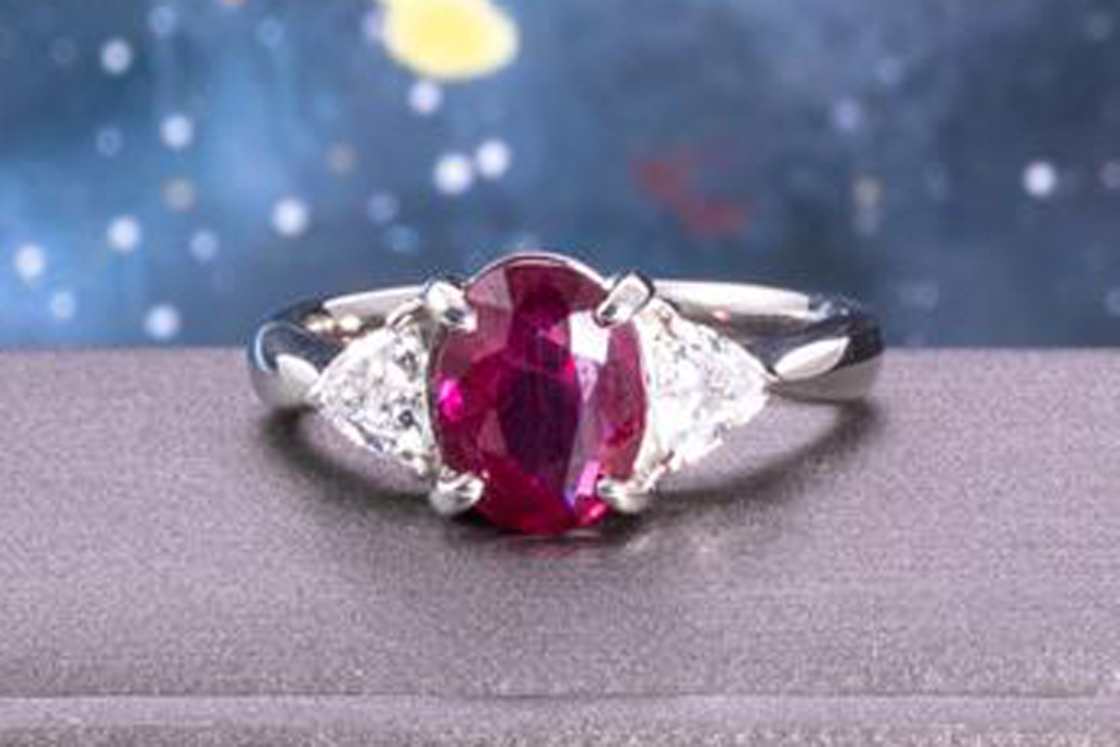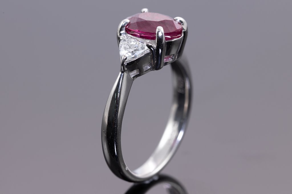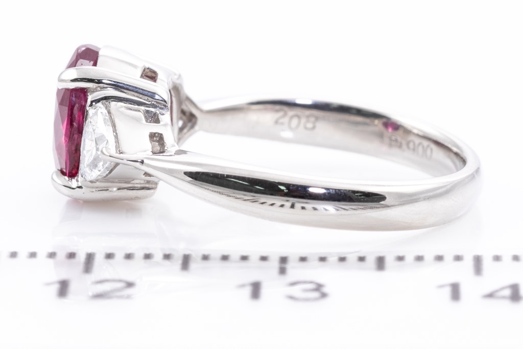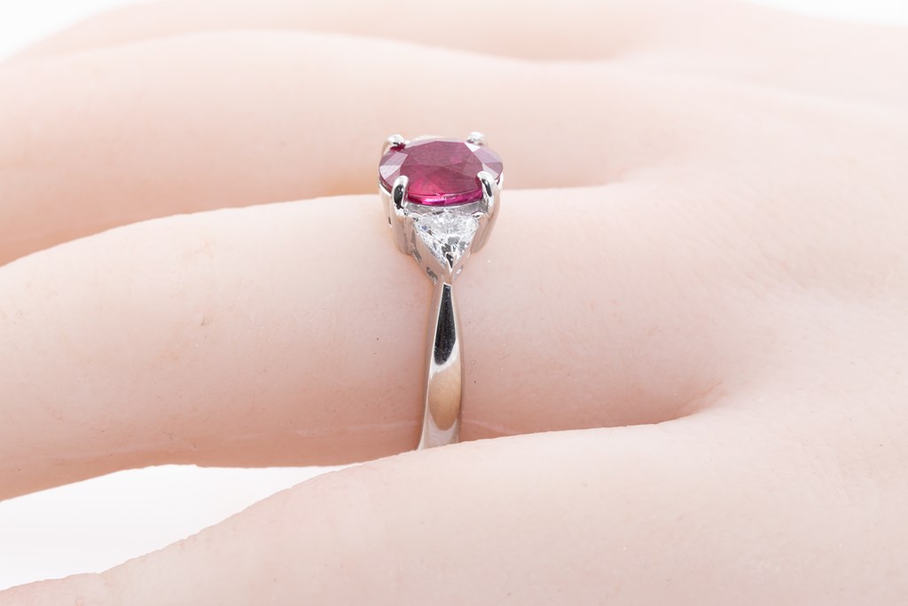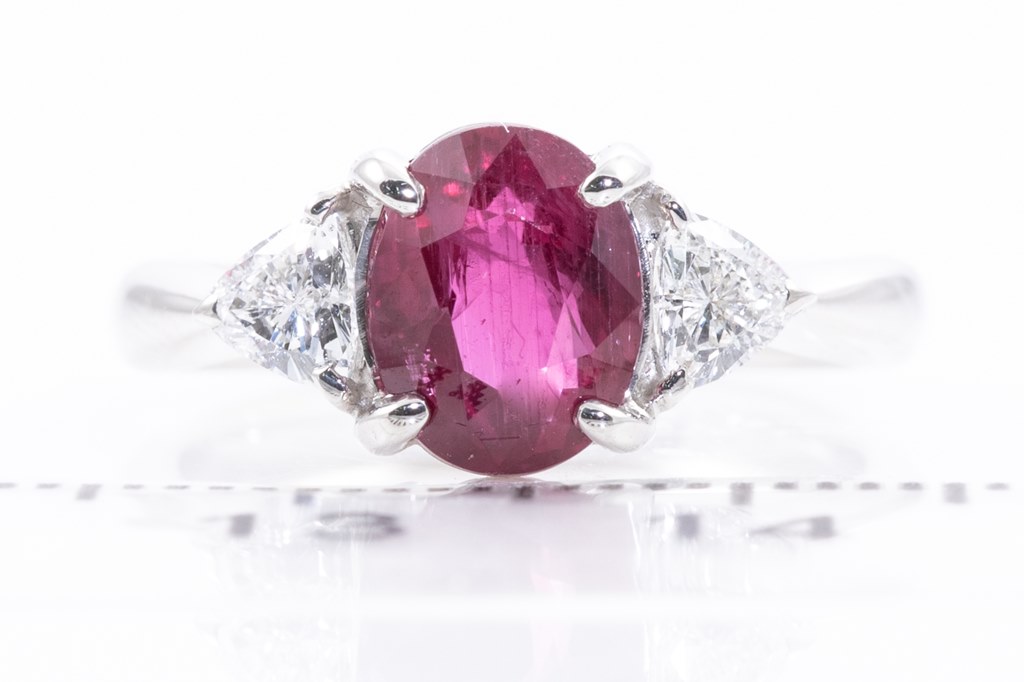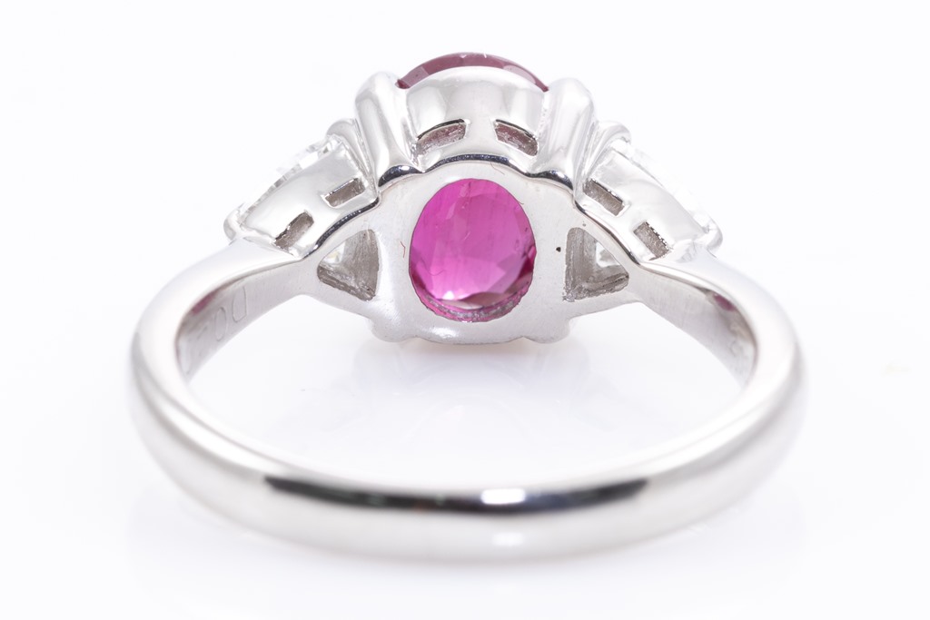 Ruby and Diamond ring with oval purplish red Thai Ruby of 2.08ct (with GIA report #7412154099) and 2 trilliant cut Diamonds totalling 0.46cts (Estimated grading: G-H SI). Platinum. Ring size J. Weight: 6g. (Pre-owned)