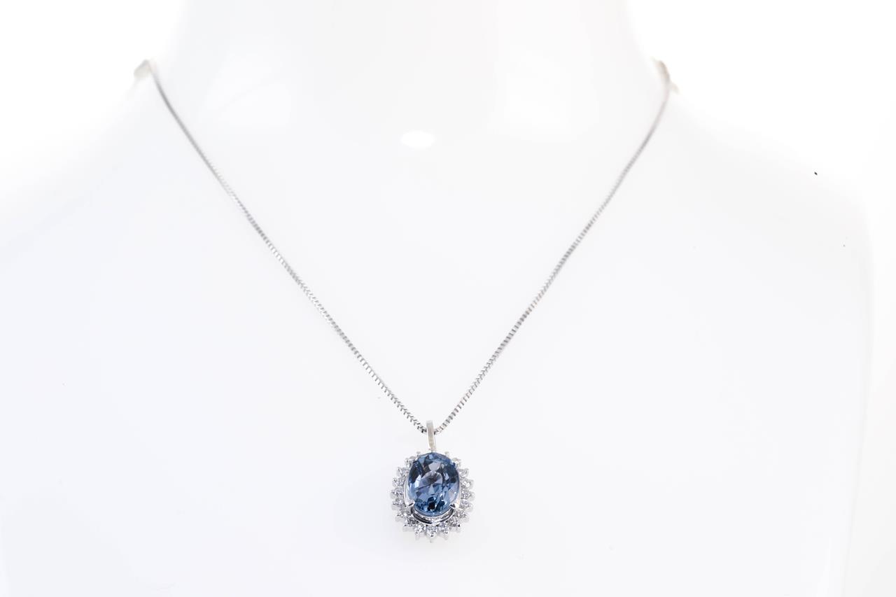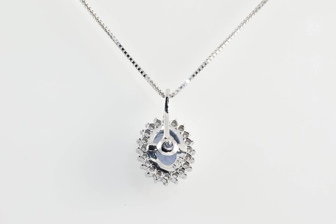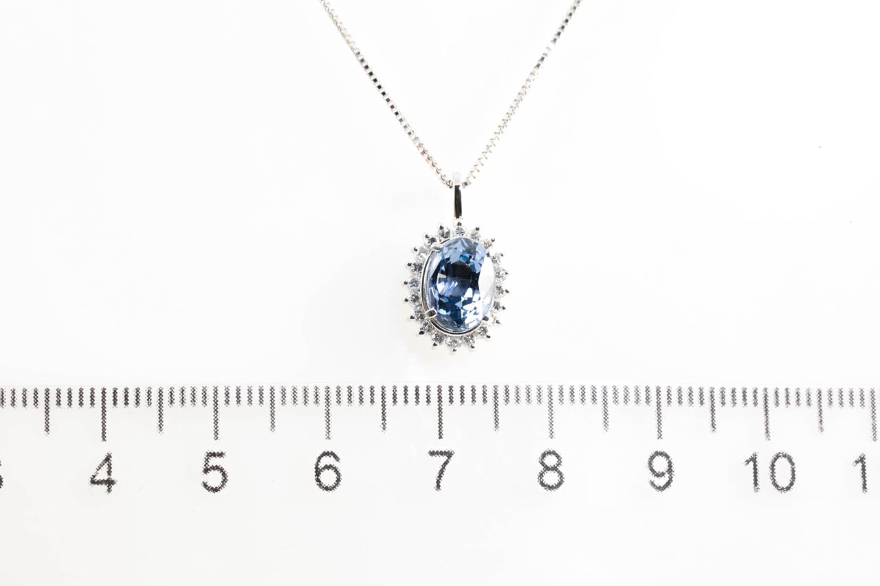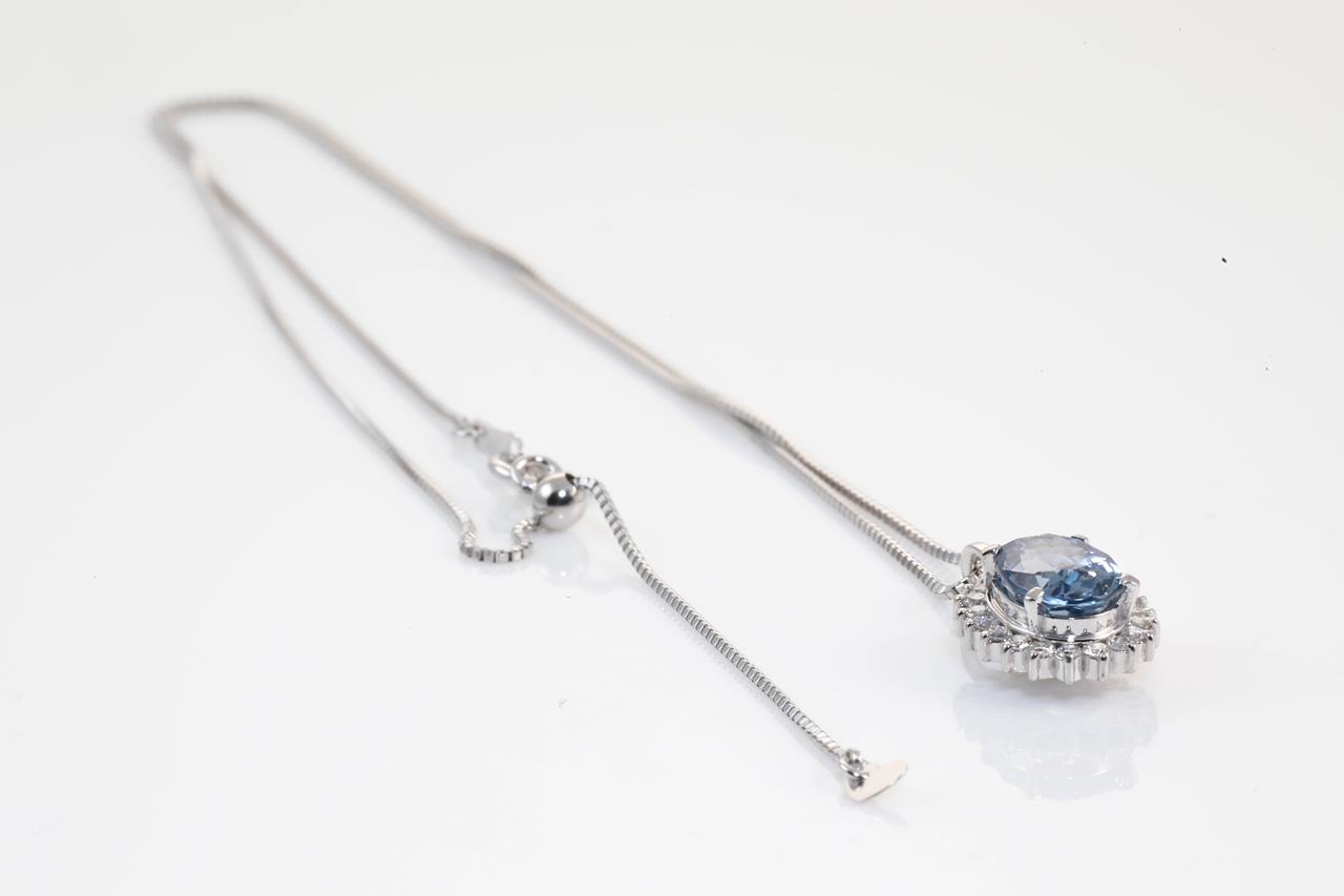Sapphire and Diamond pendant with an oval blue Sapphire of approximately 2.08ct and Diamonds totalling 0.23cts. Platinum with adjustable 45cm chain. Weight: 4.2g. (Pre-owned)