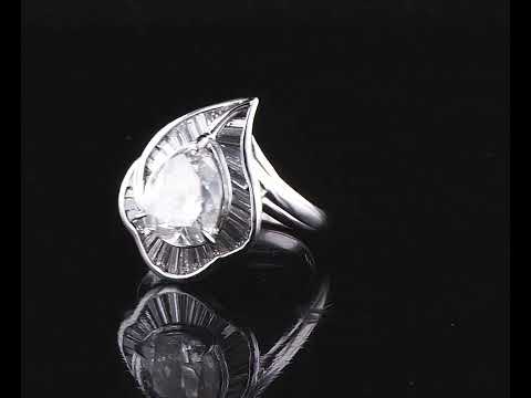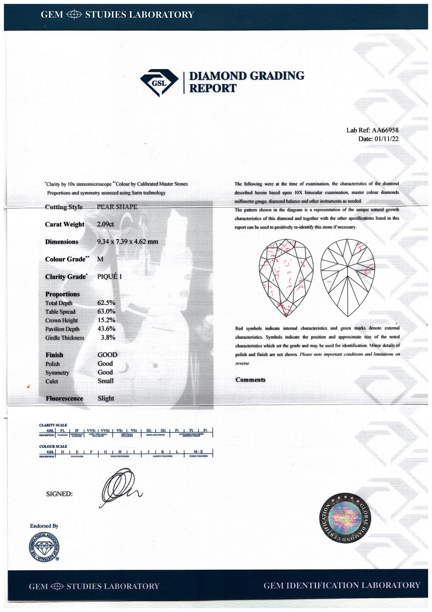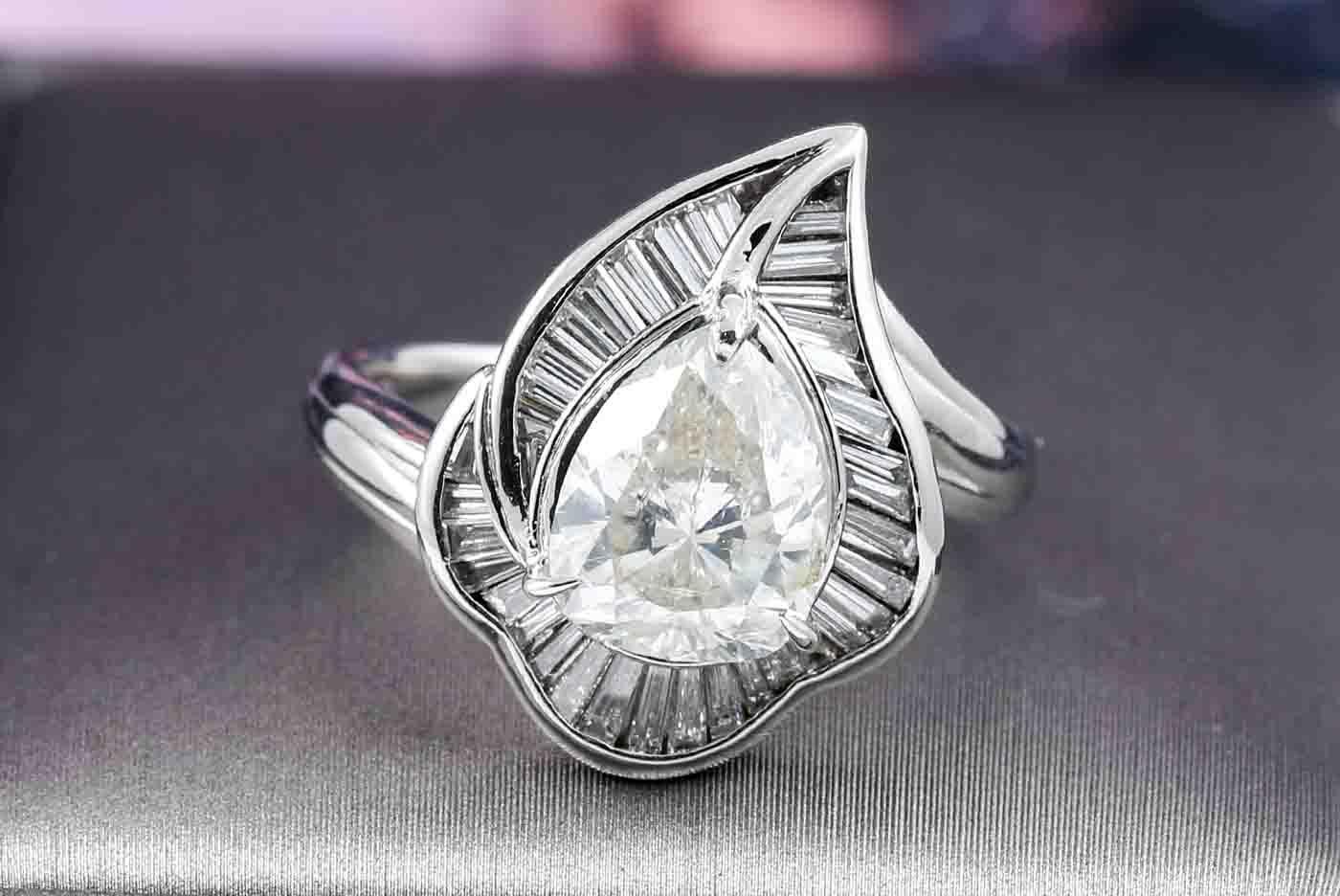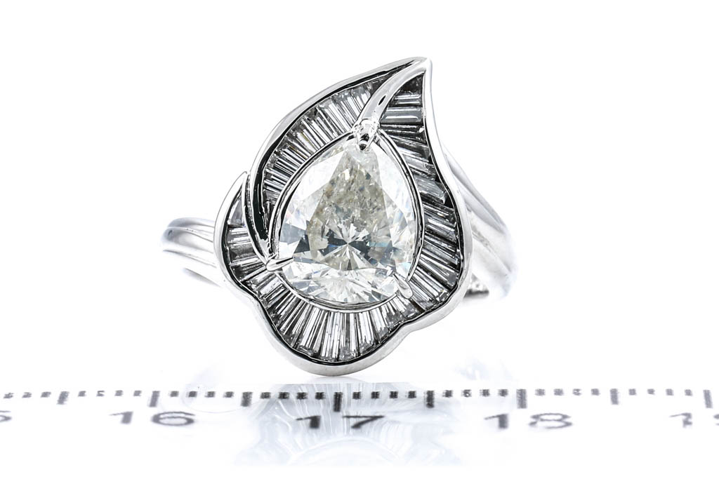 Diamond dress ring with pear shape Diamond of 2.09ct (with GSL graded as: M P1 #AA66958) and baguette cut Diamonds of 0.64cts (Estimated grading: I-J SI). Platinum. Ring size M. Weight:8.8g. (Pre-owned)