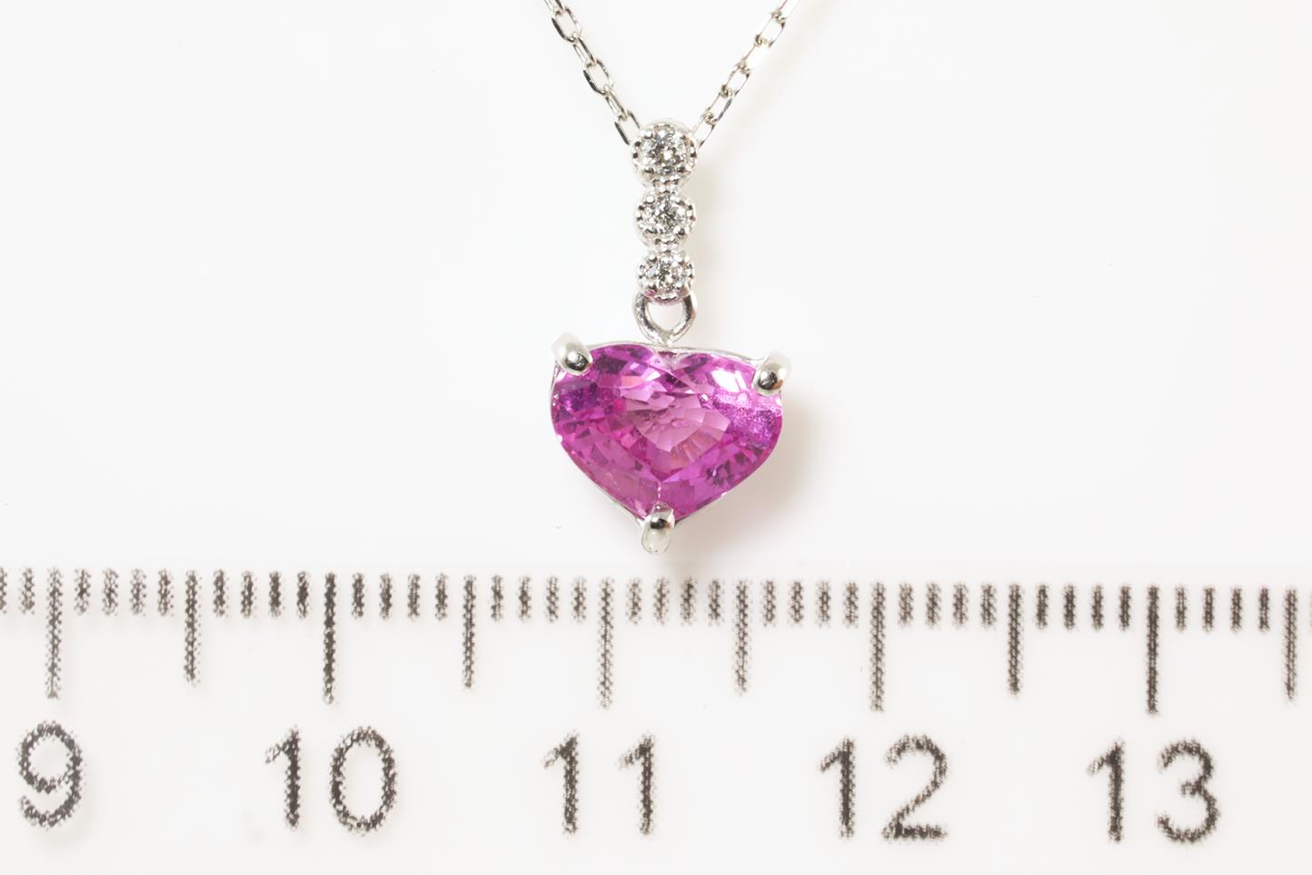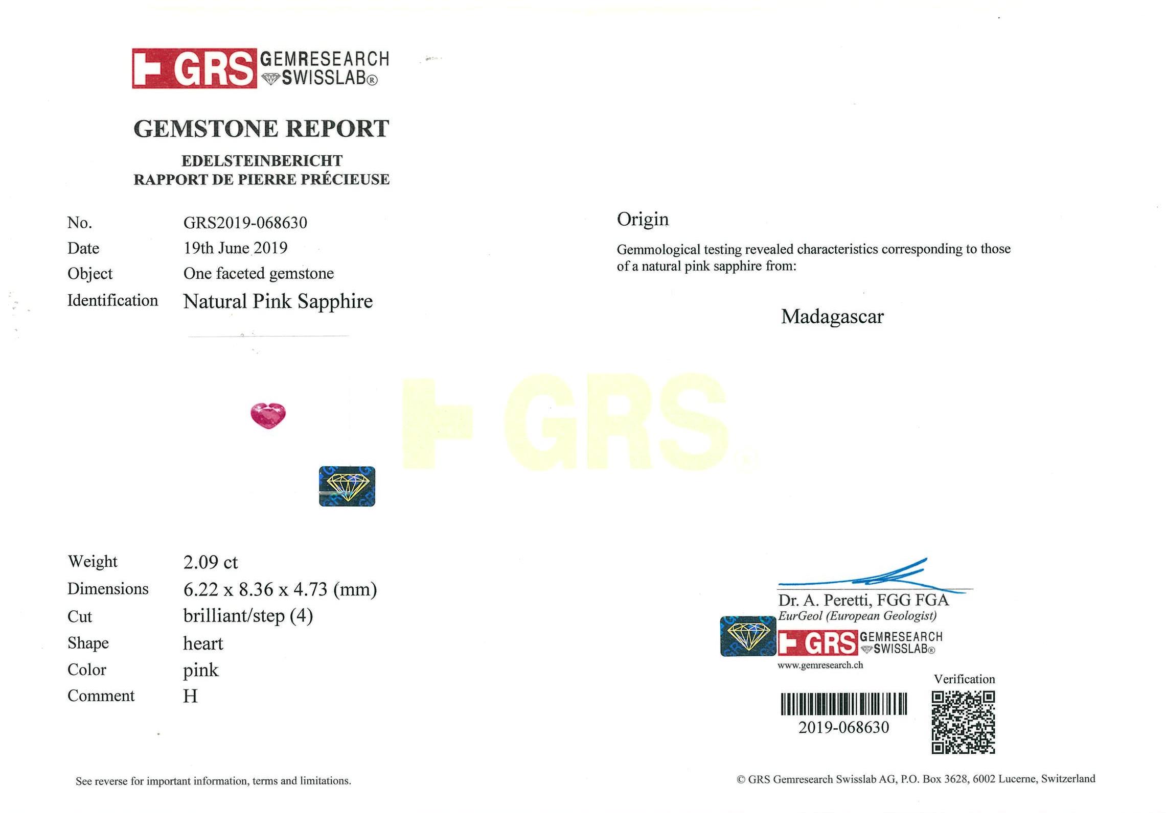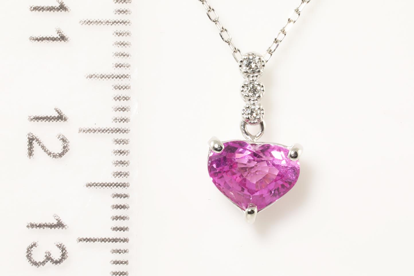 Sapphire and Diamond pendant with heart shape Pink Sapphire of 2.09ct (with GRS report #GRS2019-068630) and Diamonds totalling 0.03cts. Platinum with platinum 45cm adjustable chain. Weight: 2.9g (Pre-owned)