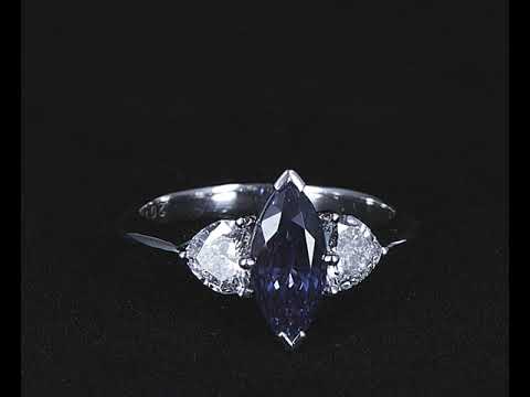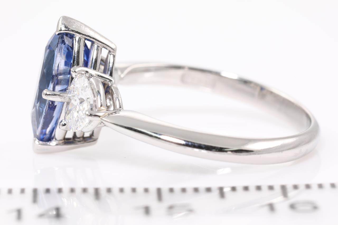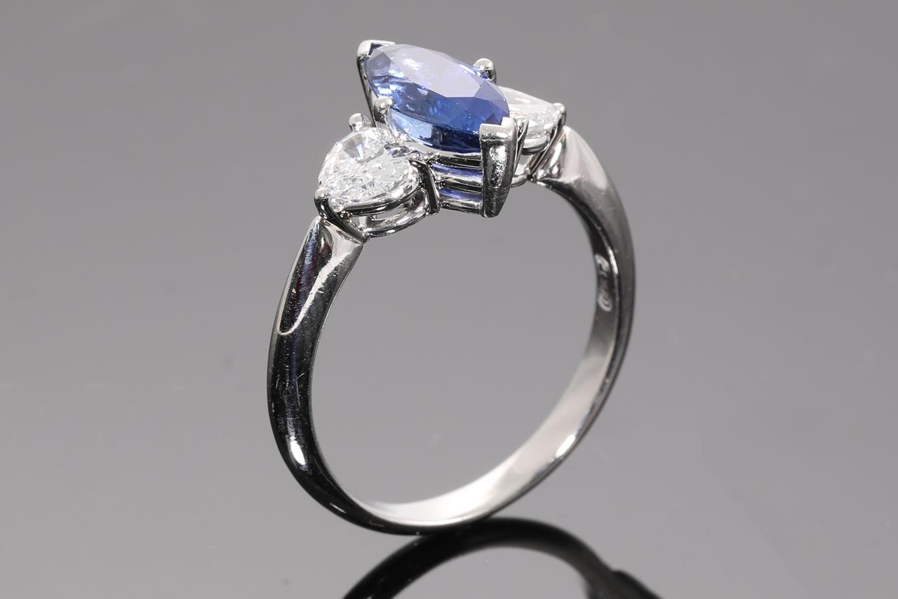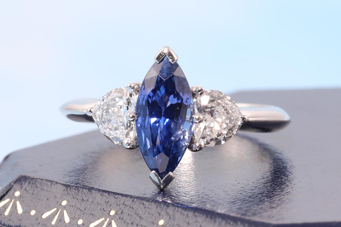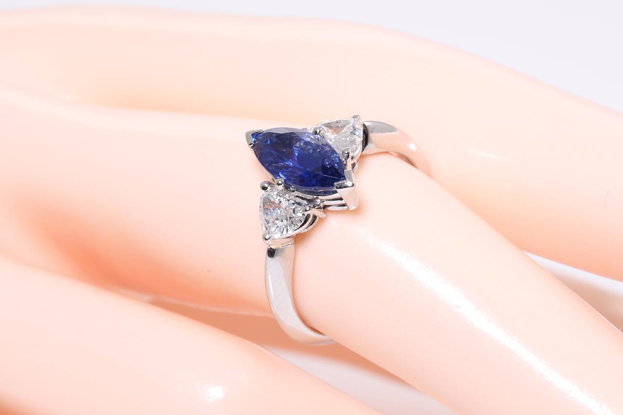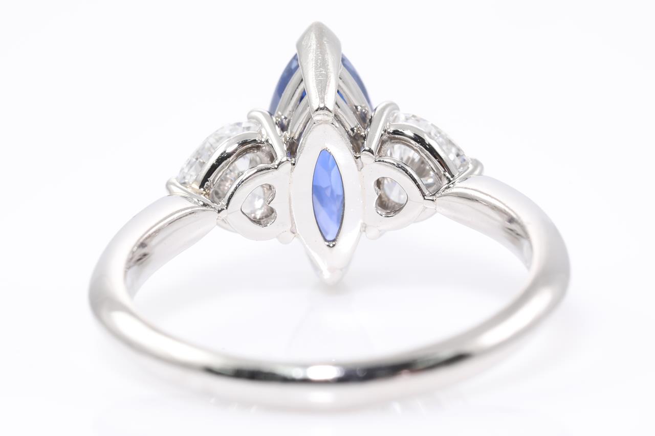 Sapphire and Diamond ring with a marquise blue Sapphire of 2.09ct and 2 heart shaped Diamonds totalling 0.60cts (Estimated grading: G VS-SI). Platinum. Ring size M - can be resized up by a maximum of 3 sizes, down with ring clip. Weight: 4.7g (Pre-owned)
