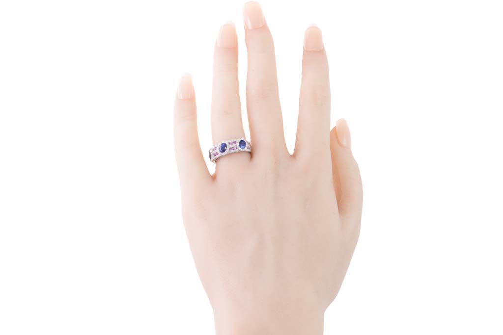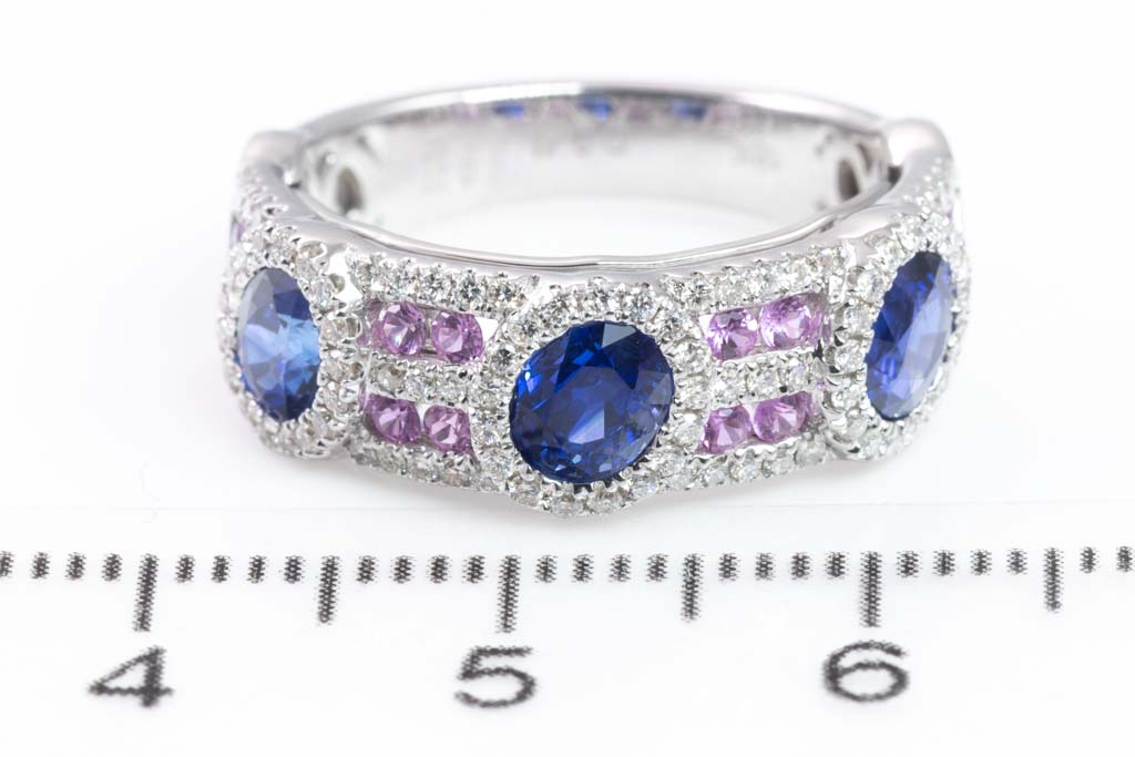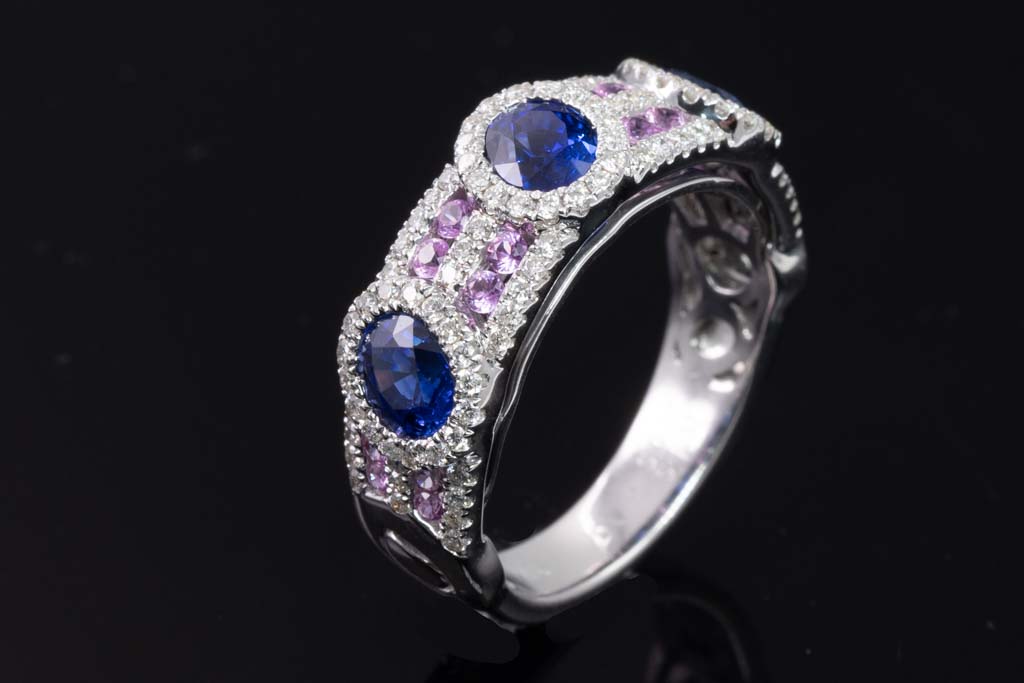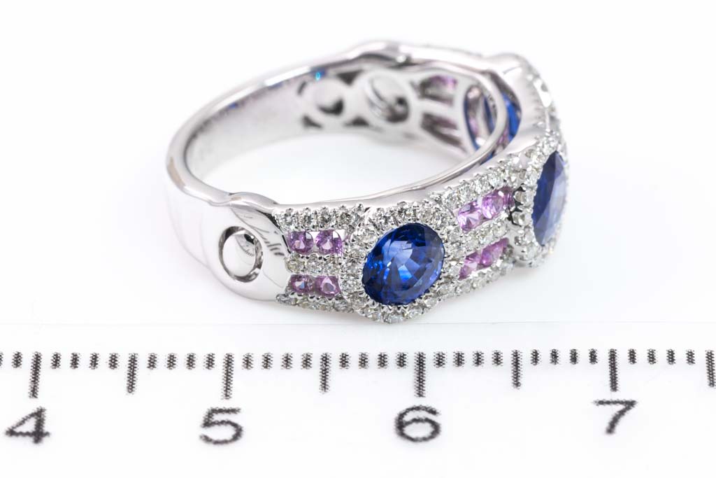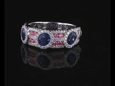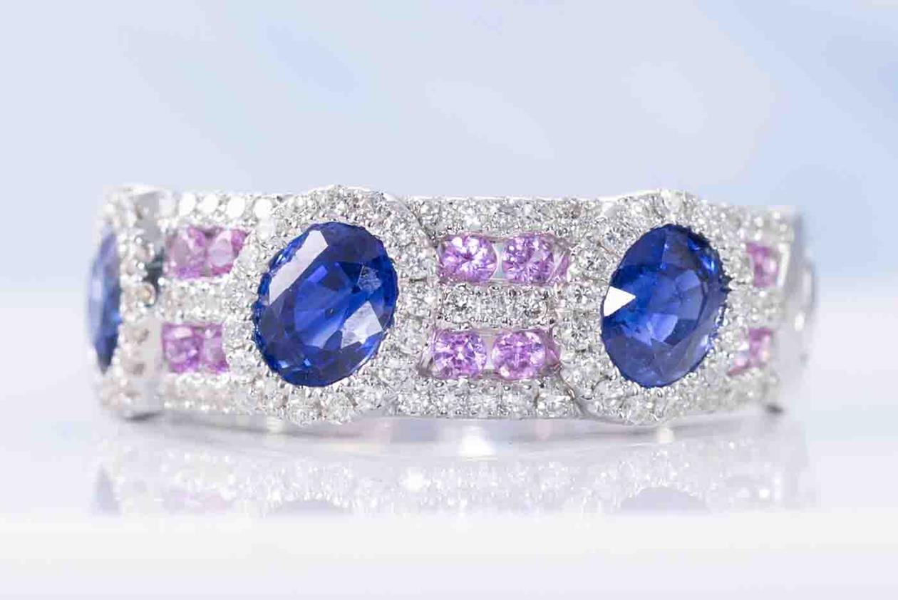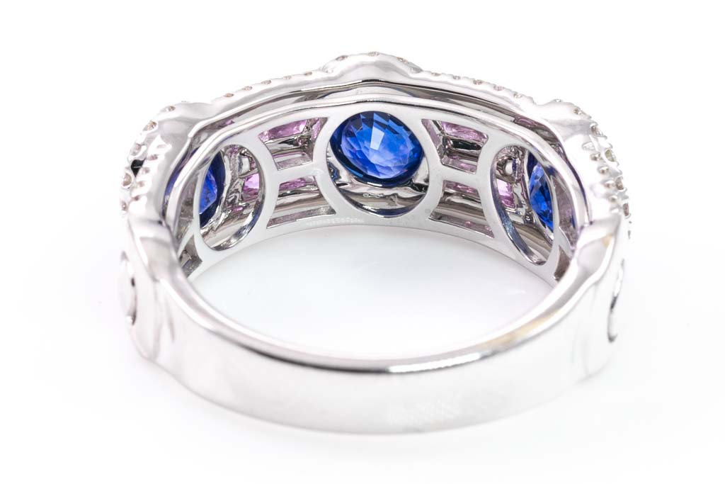 Sapphire and Diamond ring with oval shape blue Sapphires totalling 1.82cts, round pink Sapphires totalling 0.27cts and round Diamonds totalling 0.41cts (Estimated grading: I-J P1). 18ct white gold. Ring size L. Weight: 6.3g. (Pre-owned)