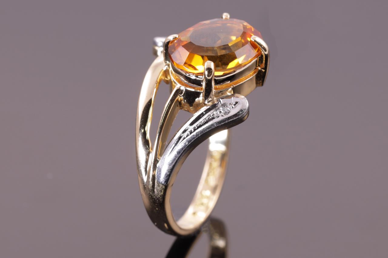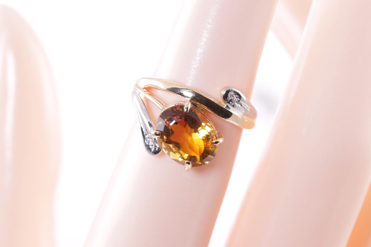 Citrine and Diamond ring with an oval Citrine of 2.10ct and Diamonds totalling 0.01cts. 18ct yellow gold & platinum. Ring size I1/2 - ring resizing is not recommended. Weight: 3.8g. (Pre-owned)