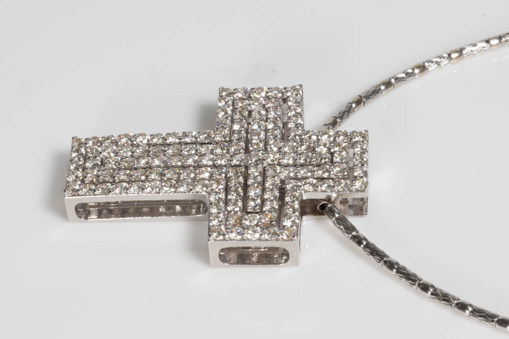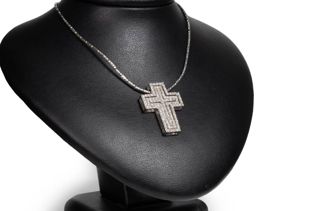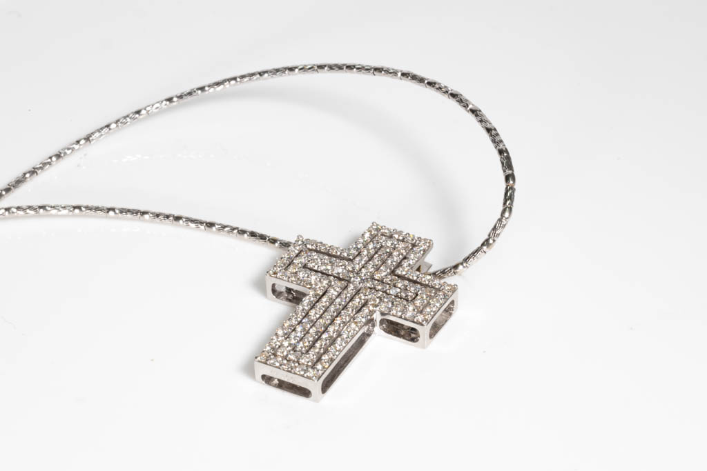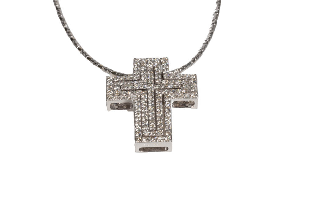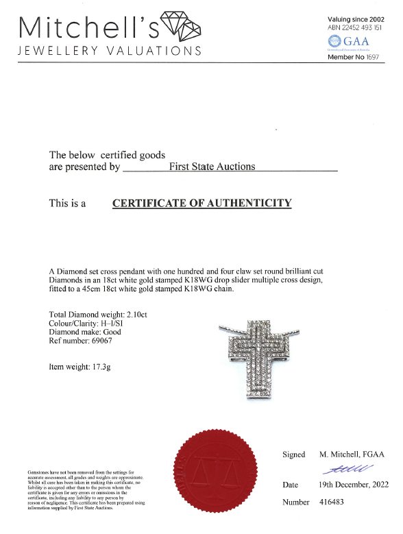 Diamond cross pendant with round Diamonds totalling 2.10cts. (Estimated grading: H-I SI). 18ct white gold with 44cm 18ct white gold adjustable chain. Weight: 17.3g. With Certificate #416483. (Pre-owned)