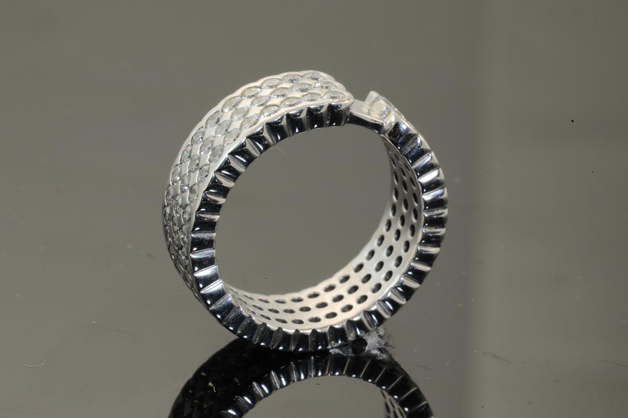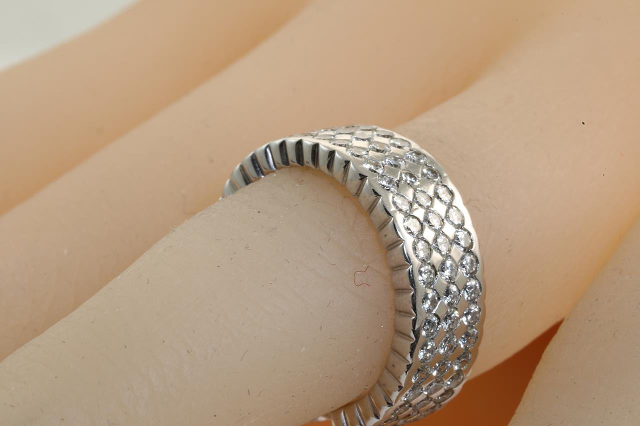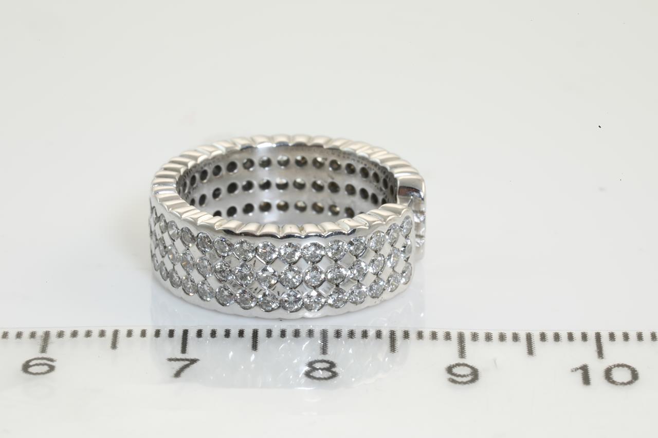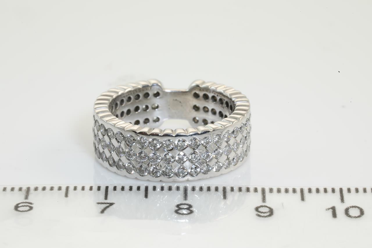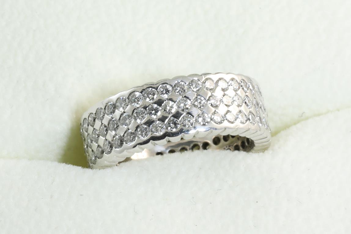 Diamond 3 row eternity ring with 105 round Diamonds totalling 2.10cts (Estimated grading: G-H SI). 18ct white gold. Ring size K1/2 - ring resizing is not recommended. Weight: 8.9g. (As new)