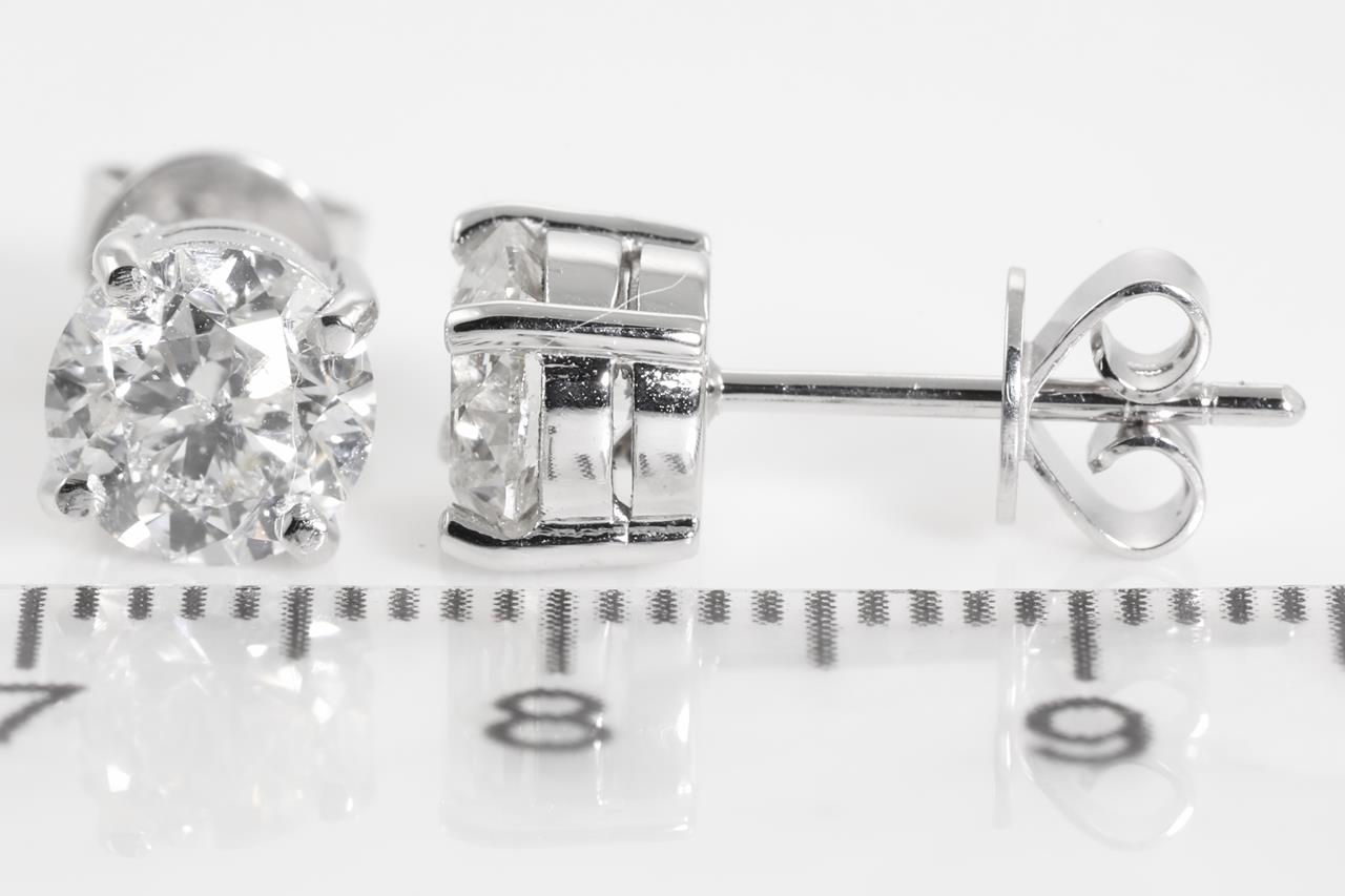 Diamond stud earrings with 2 round brilliant cut Diamonds totalling 2.11cts (Estimated grading: F-G P1). 18ct white gold. Weight: 2.7g. With certificate #414405. (New).