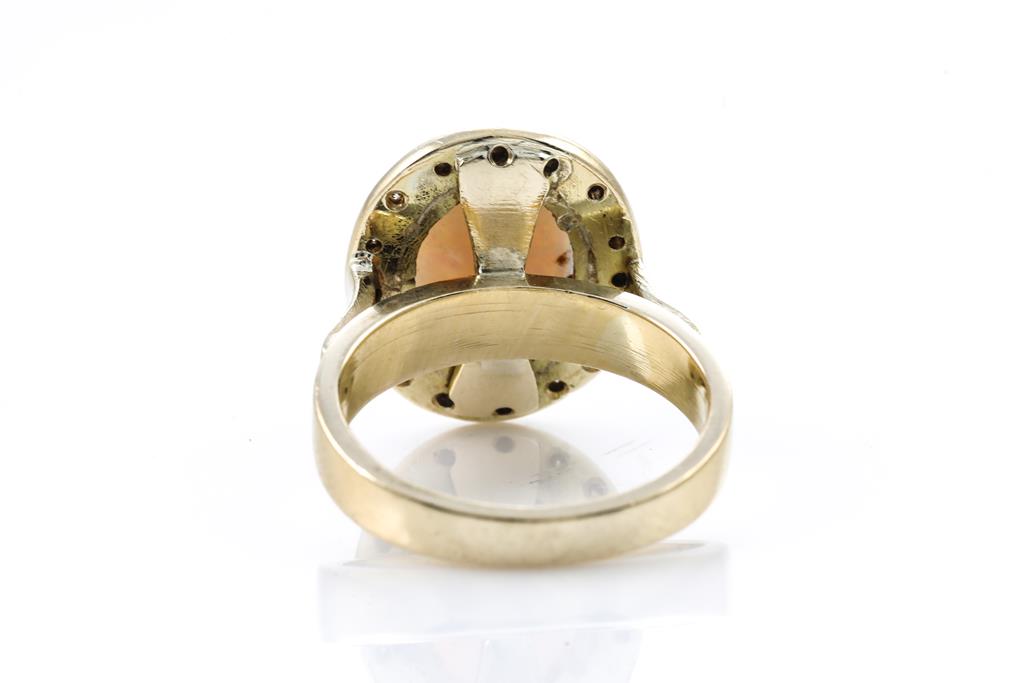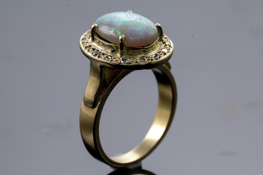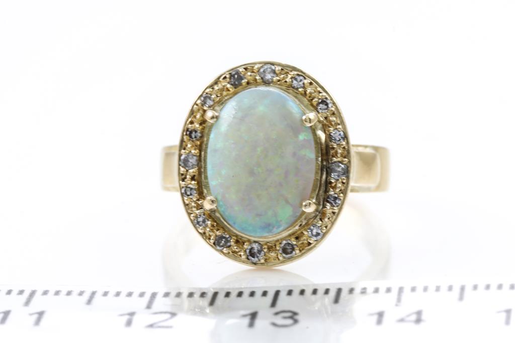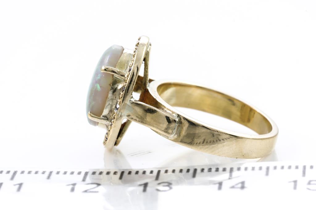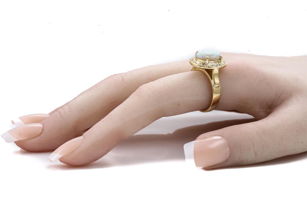 Opal and Diamond ring with oval cabochon cut solid white Opal of approximately 2.11ct and round Diamonds totalling approximately 0.08cts. 18ct yellow gold. Ring size N. Weight 9.5g. (Pre-owned)