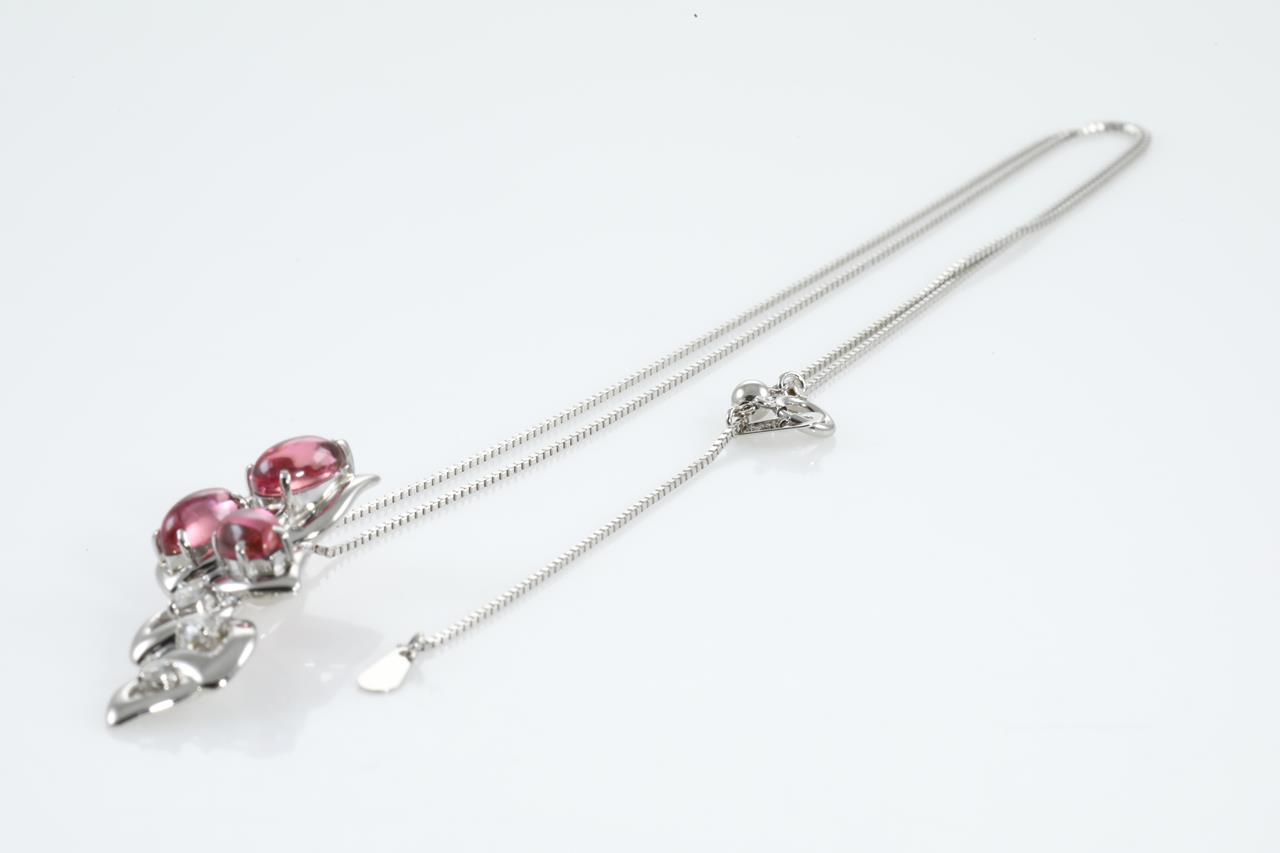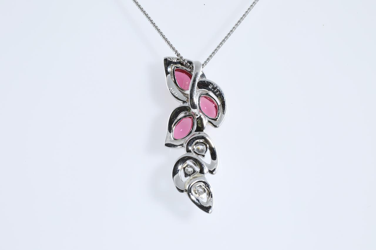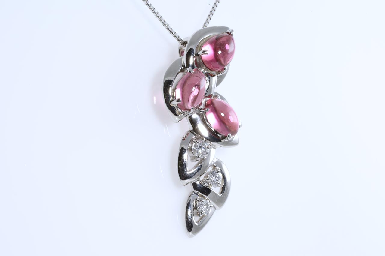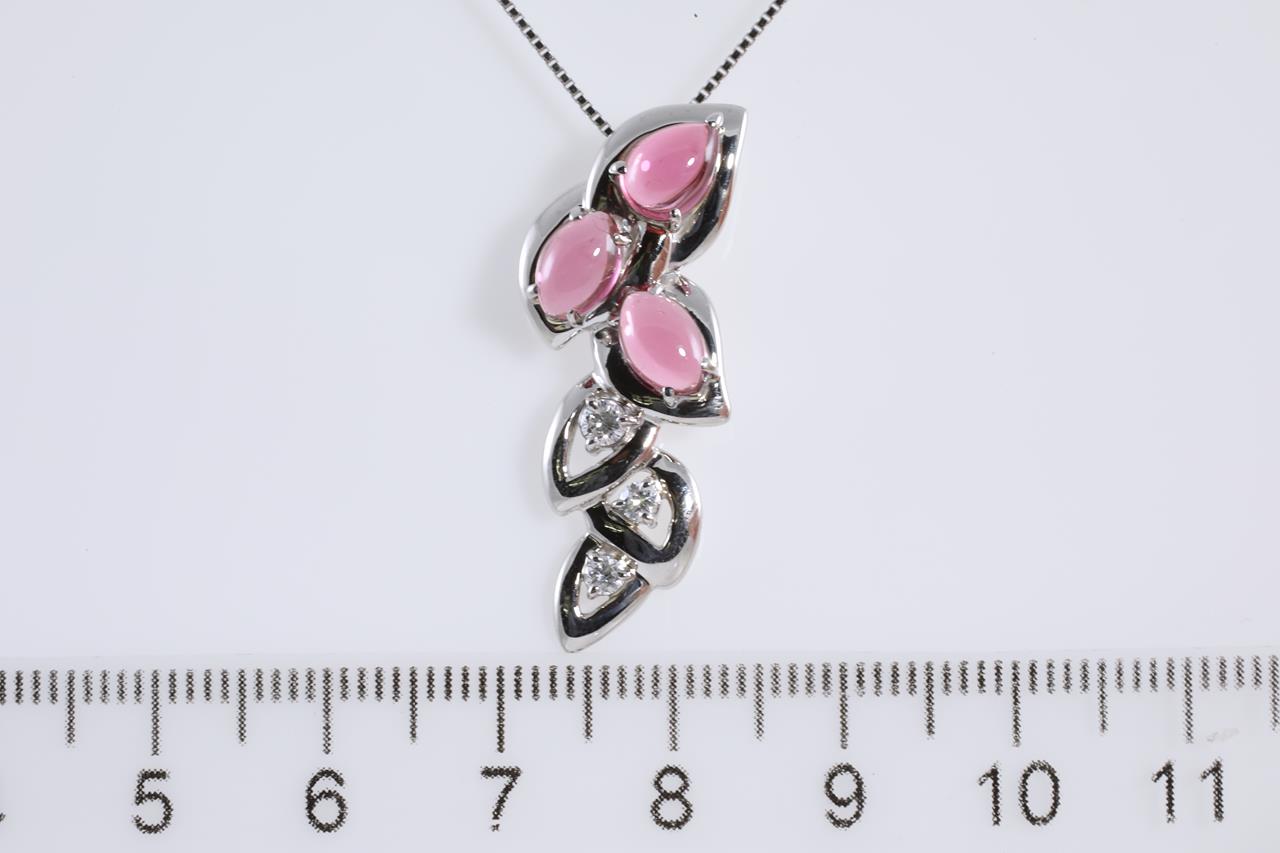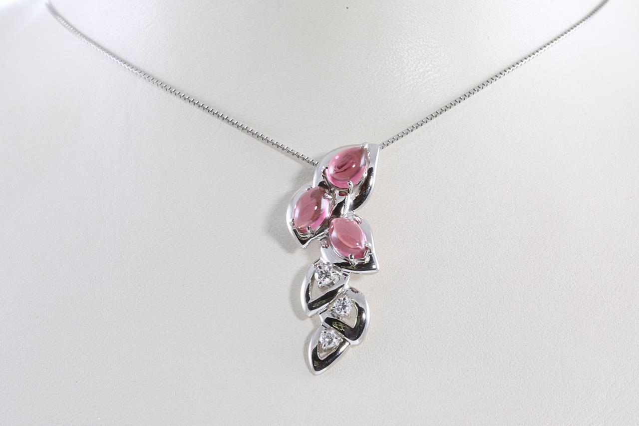Tourmaline and Diamond pendant with oval and marquise cabochon cut pink Tourmalines totalling 2.11cts and round Diamonds totalling 0.10cts. Platinum with platinum 45cm adjustable chain. Weight 8.8g (As New)