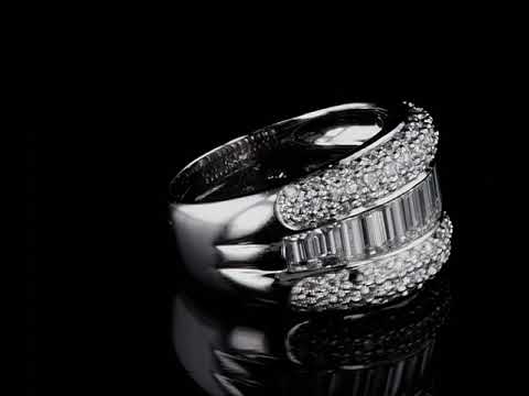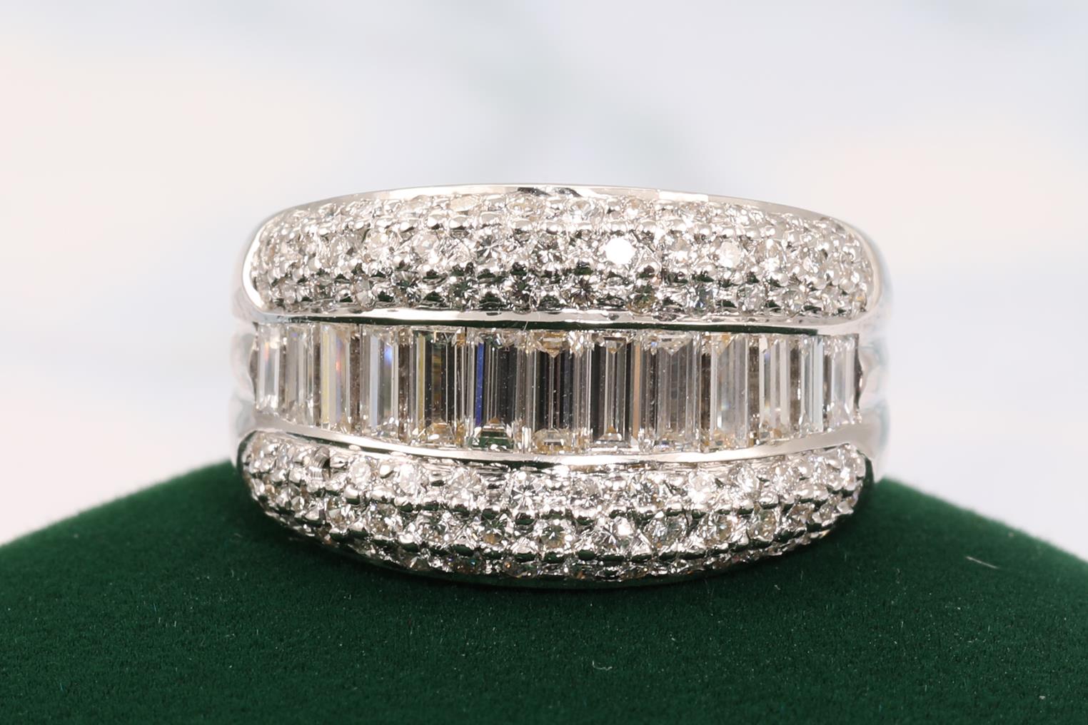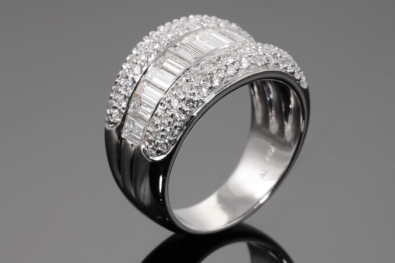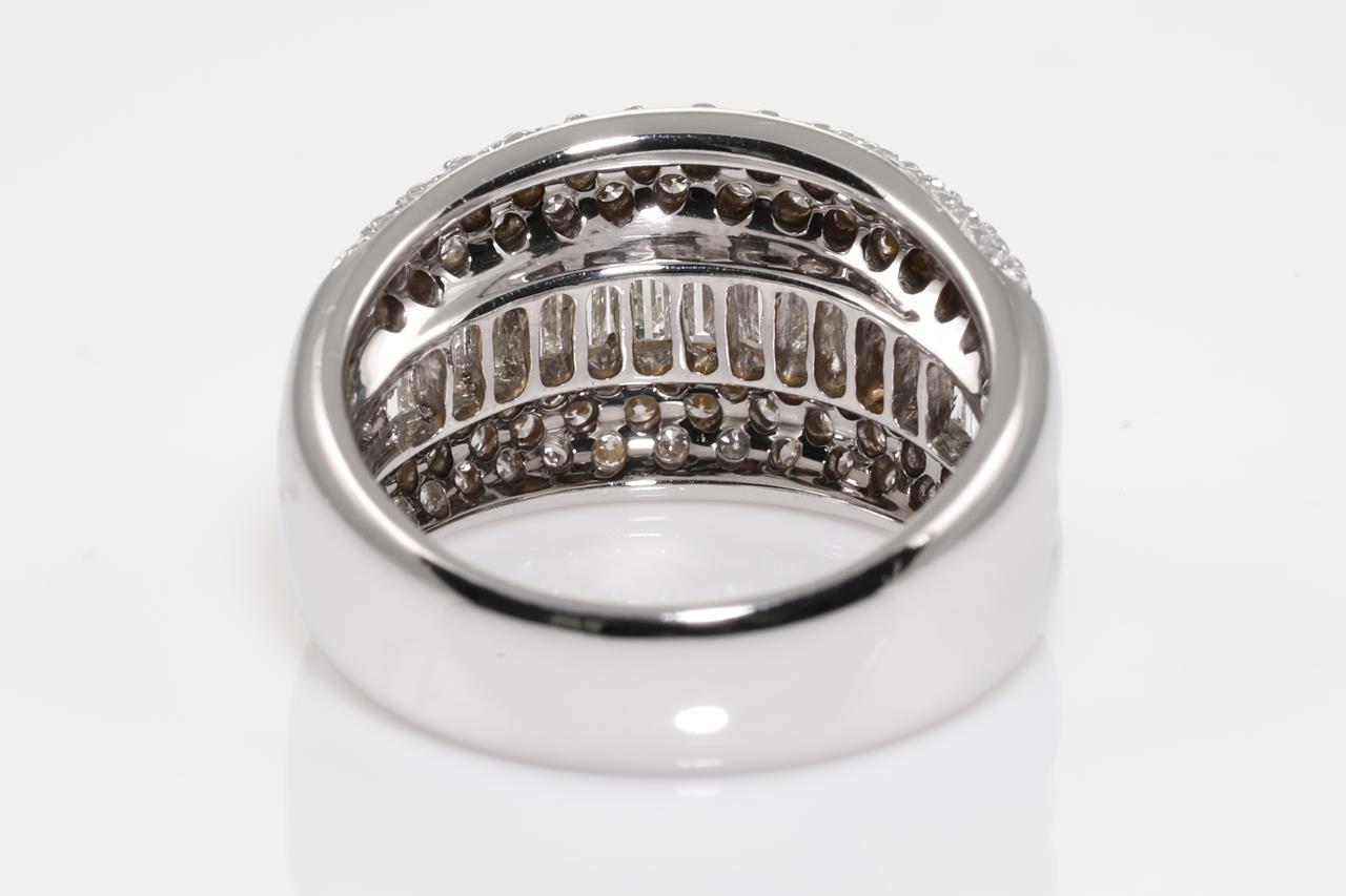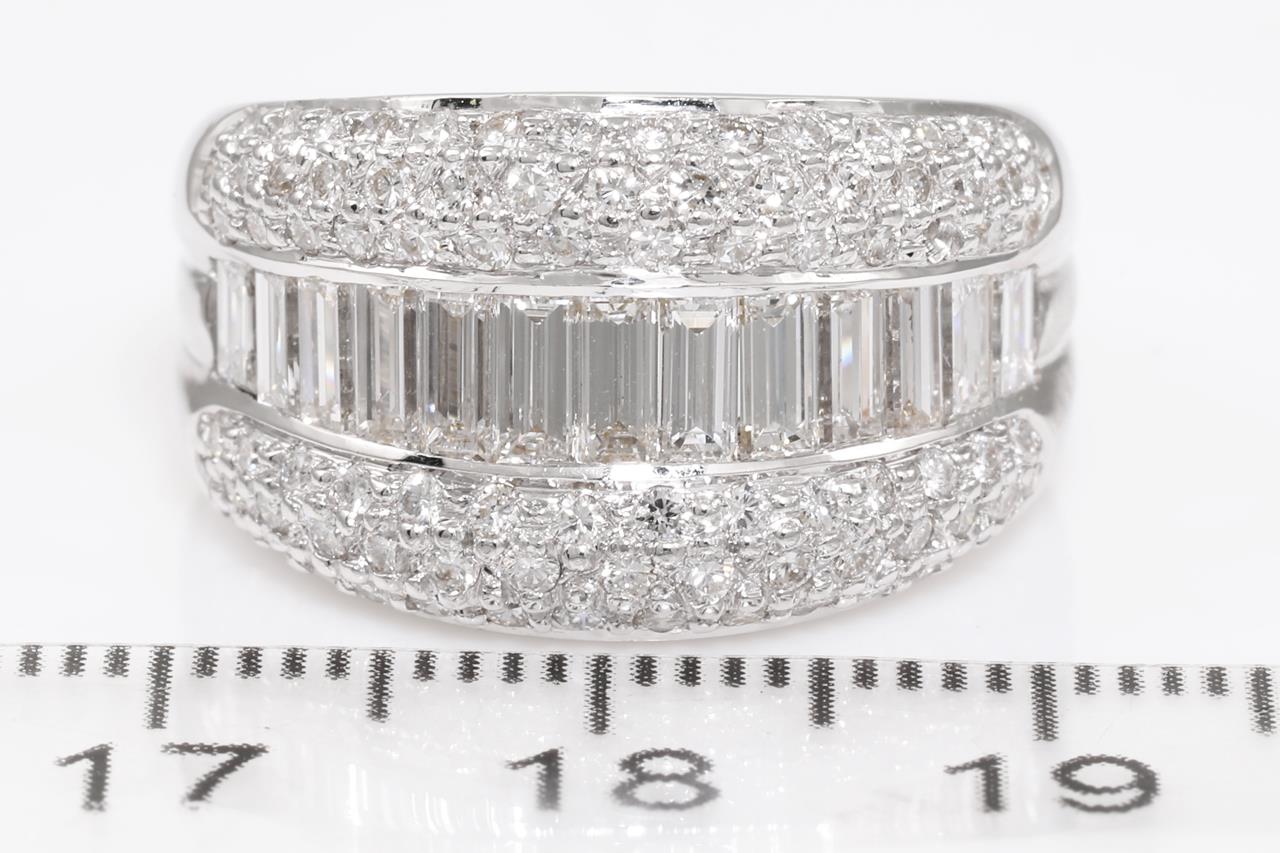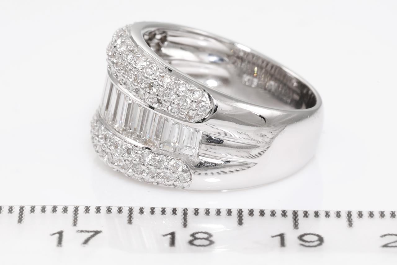 Diamond Dress Ring with round and baguette cut Diamonds of 2.12cts (Estimated grading: H-I VS-SI). 18ct white gold. Ring size: M - ring resizing is not recommended. Weight: 10.2. (Pre-owned)