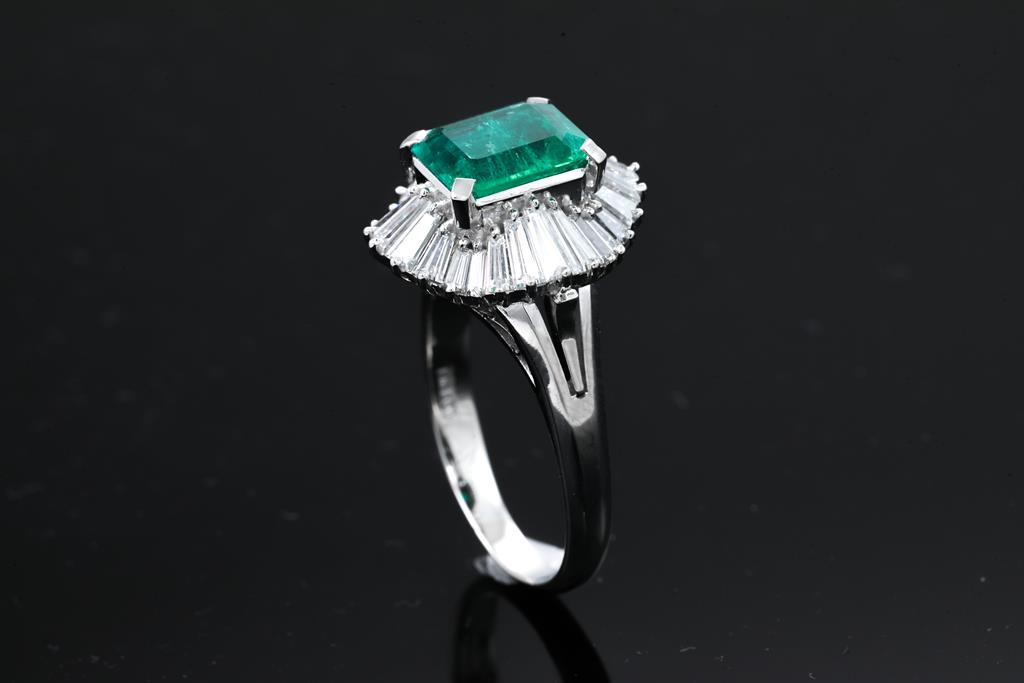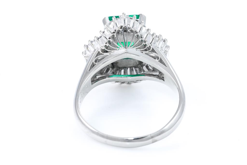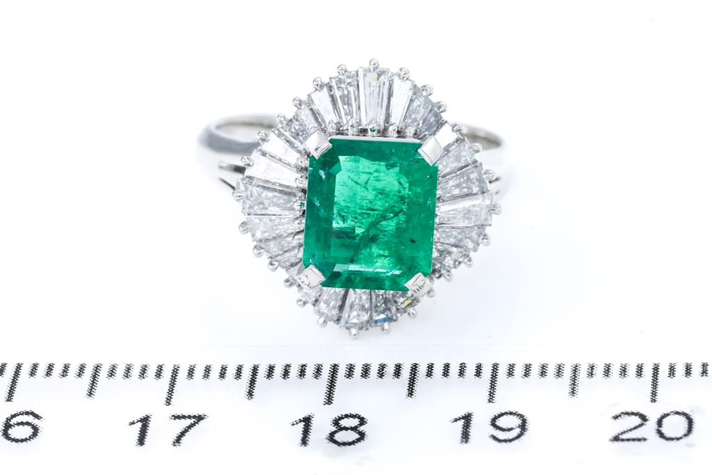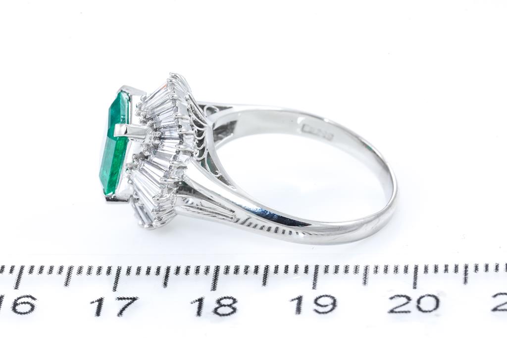 Emerald and Diamond ring with an emerald cut Emerald of 2.12ct and Diamonds totalling 2.02cts (Estimated grading: G-H SI). Platinum. Ring size Q1/2. Weight: 11.1g. With certificate #415671. (Pre-owned)