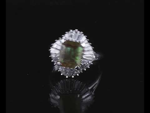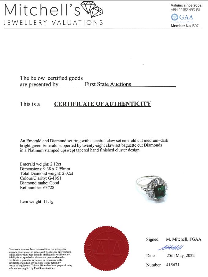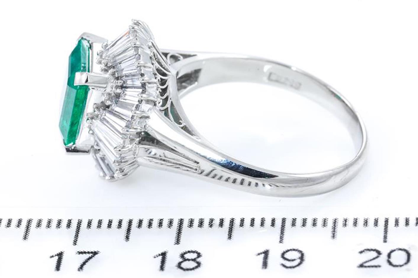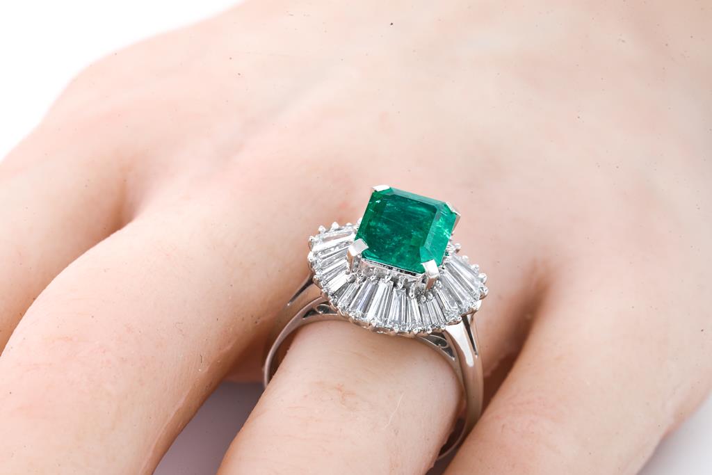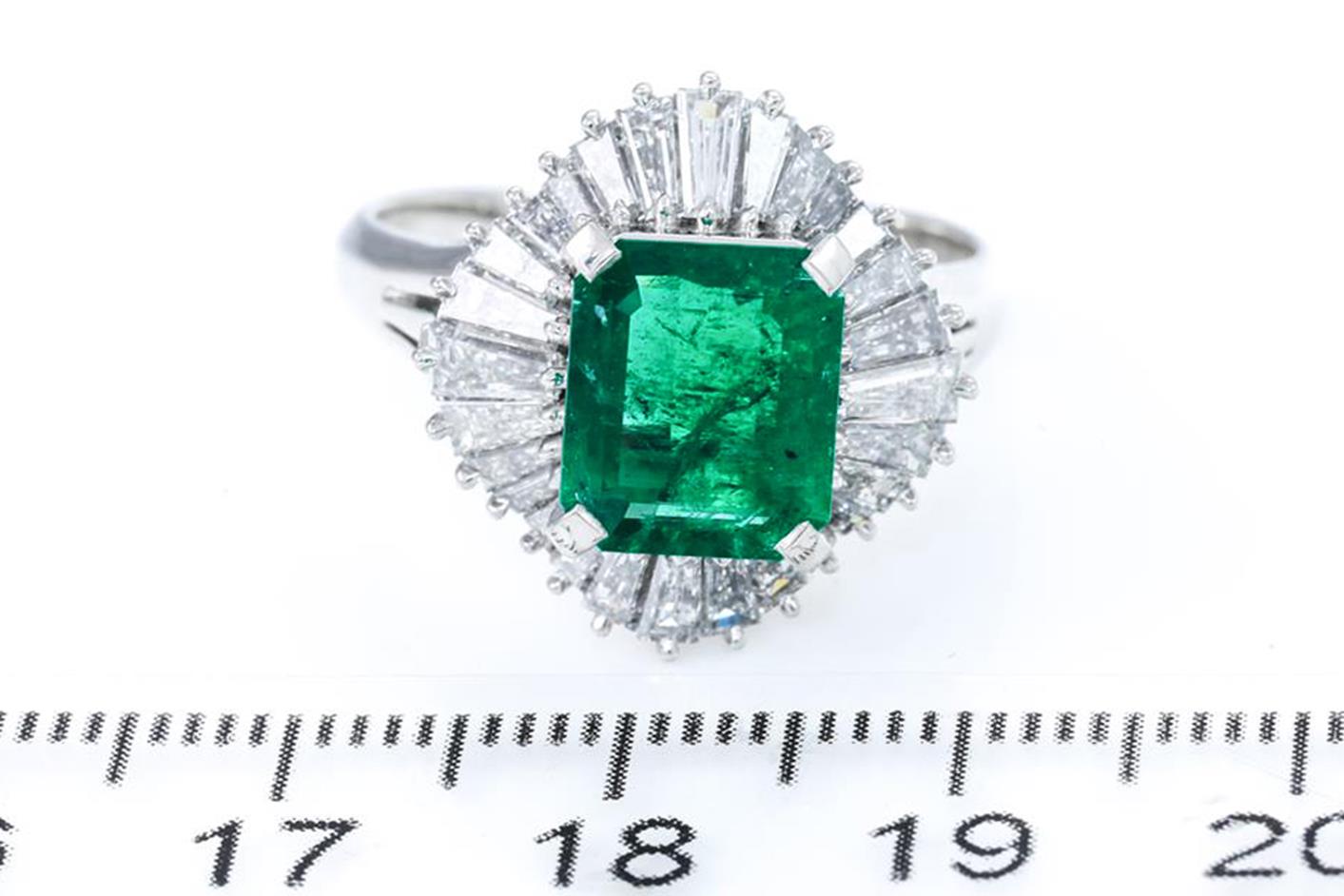 Emerald and Diamond ring with an emerald cut Emerald of 2.12ct and Diamonds totalling 2.02cts (Estimated grading: G-H SI). Platinum. Ring size Q1/2. Weight: 11.1g. With certificate #415671. (Pre-owned)