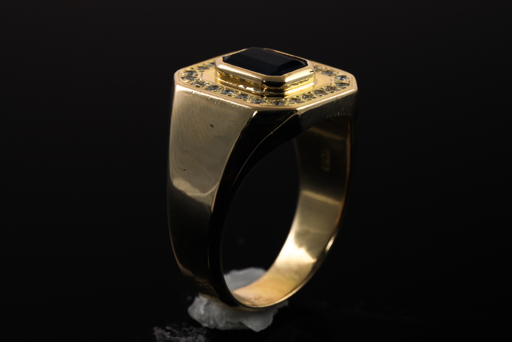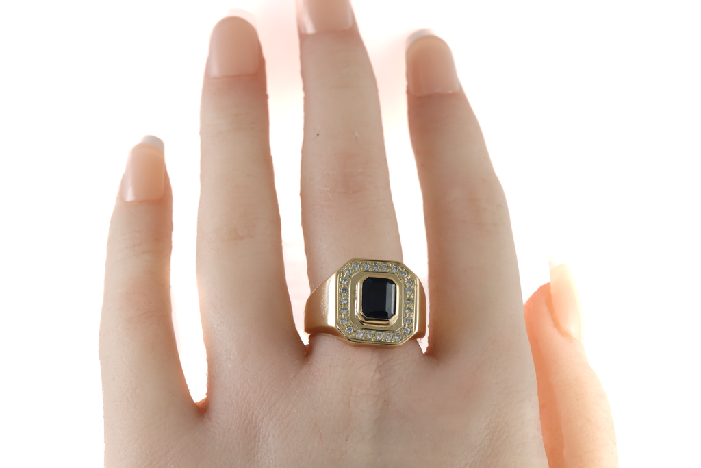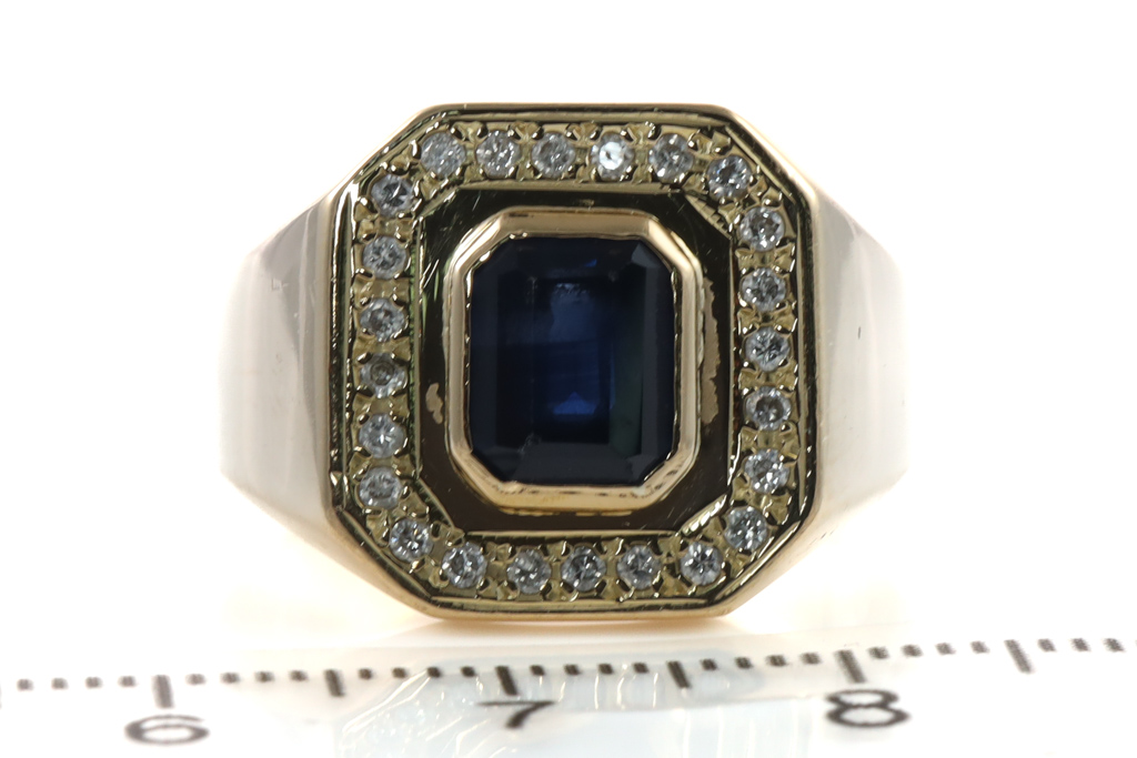 Mens ring with an emerald cut dark blue Sapphire of 2.12ct (Sapphire with wear marks on table) and round Diamonds totalling 0.24cts. 18ct yellow gold. Ring size R. Weight: 18.4g. (Pre-owned)