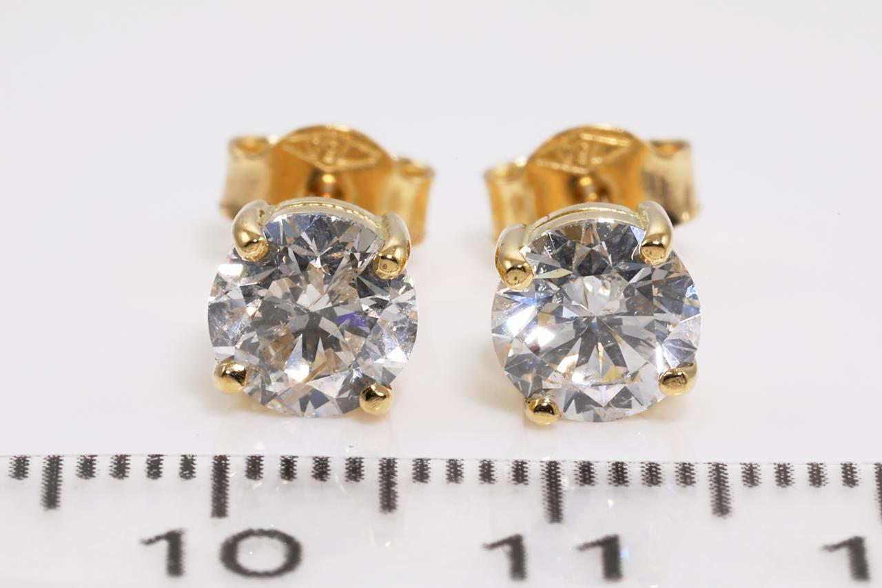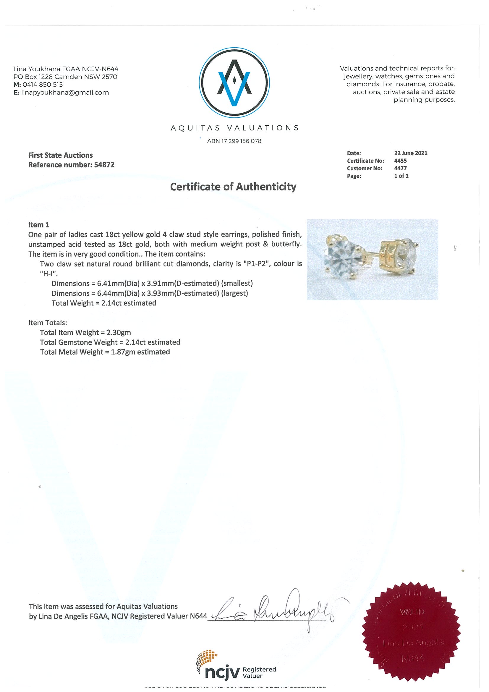 Diamond stud earrings with 2 round brilliant cut Diamonds totalling 2.14cts (Estimated grading: H-I P1-P2). 18ct yellow gold. Weight: 2.3g. With certificate #4455. (New).
