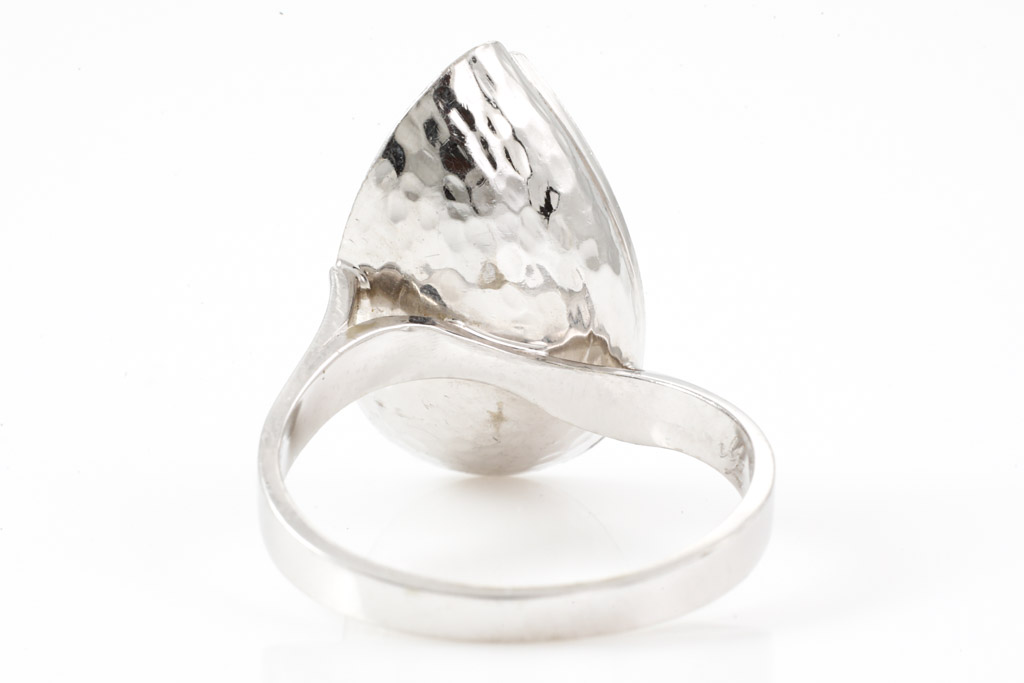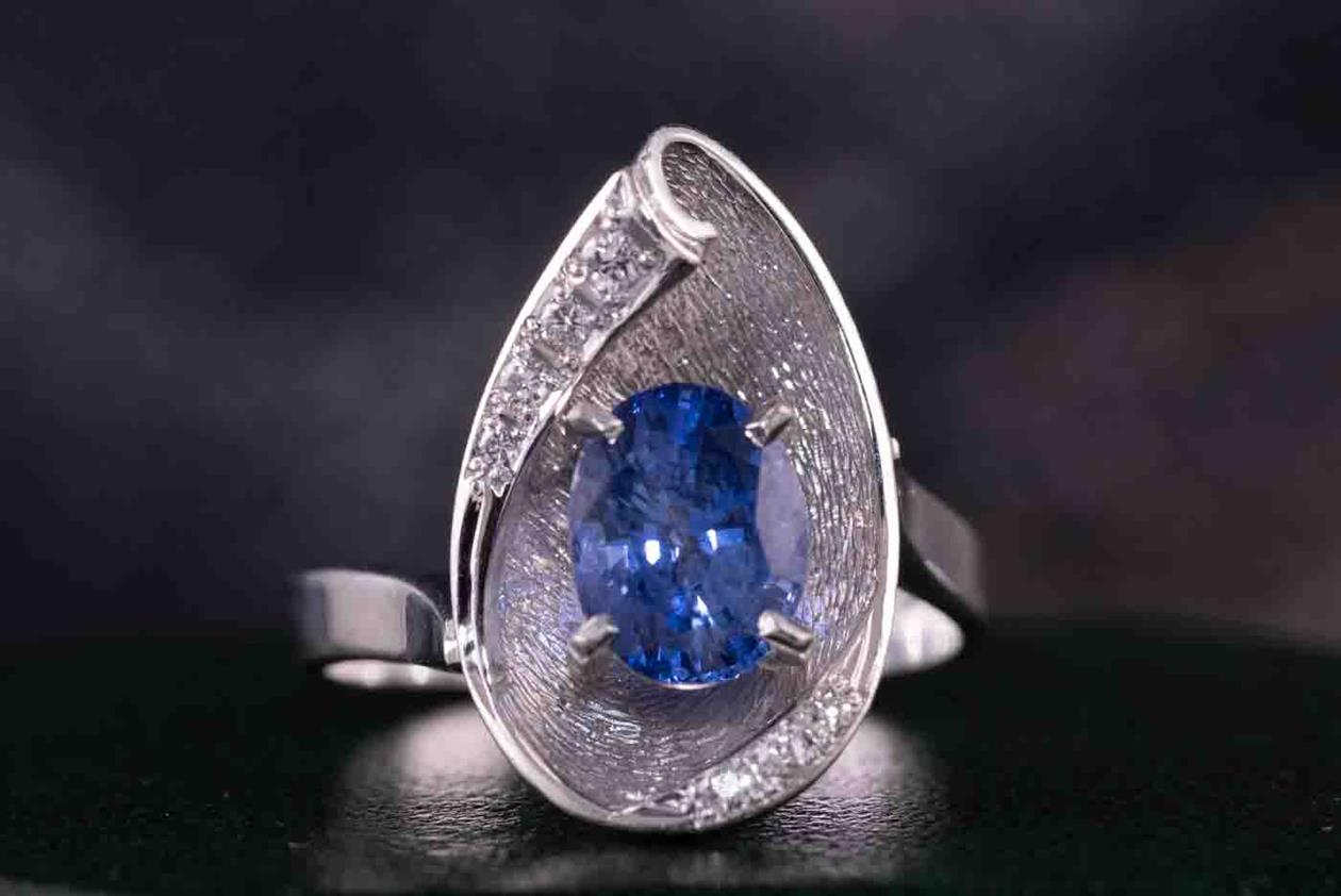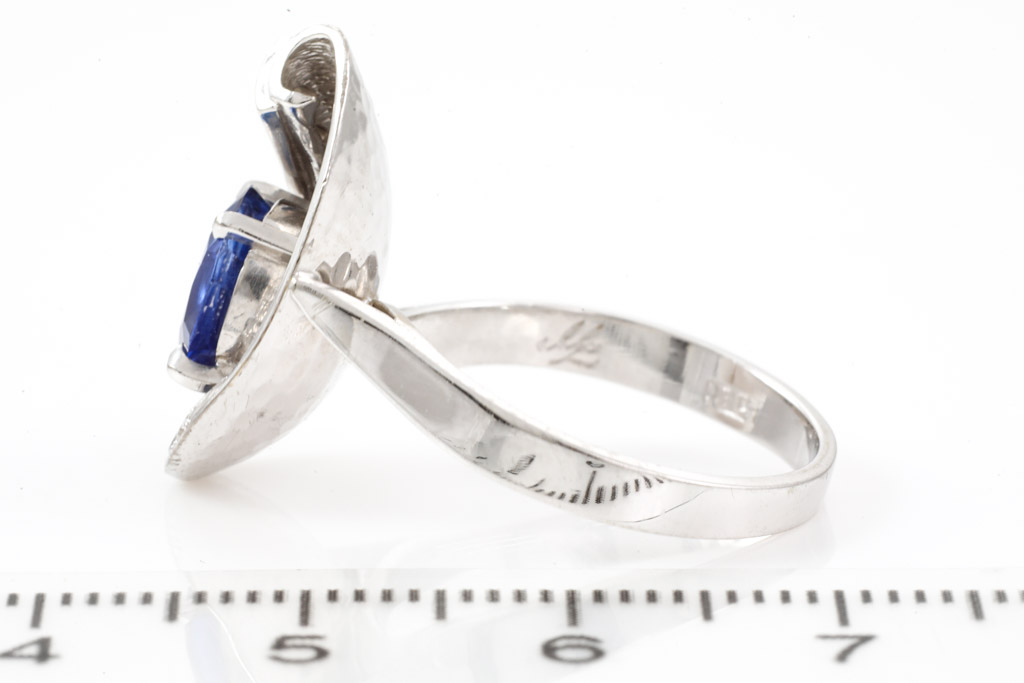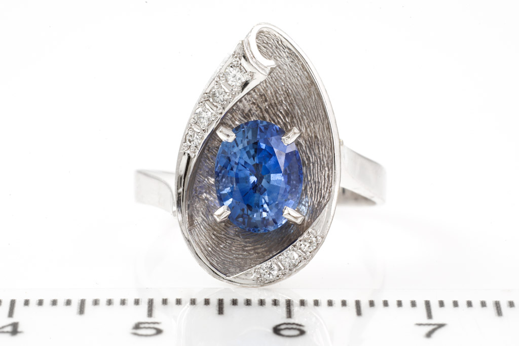 Sapphire and Diamond ring with an oval blue Sapphire of 2.15cts and 7 round Diamonds totalling 0.09cts. 18ct white gold. Ring size O - can only be resized up and down by a maximum of 3 sizes. Weight: 5.5g (Pre-owned)