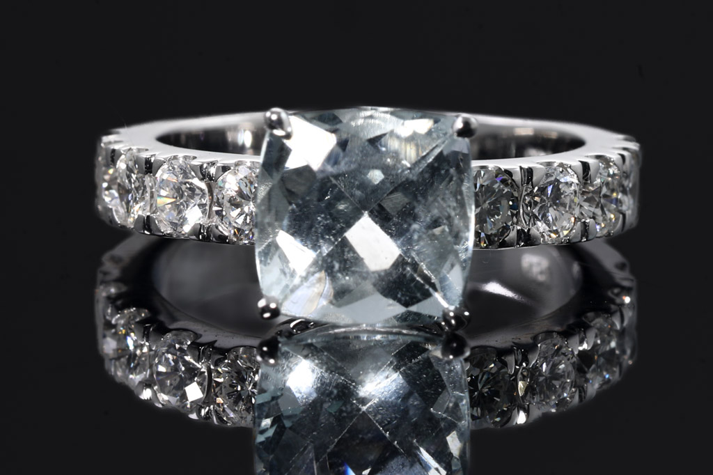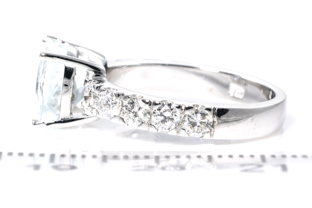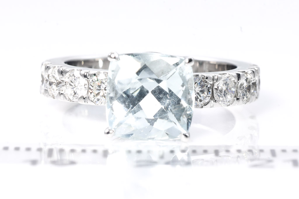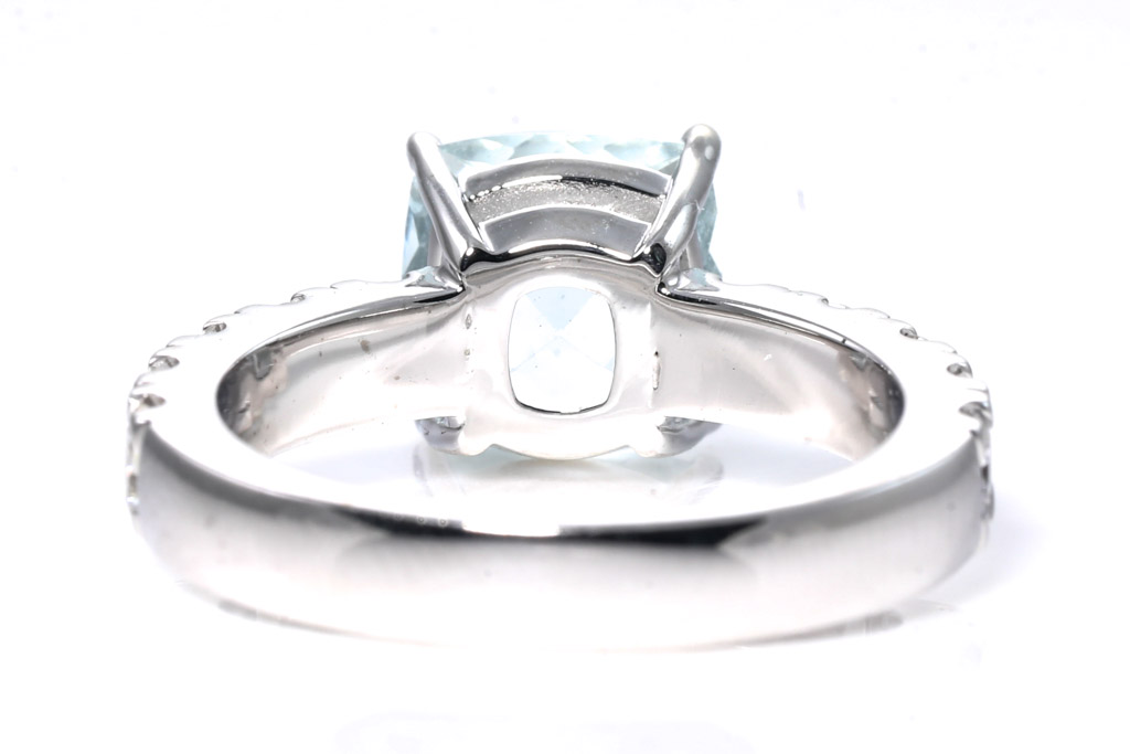 Aquamarine and Diamond ring with centred cushion cut Aquamarine of 2.16cts and 10 shoulder round Diamonds totalling 0.93cts (Estimated grading: G SI) . 18ct white gold. Ring size L. Weight: 5.8g. (New)