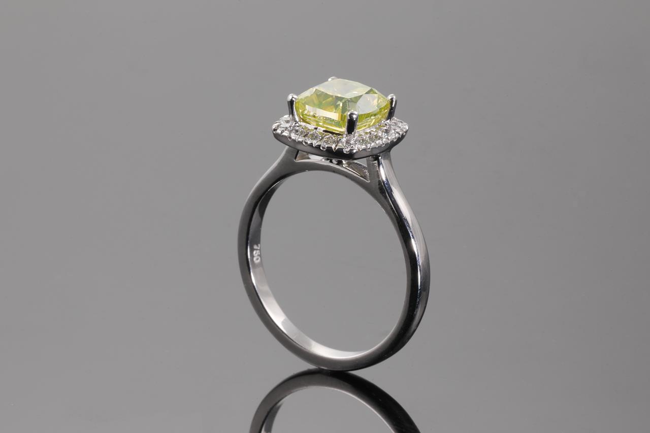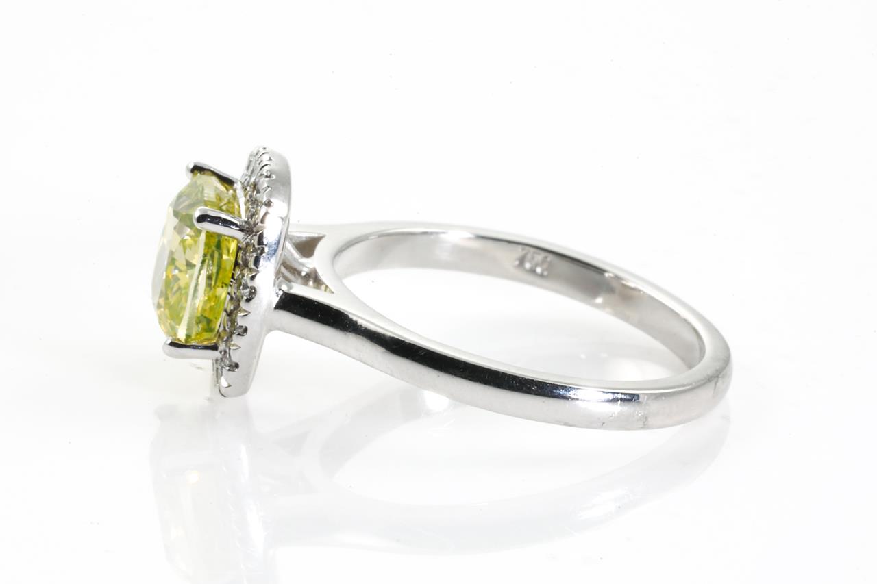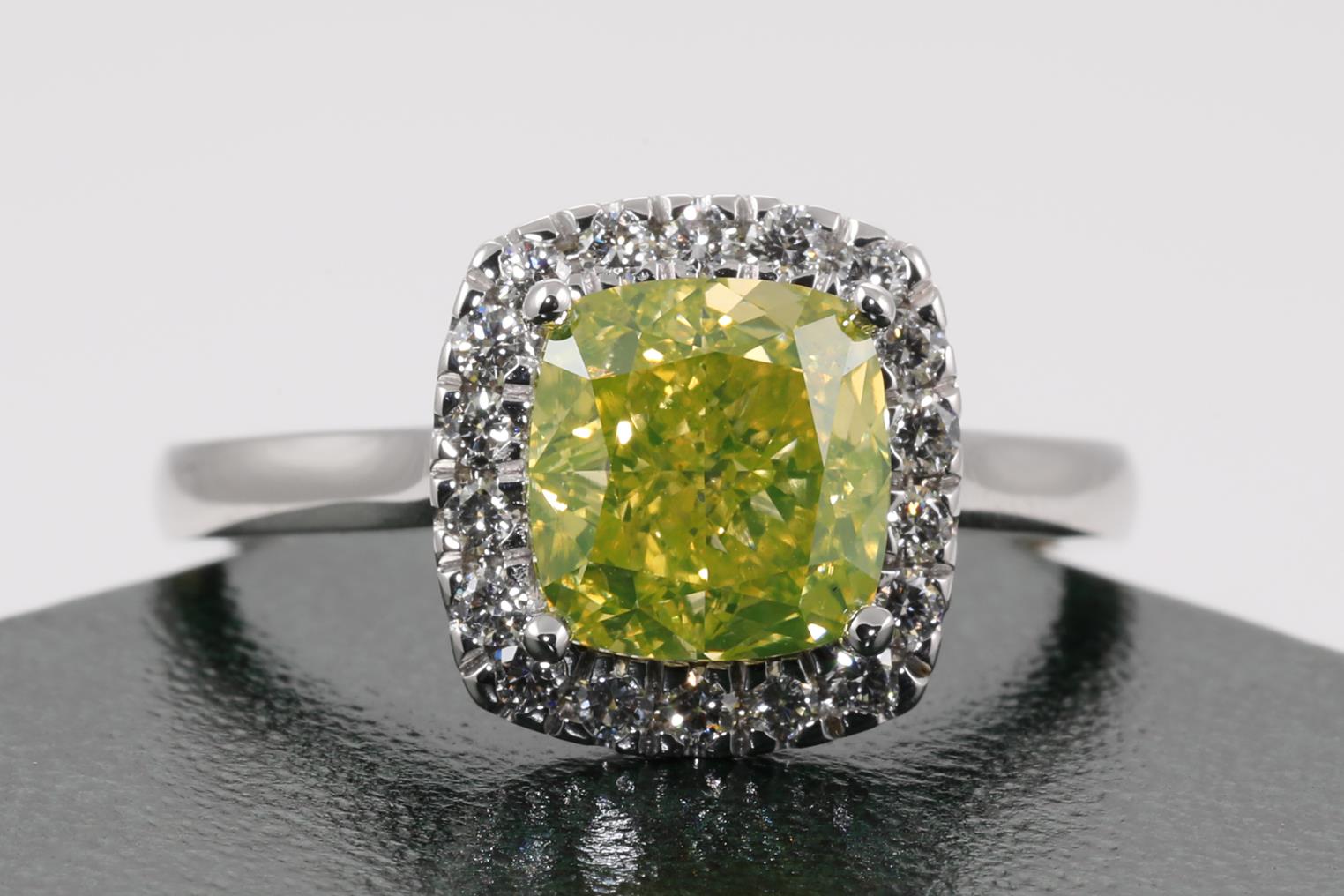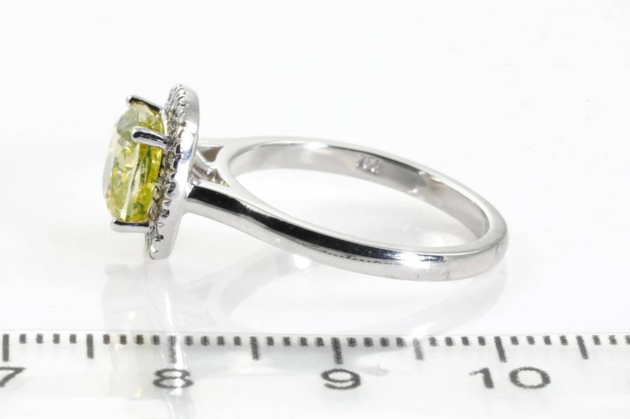 Diamond halo ring with centre cushion cut Diamond of 2.16ct (with GIA report graded as Natural Fancy Intense Greenish Yellow Even VVS2 #2185921610) and surrounding diamonds totalling 0.21cts. 18ct white gold. Ring size L. Weight 4.8g (New)
