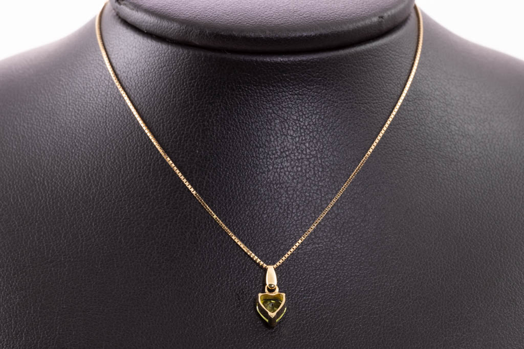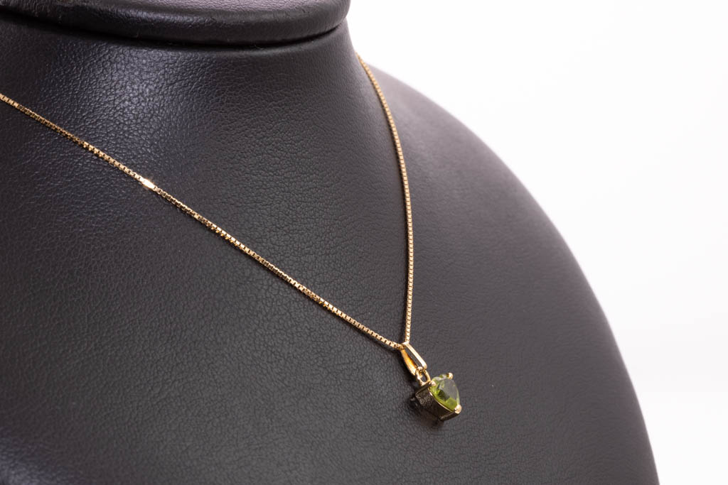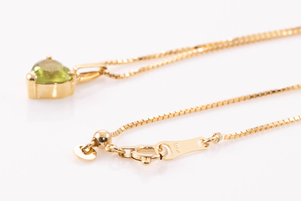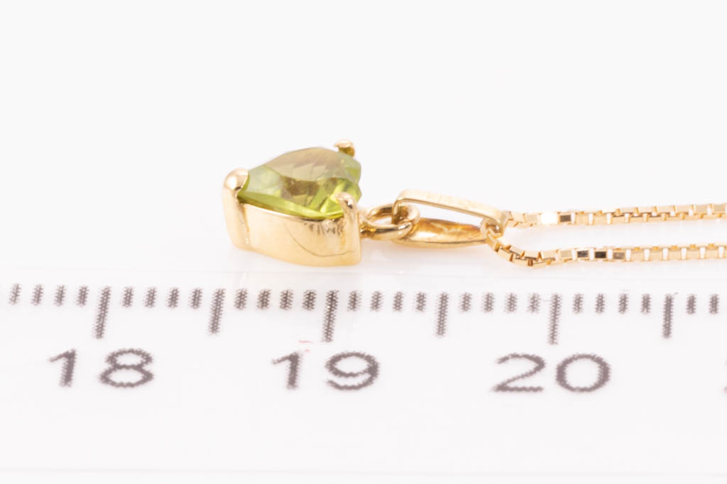 Peridot pendant with heart shape Peridot of approximately 2.16ct. 18ct yellow gold with 44cm 18ct yellow gold adjustable chain. Weight: 2.4g. (Pre-owned)