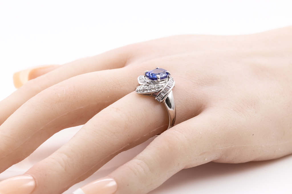 Tanzanite and Diamond ring with oval shape Tanzanite of 2.17ct and baguette cut and round Diamonds totalling 0.50cts (Estimated grading: H P1). Platinum. Ring size O. Weight: 8.3g. (Pre-owned)