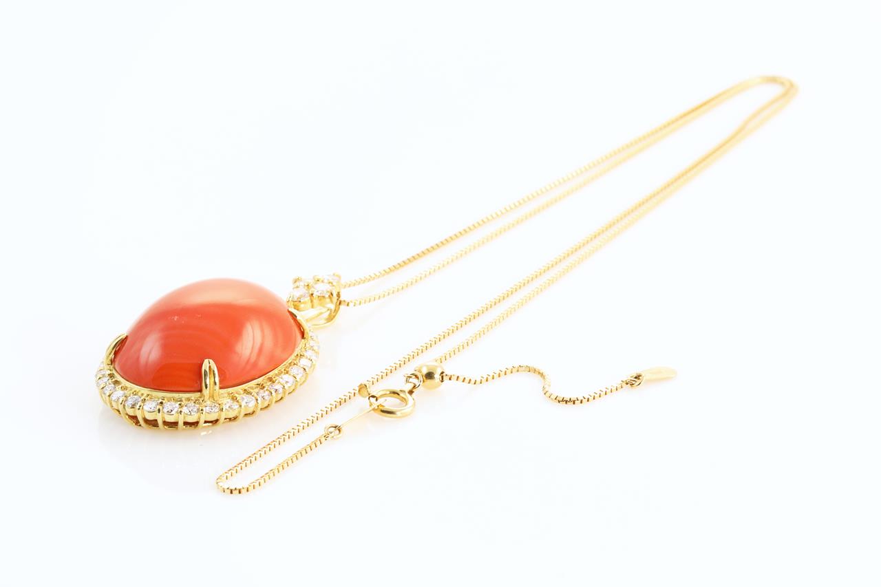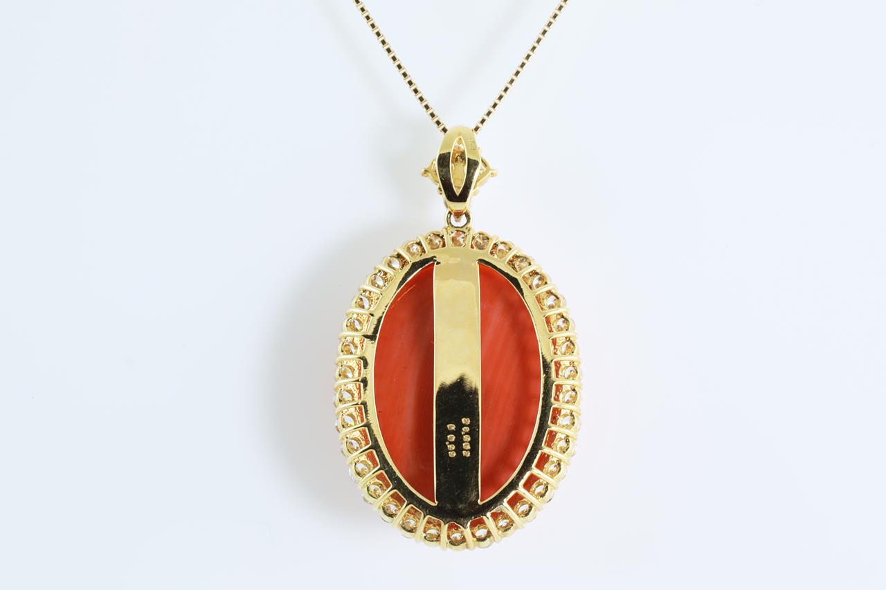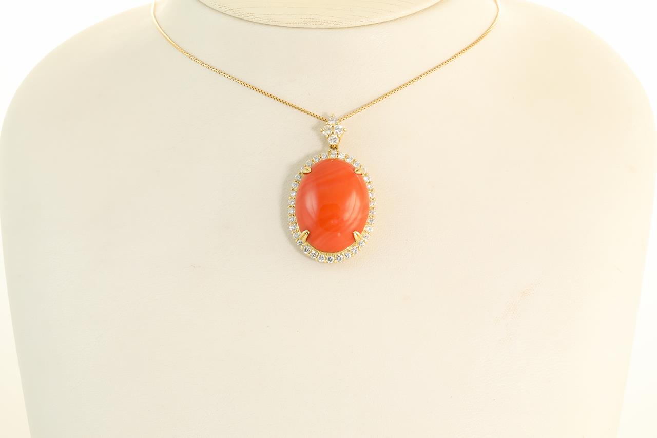 Coral and Diamond pendant with oval cabochon Coral of 21.8ct and Diamonds totalling 0.99cts (Estimated grading: G-H VS). 18ct yellow gold with 18ct gold 45cm chain. Weight: 10.4g (Pre-owned)