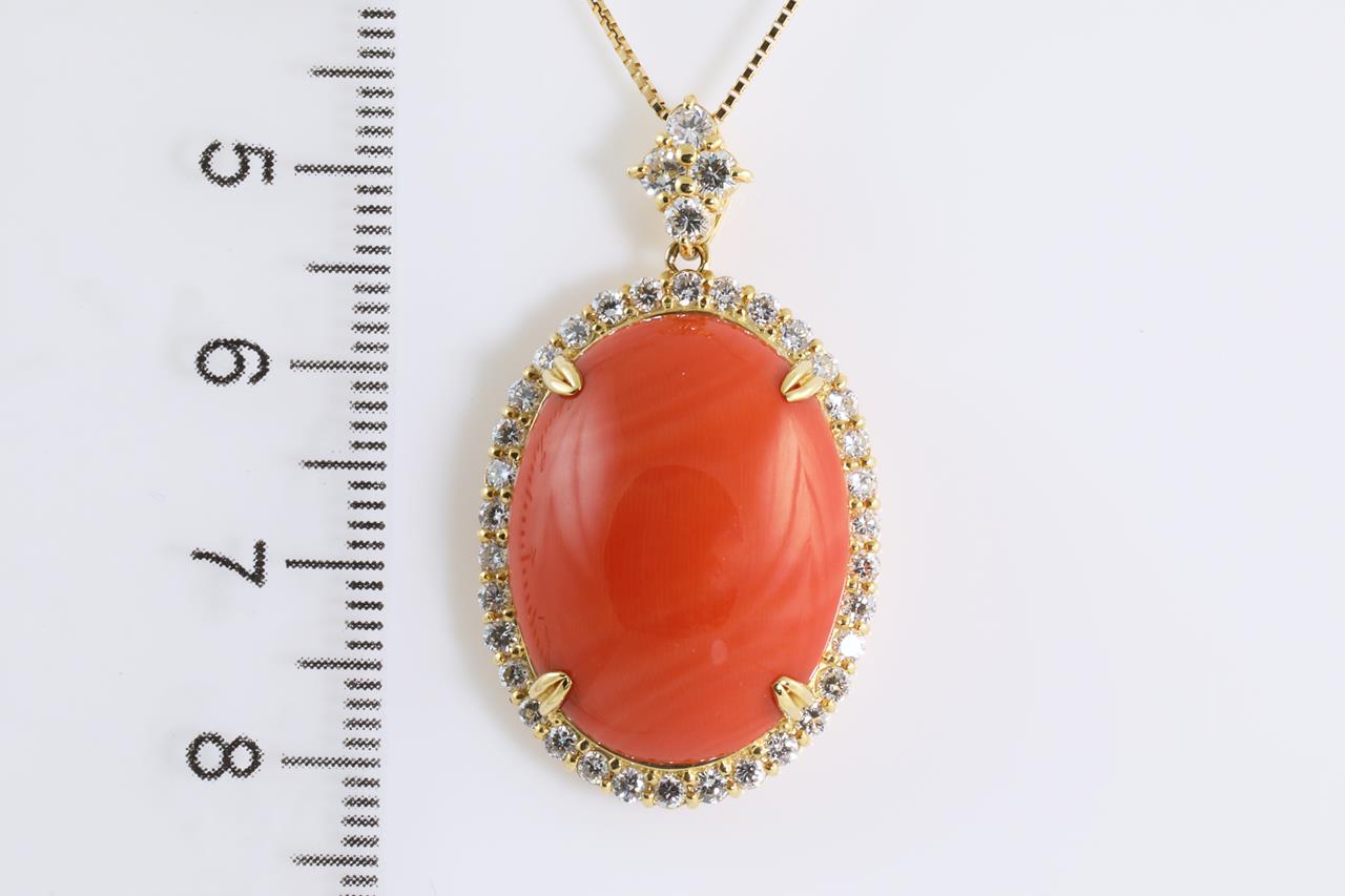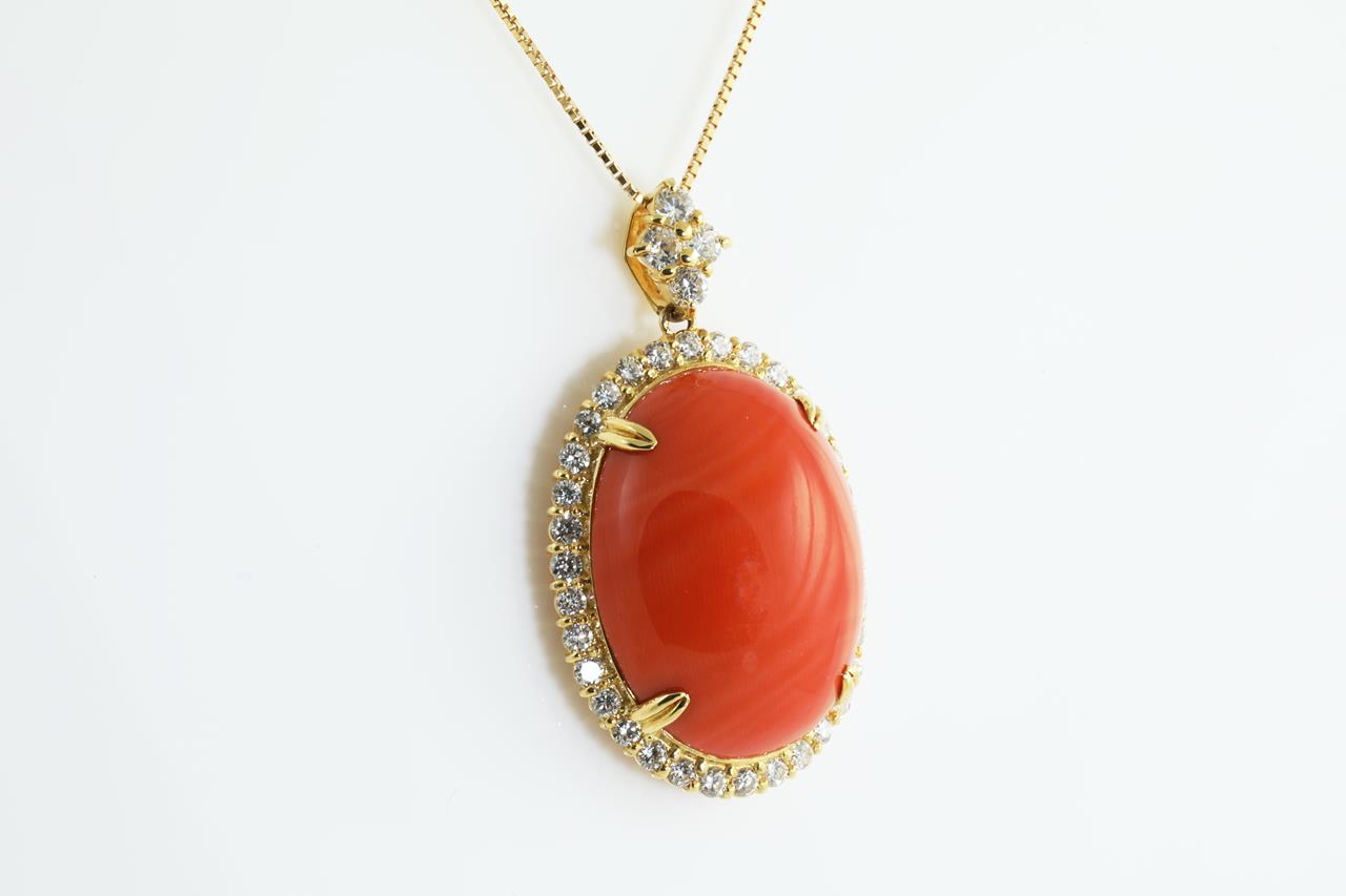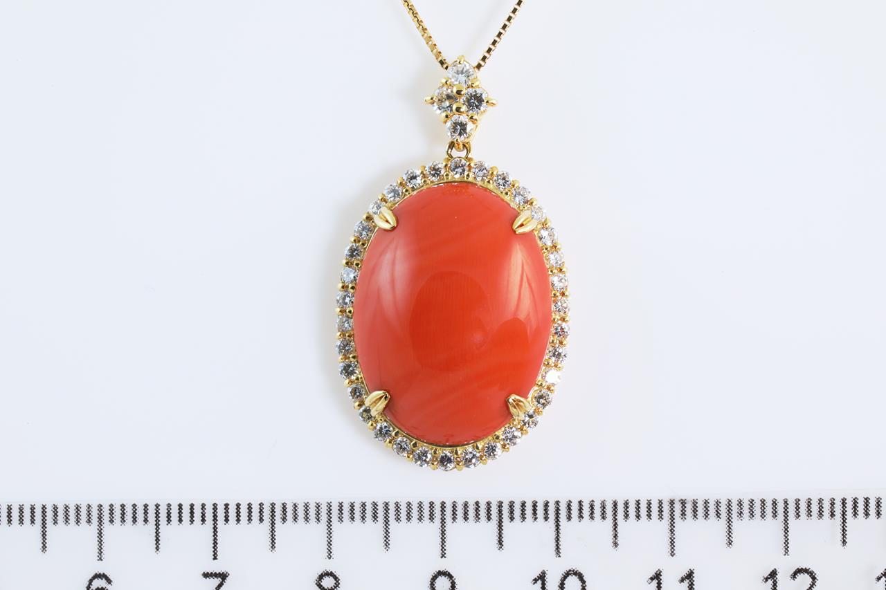 Coral and Diamond pendant with oval cabochon Coral of 21.8ct and Diamonds totalling 0.99cts (Estimated grading: G-H VS). 18ct yellow gold with 18ct gold 45cm chain. Weight: 10.4g (Pre-owned)