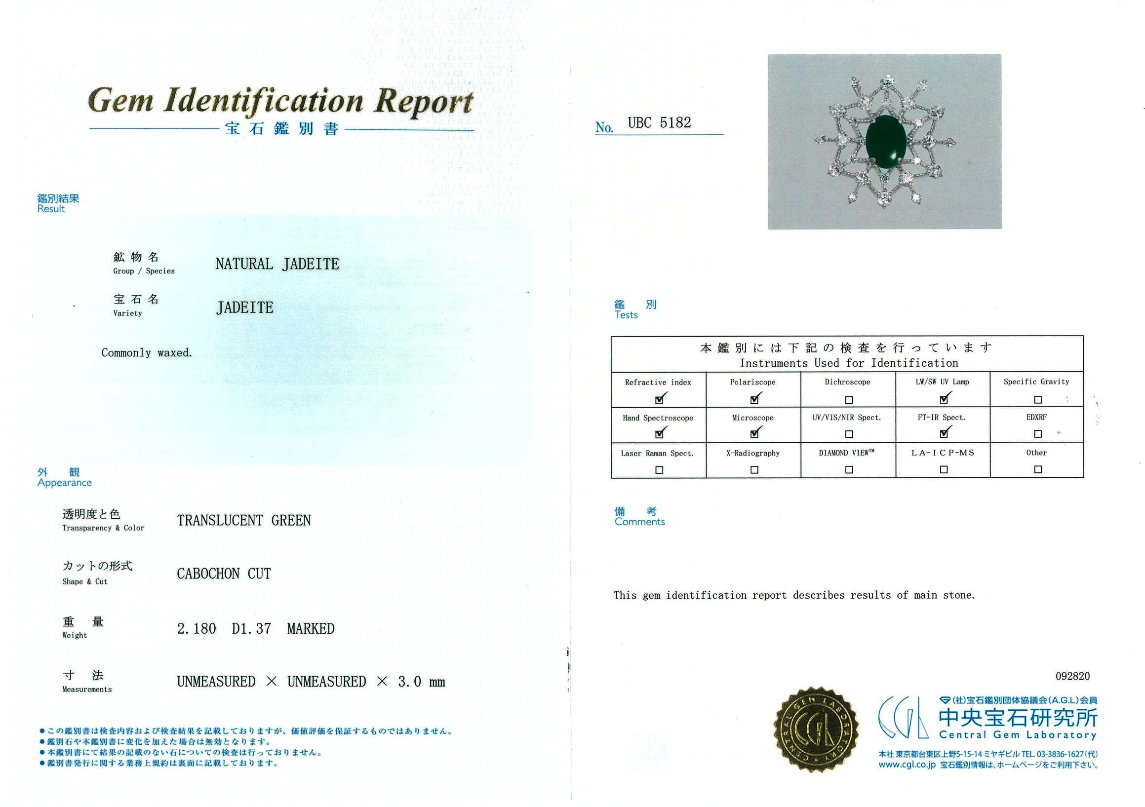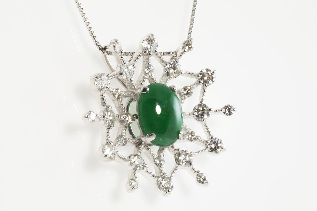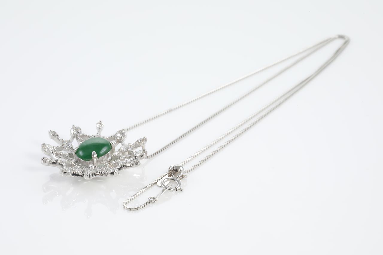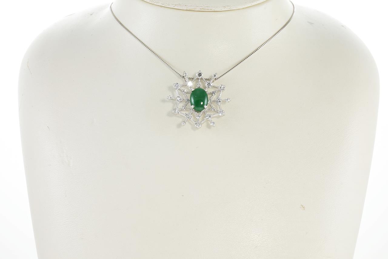 Jade and Diamond pendant with oval cabochon cut transluscent green natural Jadeite Jade of 2.18ct (with GEM Identification report #UBC5182) and Diamonds totalling 1.37cts (Estimated grading: G-H VS-SI). 18ct white gold with 18ct gold adjustable 45cm chain. Weight: 6.9g. (Pre-Owned)