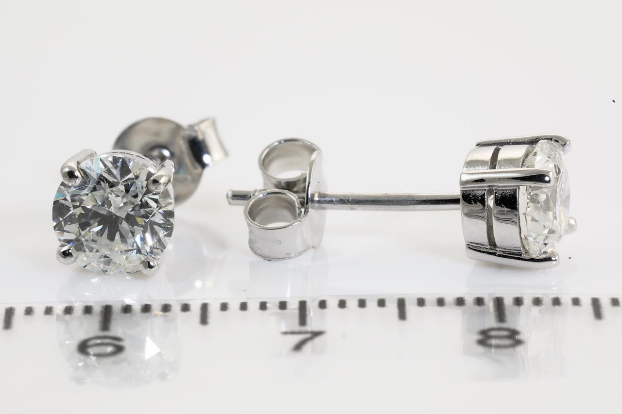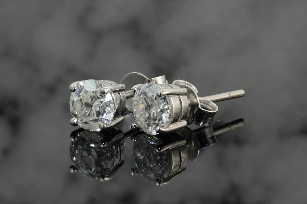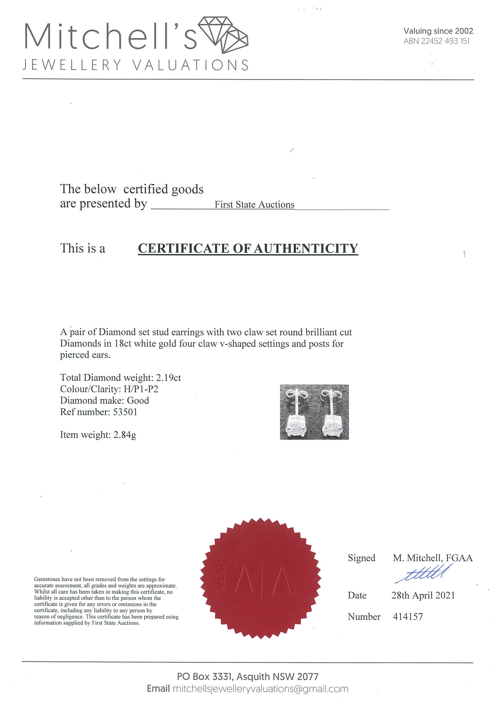 Diamond stud earrings with 2 round brilliant cut Diamonds totalling 2.19cts (Estimated grading: H P1-P2). 18ct white gold. Weight: 2.8g. With Certificate #414157. (New).