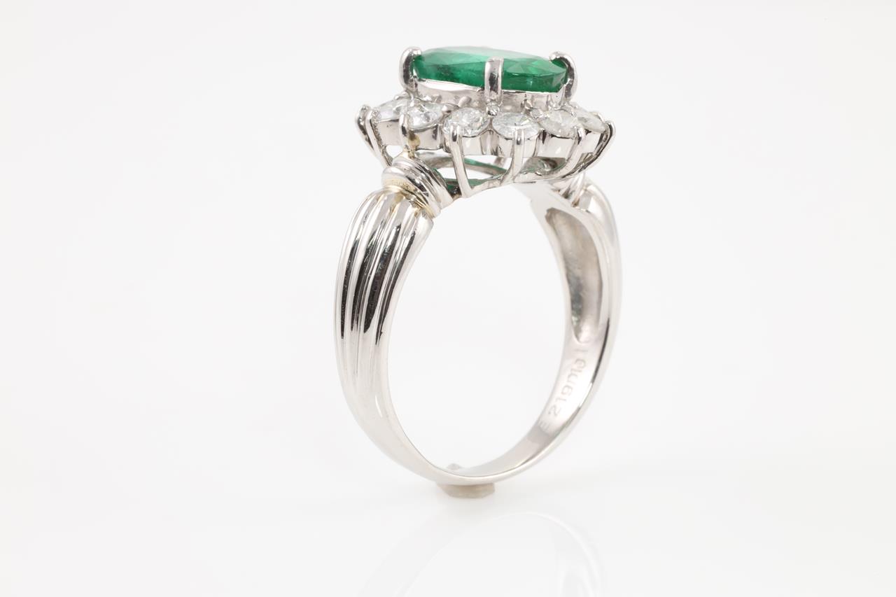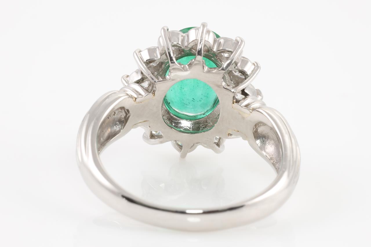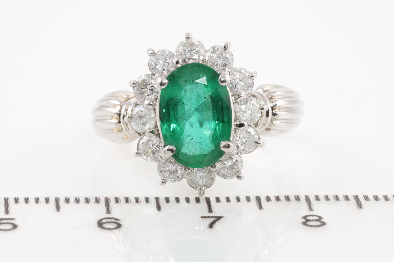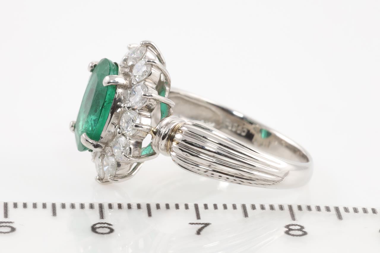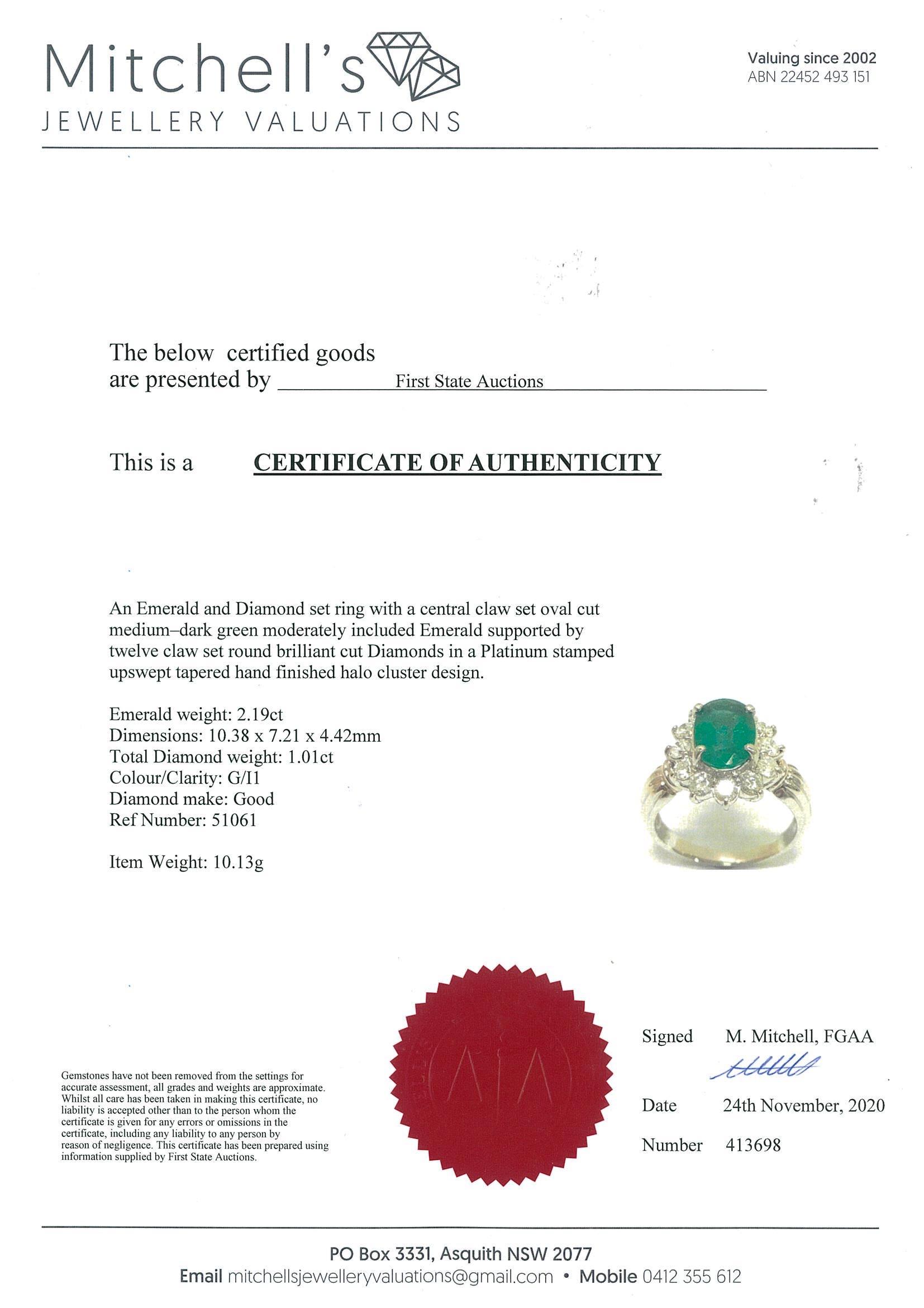 Emerald and Diamond ring with oval shape Emerald of 2.19ct and Diamonds totalling 1.01cts (Estimated grading: G P1). Platinum. Ring size: P - Ring resizing is not recommended. With Certificate #413698. Weight: 10.13g (Pre-owned)