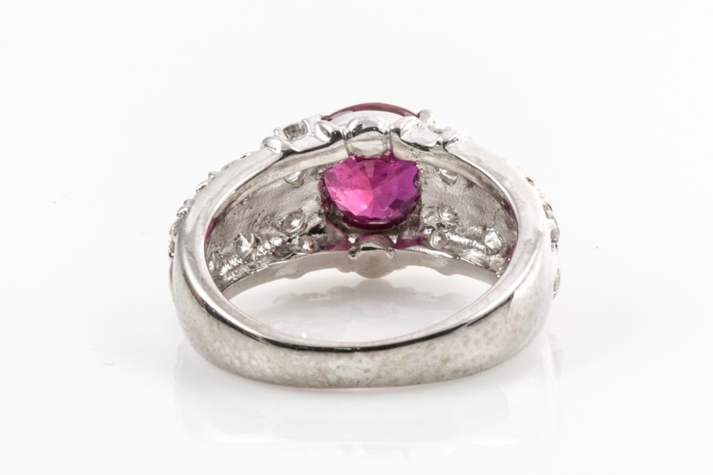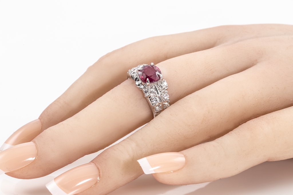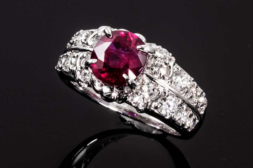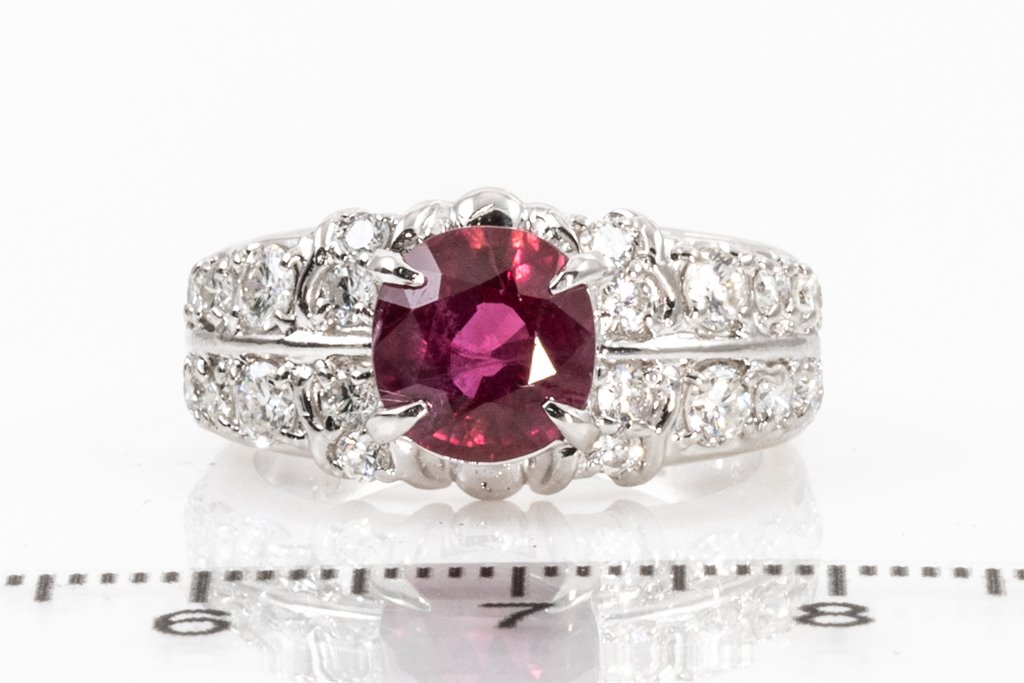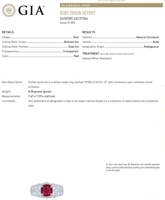 Ruby and Diamond ring with an oval shape Ruby of 2.19ct (with GIA report #6341377864 listing country of origin as Madagascar) round and Diamonds totalling 1.10cts (Estimated grading: F SI). Platinum. Ring size K. Weigth: 9g (Pre-owned)