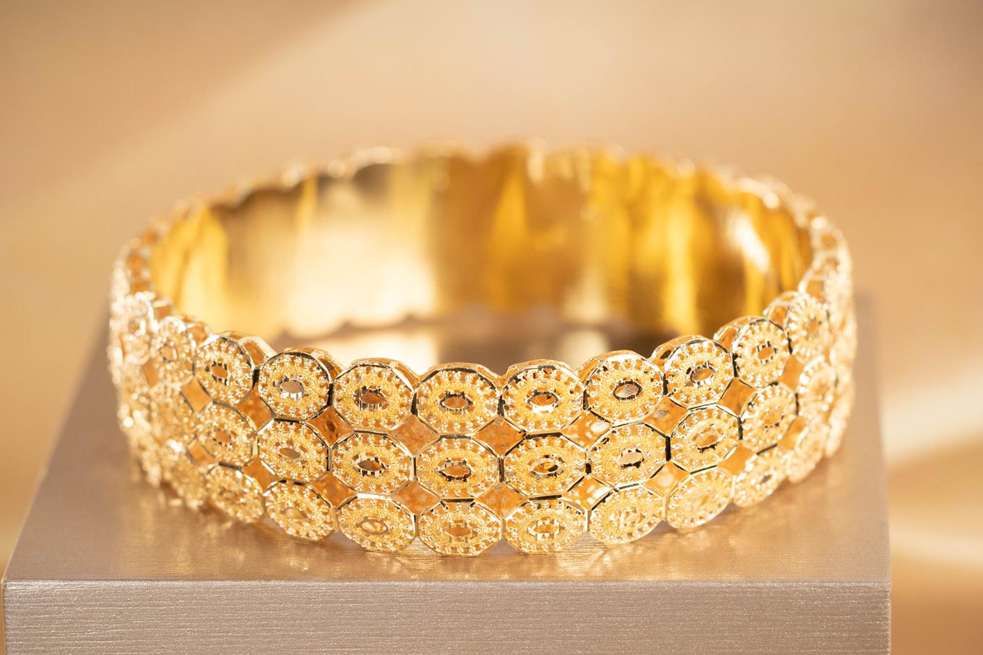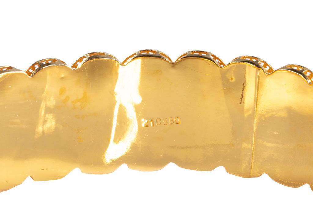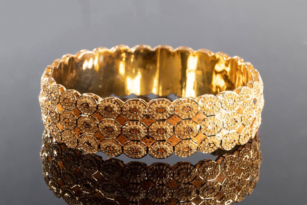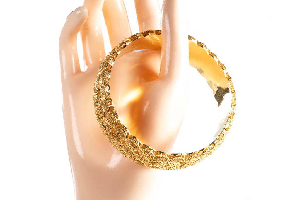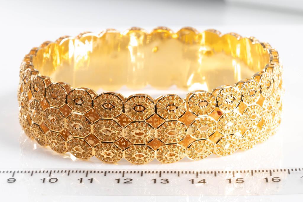 Gold Bangle, 21ct yellow gold. Diameter 7cm. Width 2cm. Circumference 21cm. Weight 30g. (Pre-owned)