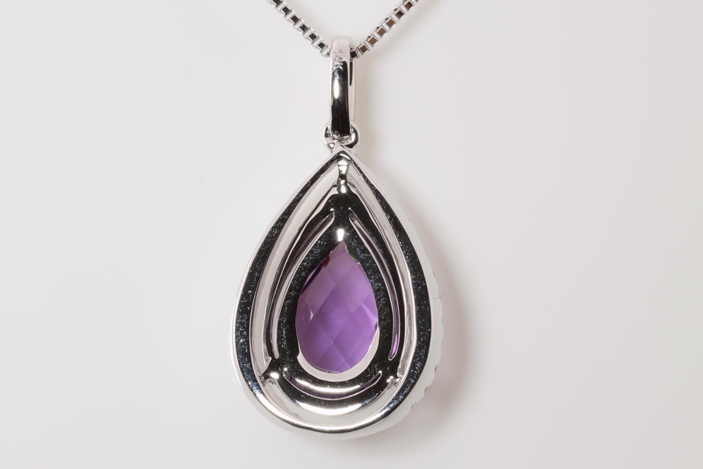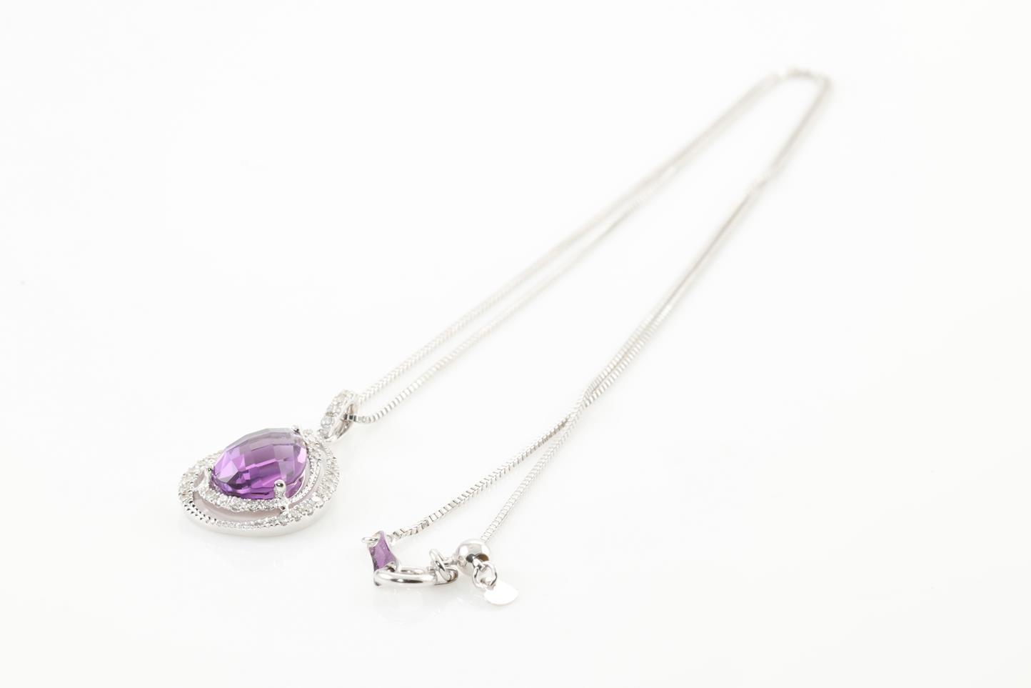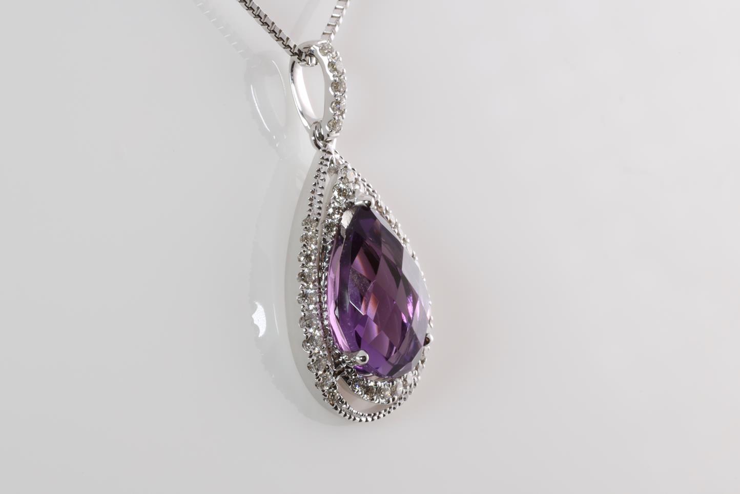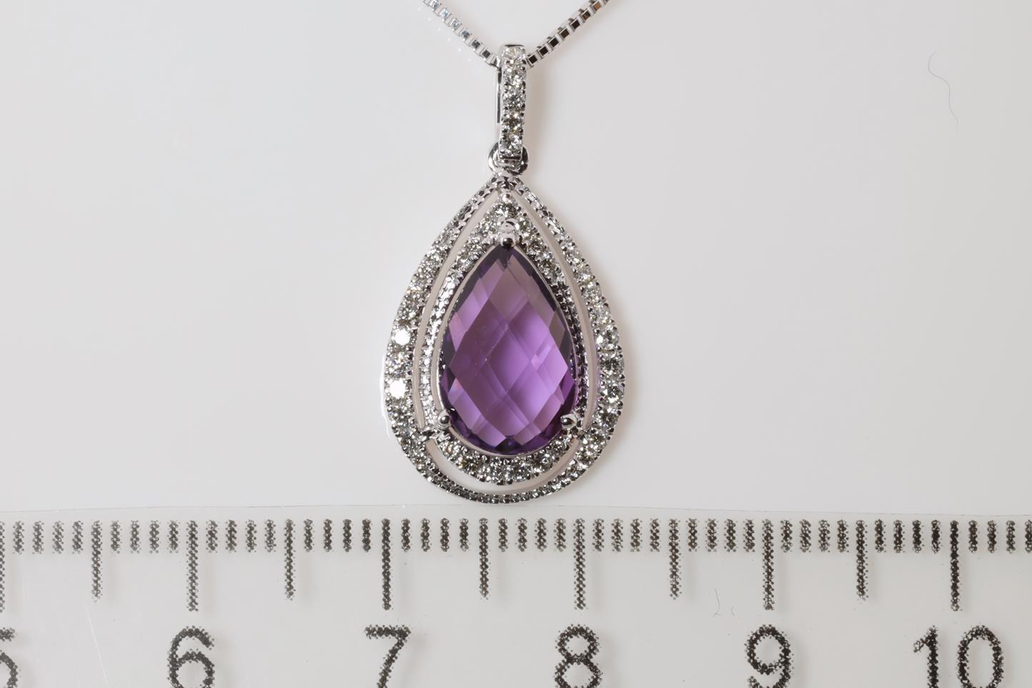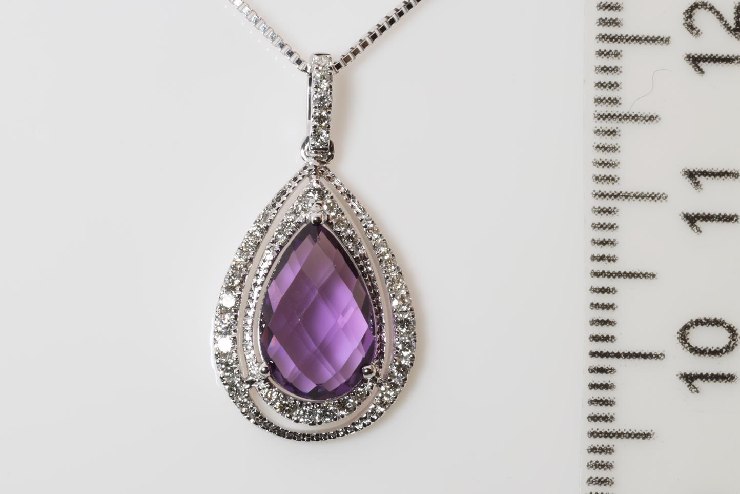 Amethyst and Diamond pendant with pear shape Amethyst of 2.20ct and Diamonds totalling 0.25cts (Estimated grading: H SI). 14ct white gold with 18ct white gold adjustable 45cm chain. Weight: 5.6g (New)
