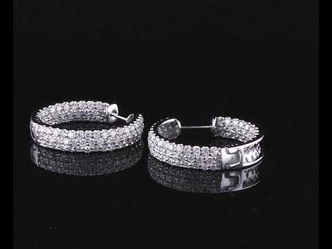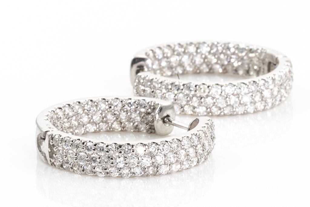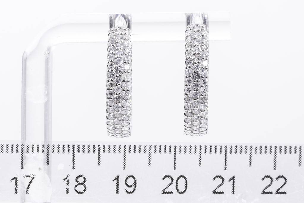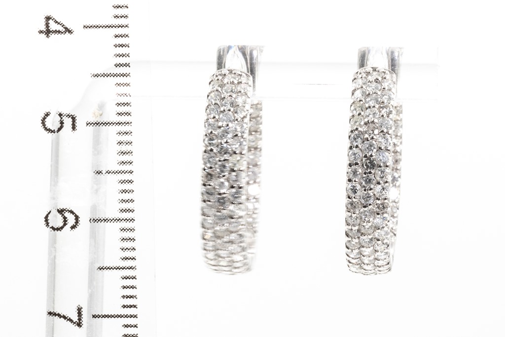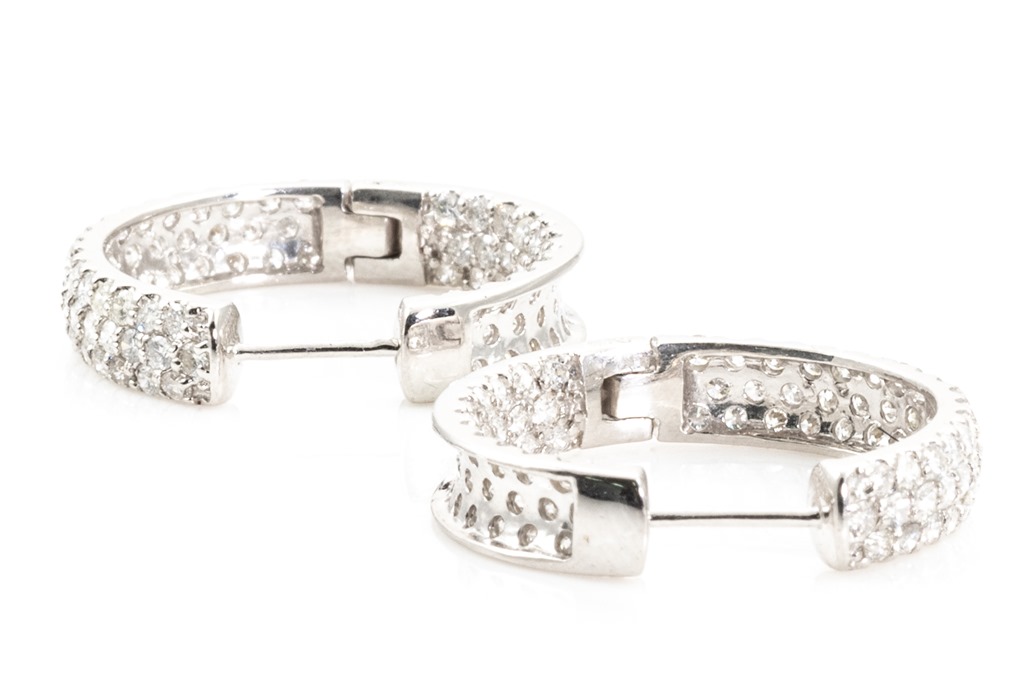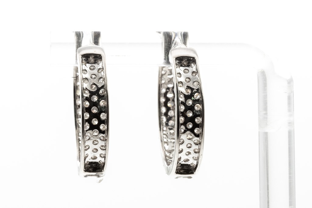 1840/ 97: Diamond hoop earrings, inside-out set with round Diamonds totalling 2.20cts (Estimated grading: G P1-3). Diamonds are set on the front outide and back of hoop diamonds are set inside. 18ct white gold. Weight: 7.6g. (Pre-owned)