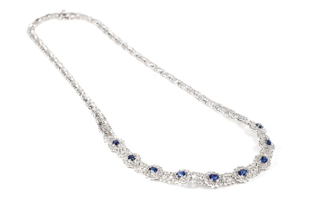 Sapphire and Diamond necklace with oval shape blue Sapphire totalling 2.20cts and round Diamonds totalling 1.70cts (Estimated grading: H-I SI). 18ct white gold. Length: 41cm. Weight: 20.1g. With Certificate #416052. (Pre-owned)