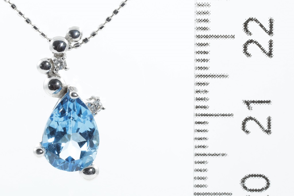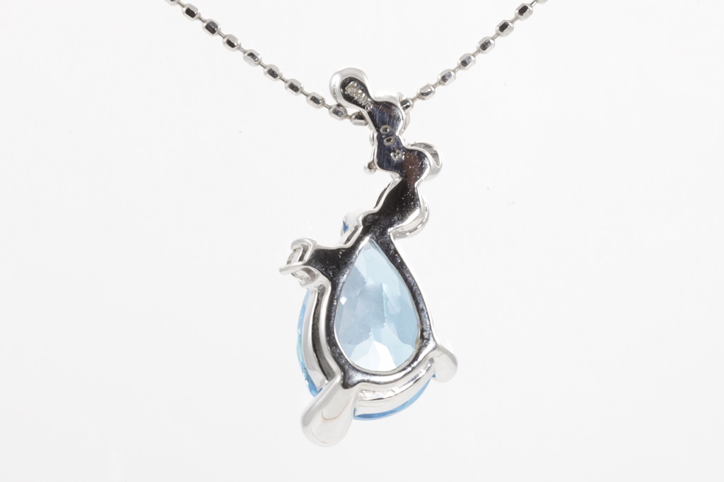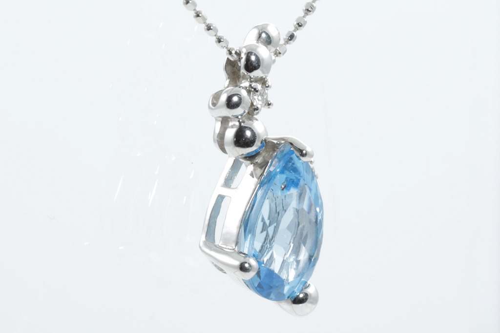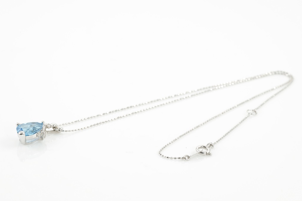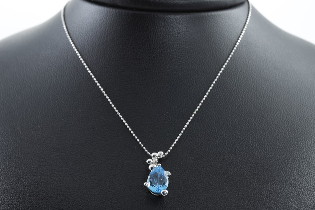 Topaz and Diamond pendant with centre pear shape Topaz of approximately 2.20cts (note minor surafce wear) and Diamonds totalling 0.03cts. 14ct white gold with adjustable 40cm chain. Weight: 3.0g. (Pre-owned)