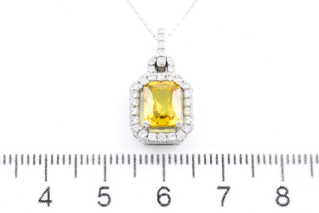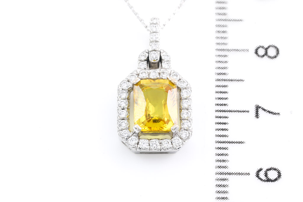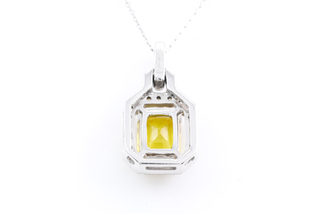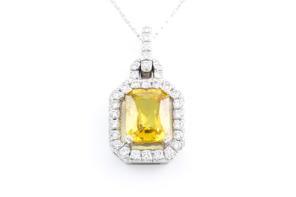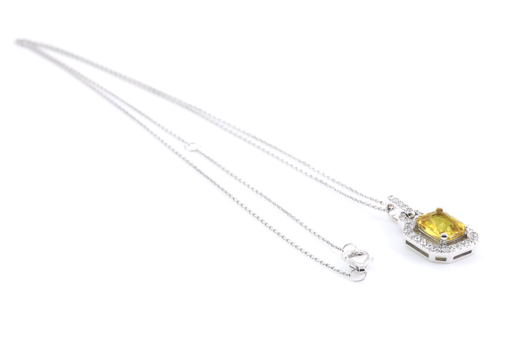Sapphire and Diamond pendant with radiant cut yellow Sapphire of 2.20ct and round Diamonds totalling 0.34cts (Estimated grading: H SI). 18ct white gold with 18ct white gold 48cm adjustable chain. Weight: 4.8g (Pre-owned)