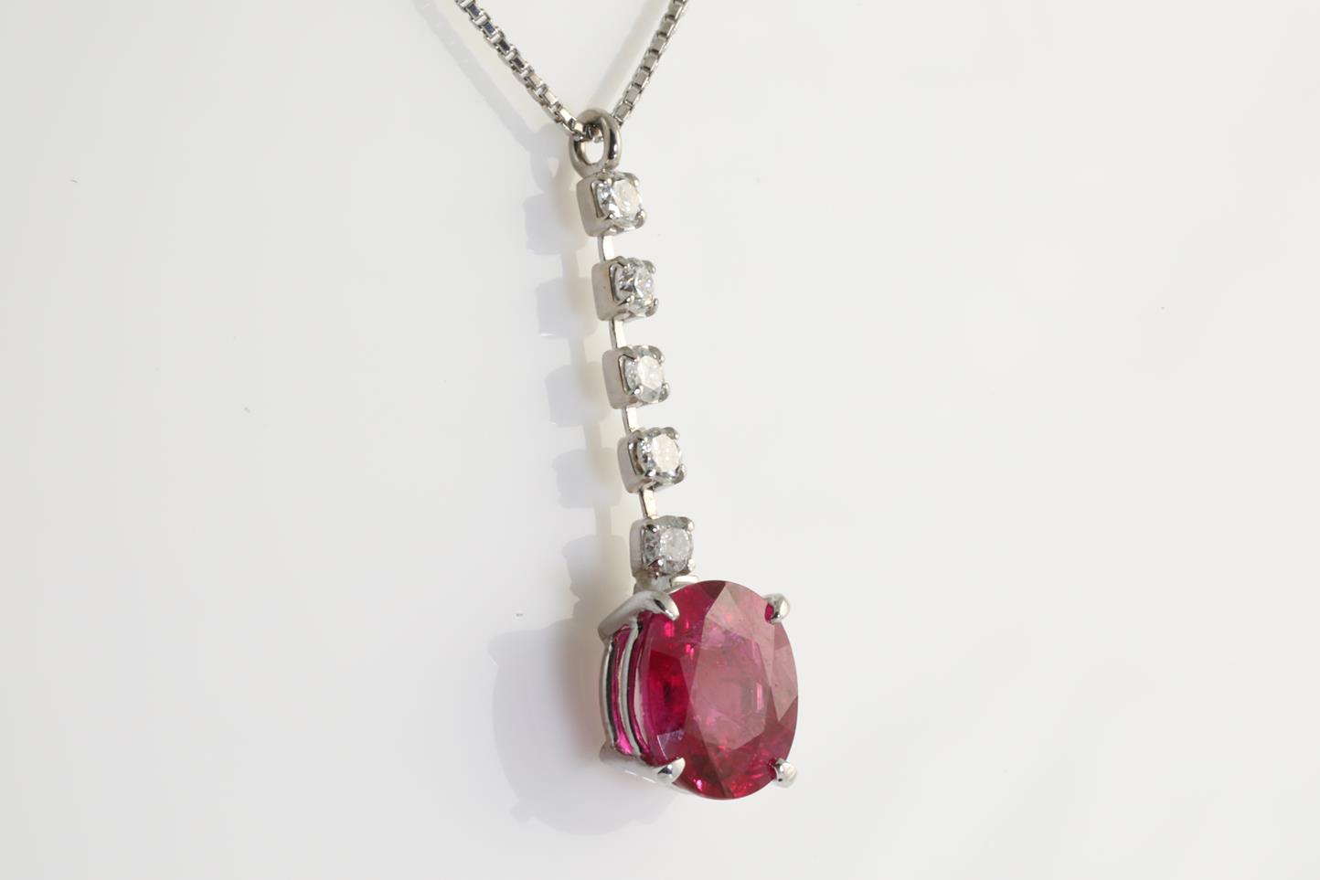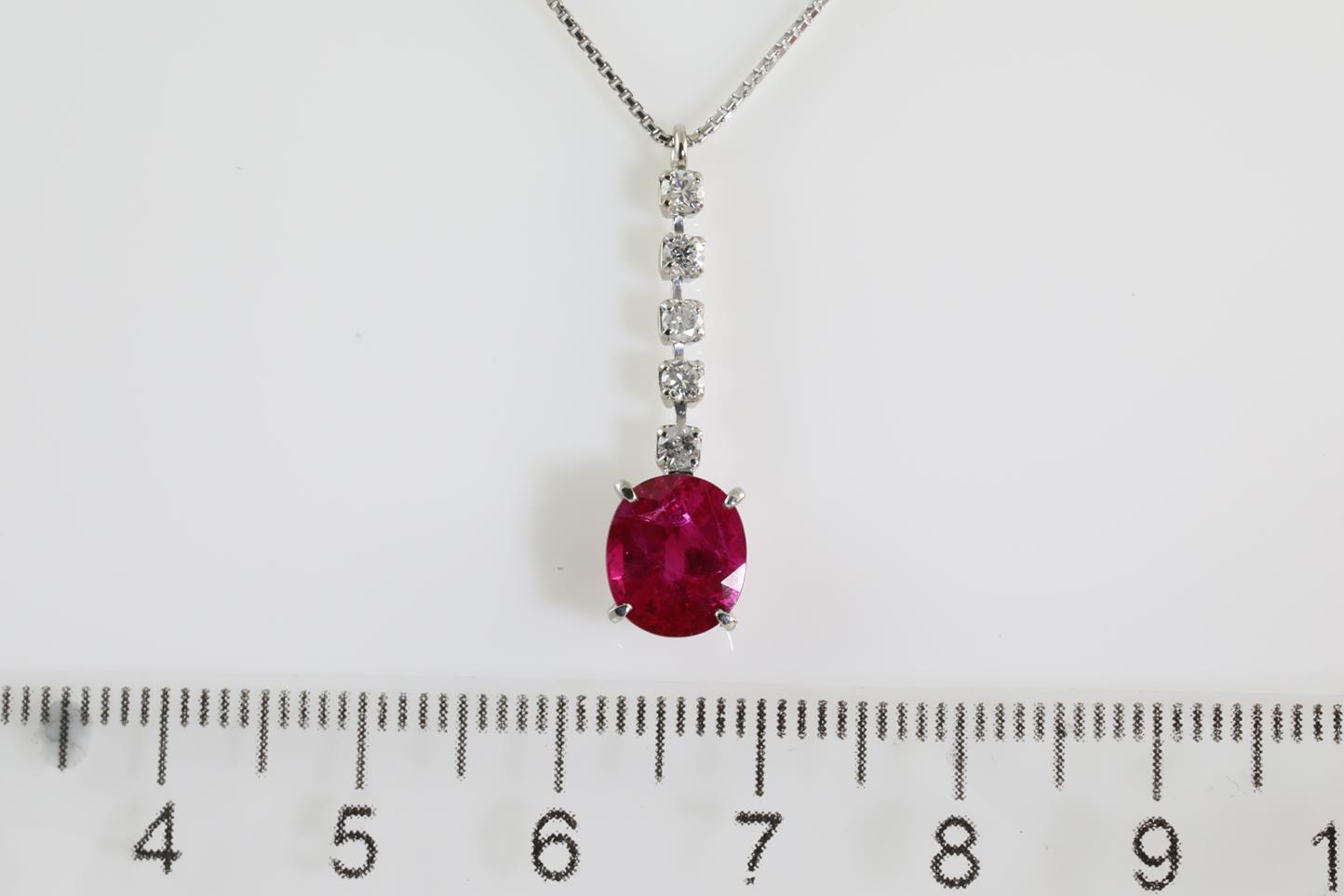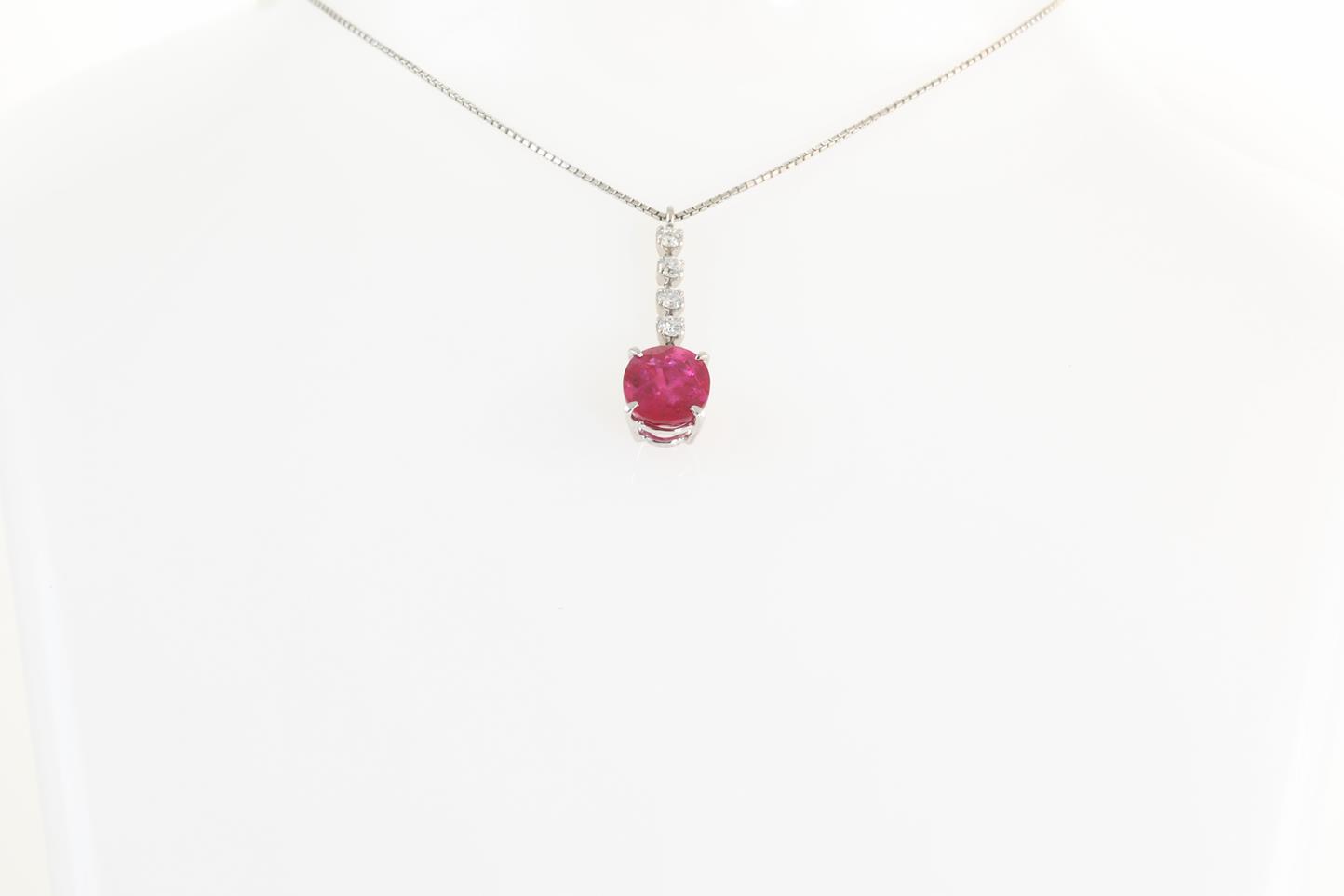 Ruby and Diamond drop pendant with round Ruby of 2.21ct and round Diamonds totalling 0.20cts (Estimated grading: H I1). 18ct white gold with a platinum adjustable 45cm chain. Weight: 3.9g. With certificate #413852. (Pre-owned)