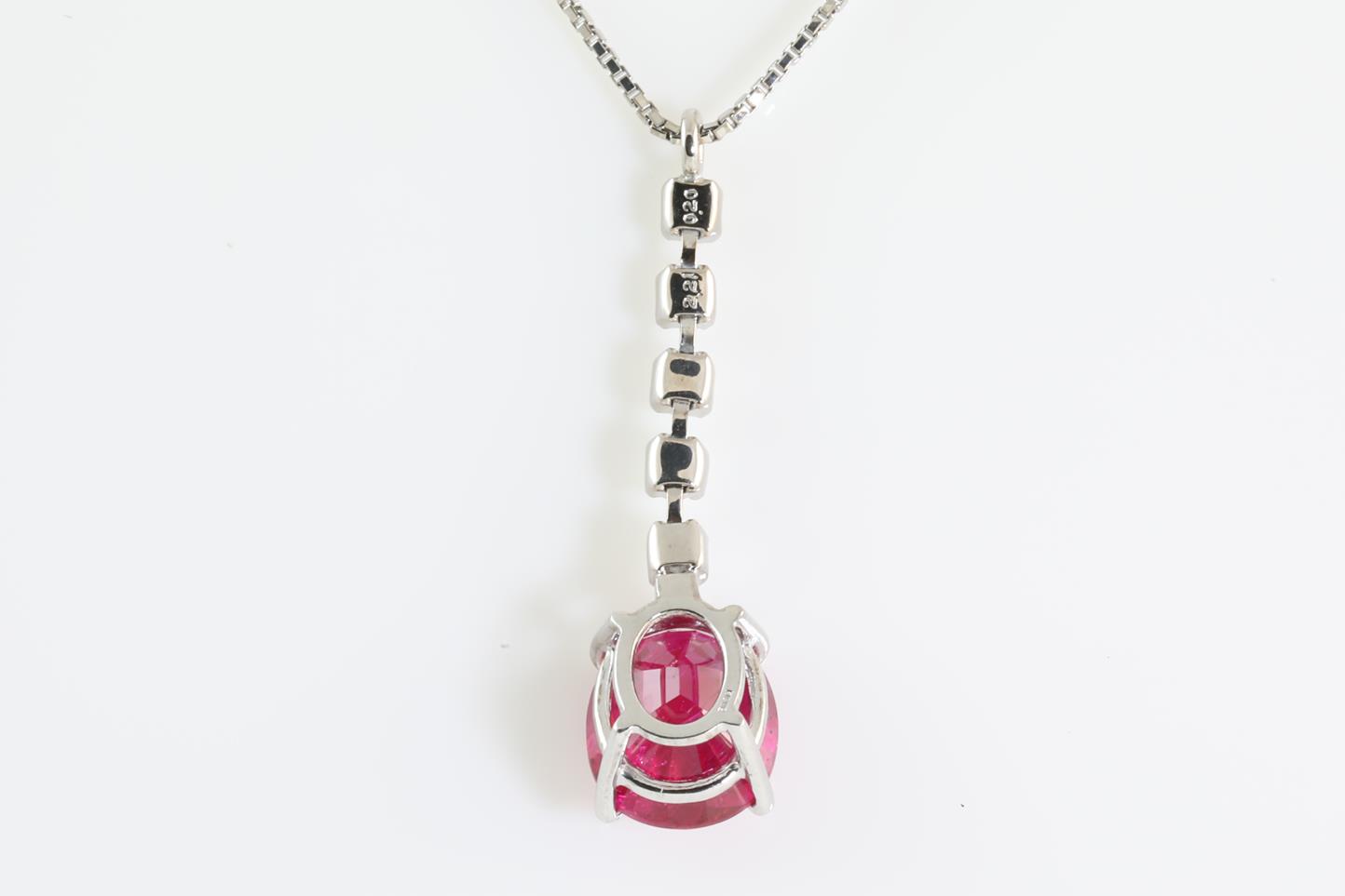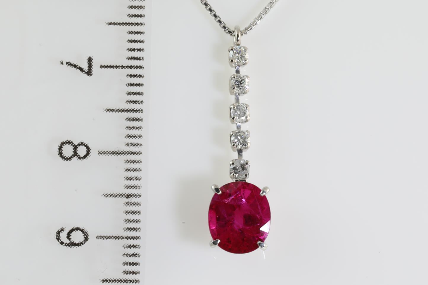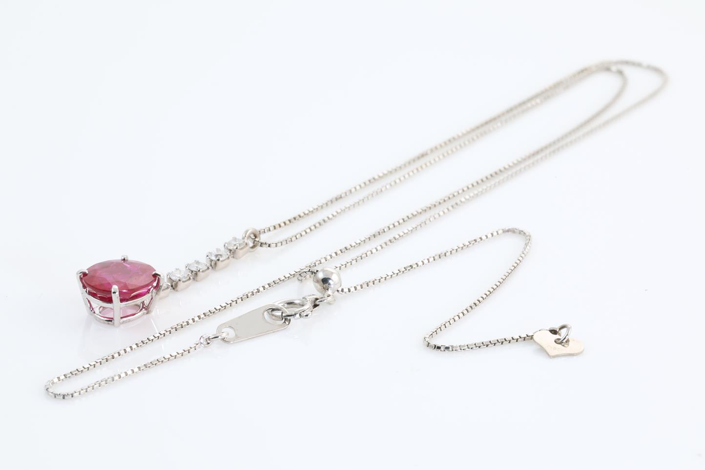 Ruby and Diamond drop pendant with round Ruby of 2.21ct and round Diamonds totalling 0.20cts (Estimated grading: H I1). 18ct white gold with a platinum adjustable 45cm chain. Weight: 3.9g. With certificate #413852. (Pre-owned)